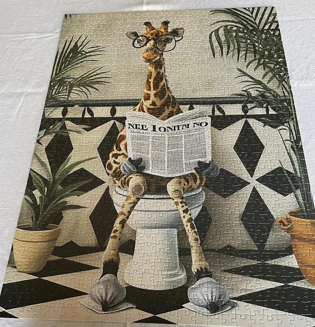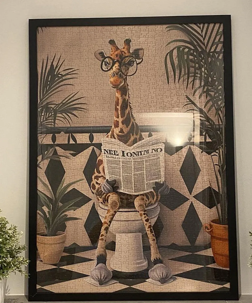 Bring a smile to your face with this quirky giraffe reading a newspaper on a toilet. With 1000 pieces, this playful and amusing scene adds humor and fun as you piece it together. Perfect for puzzle enthusiasts or as a unique decor piece for your home.