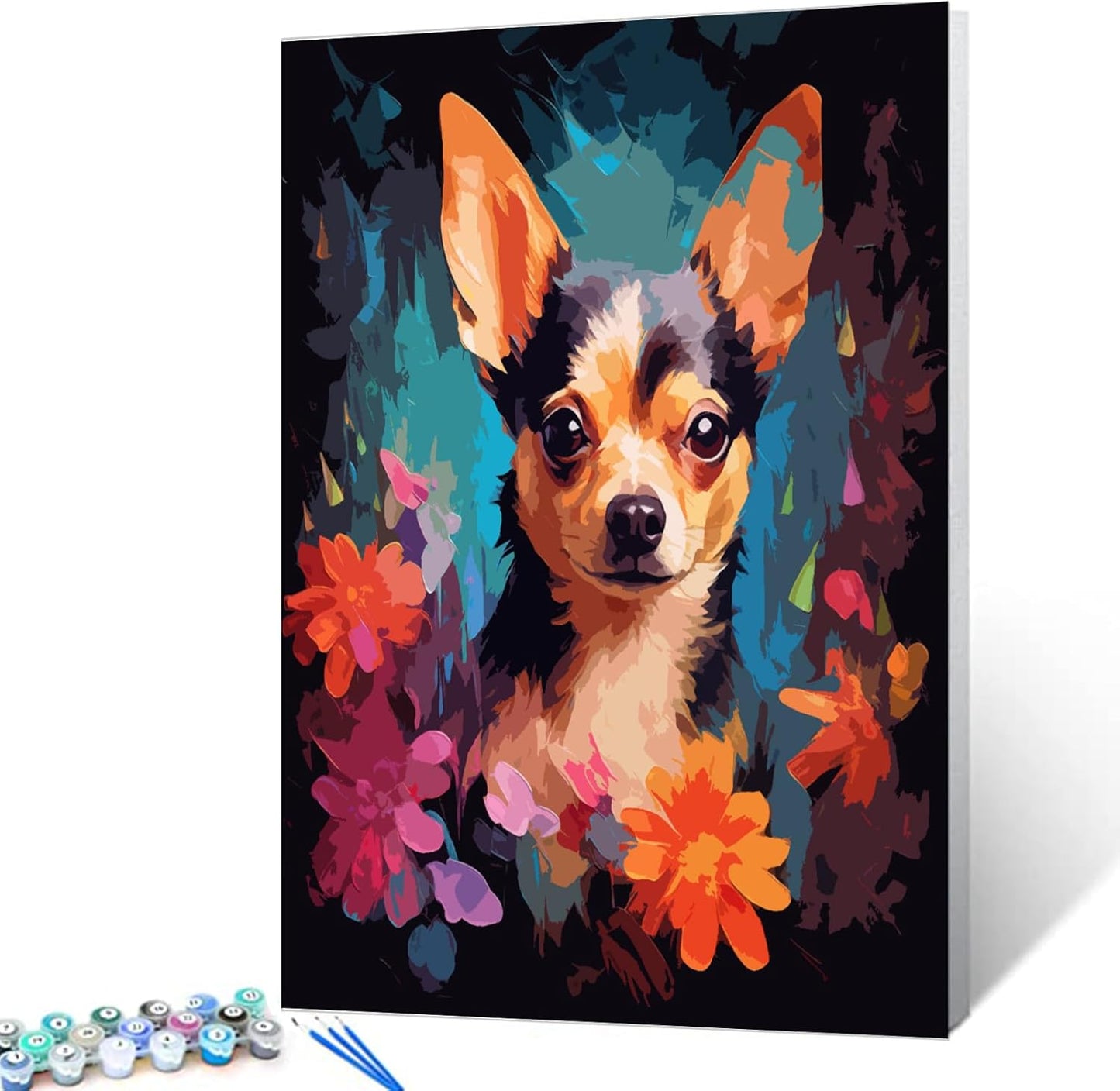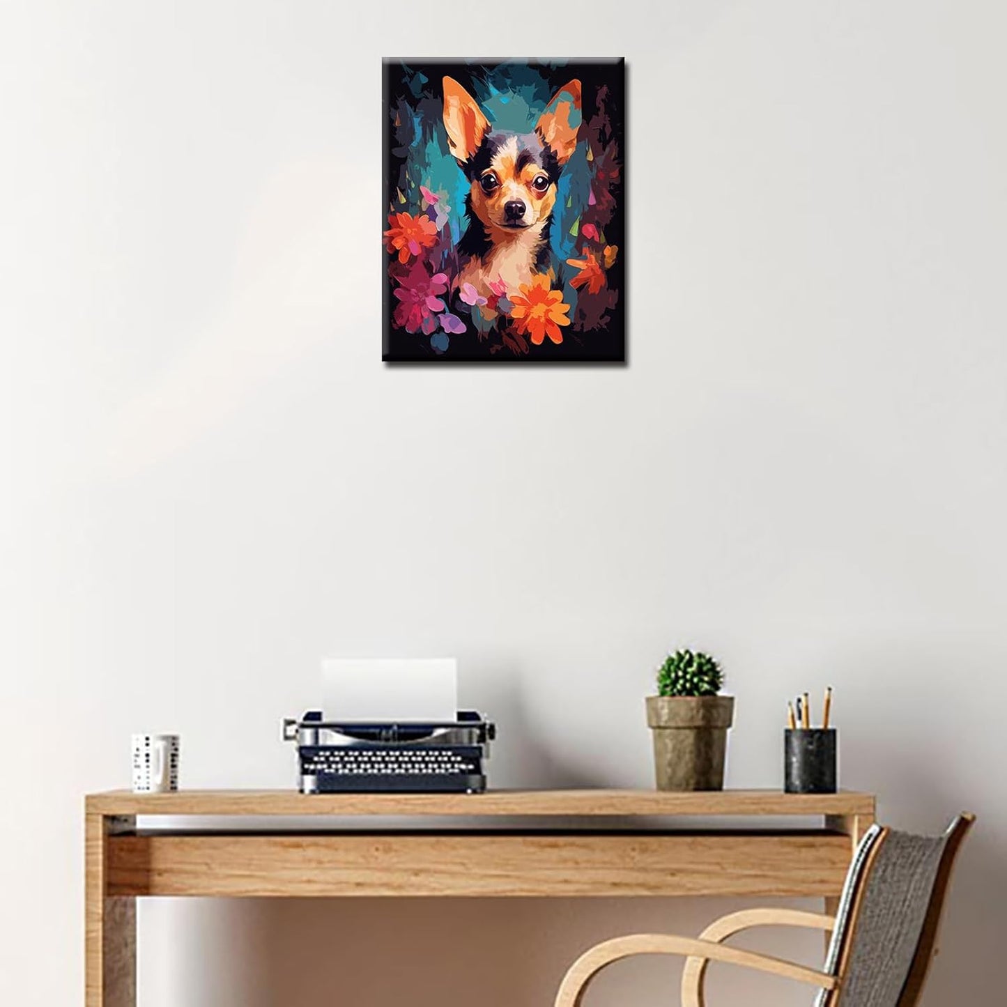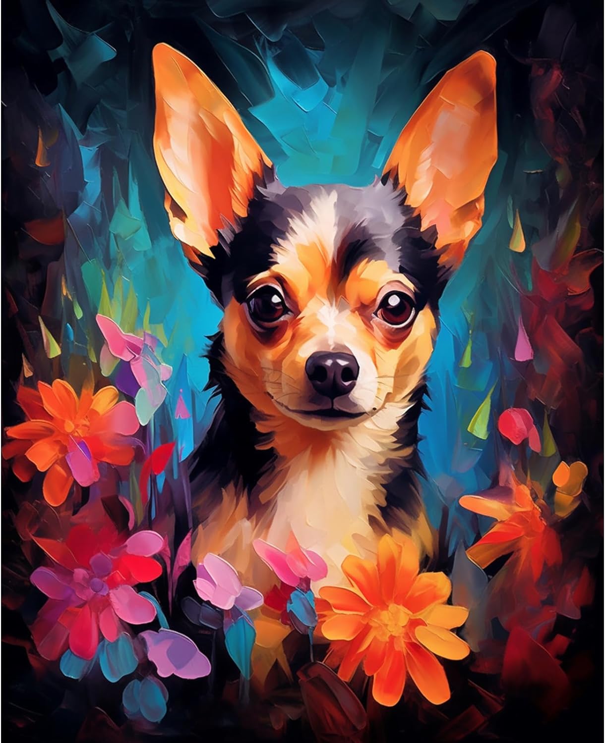 Abstrakter Chihuahua zwischen Blumen Malen nach Zahlen