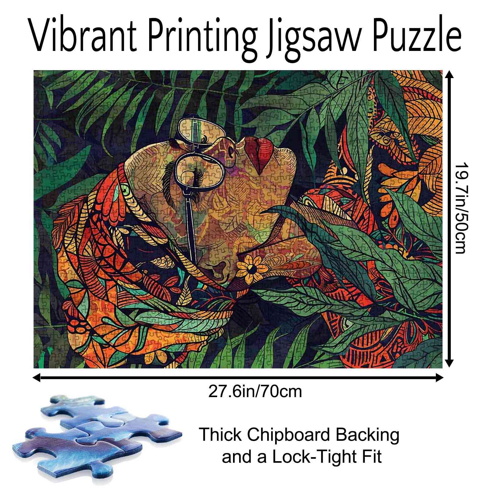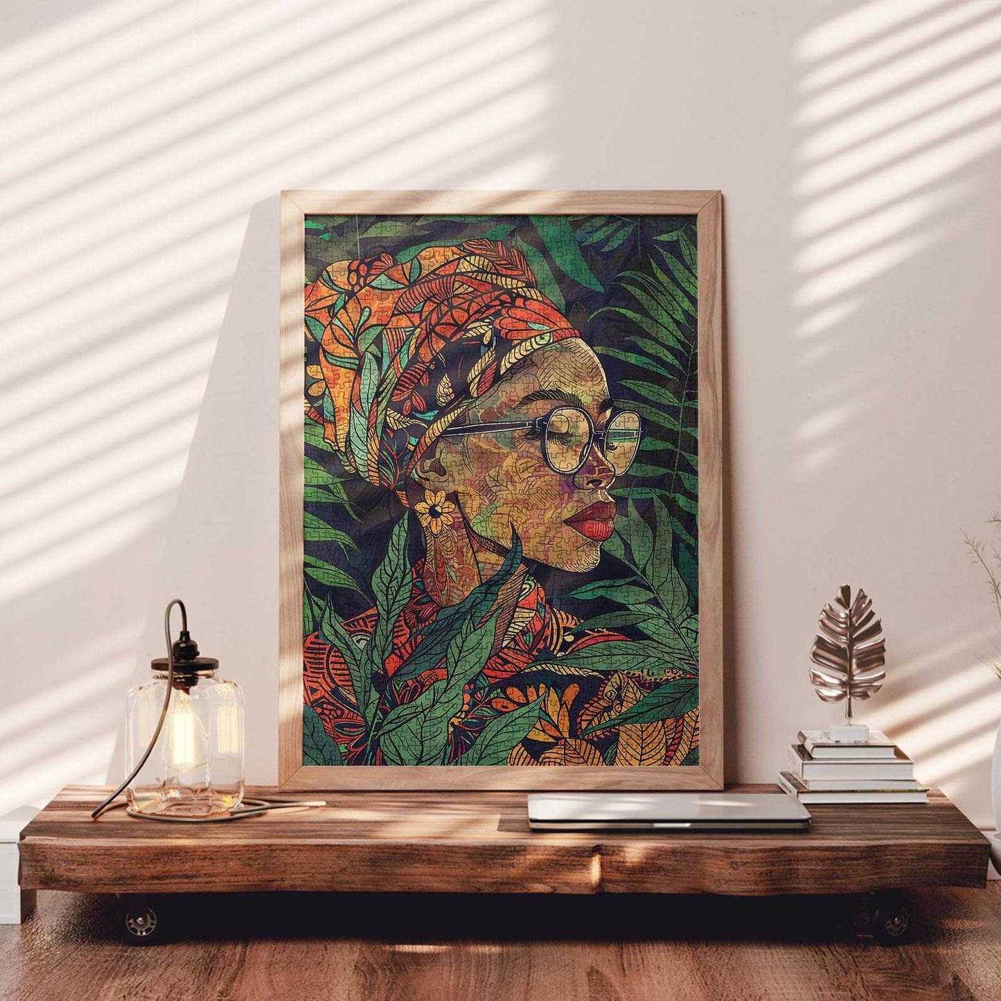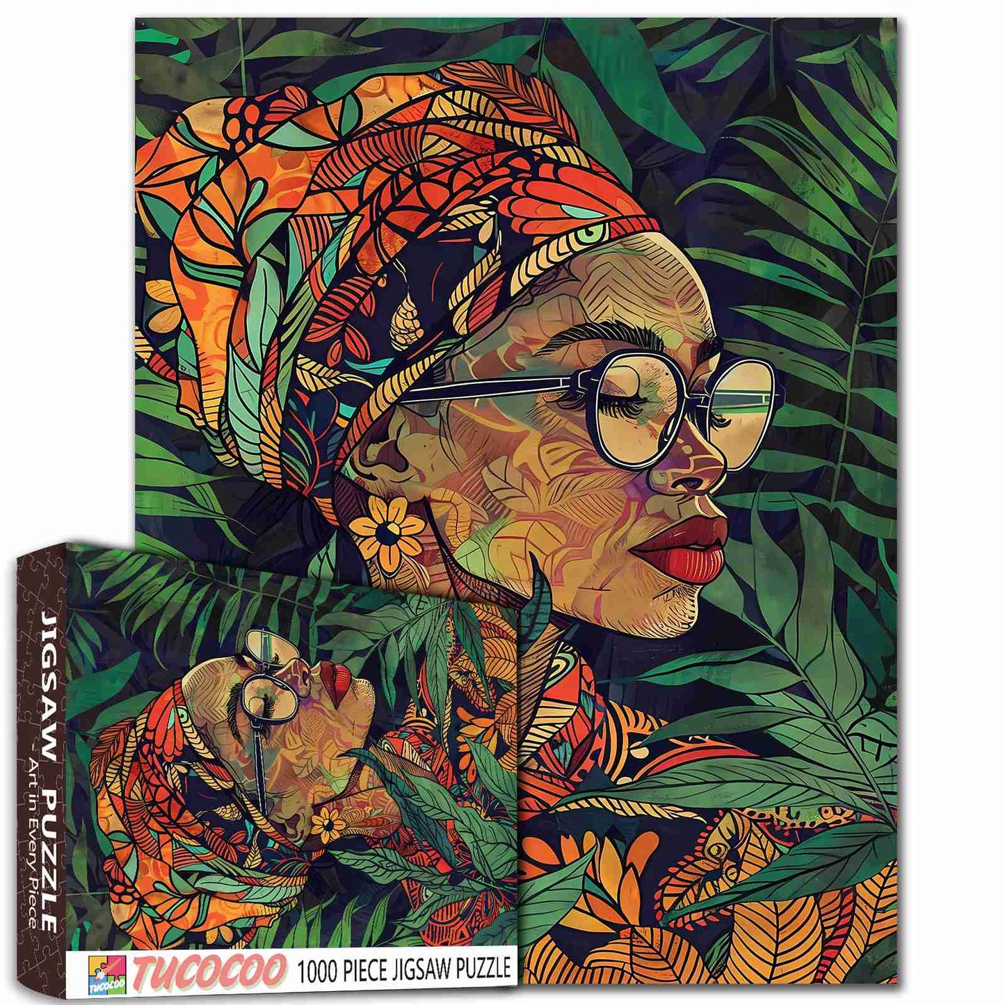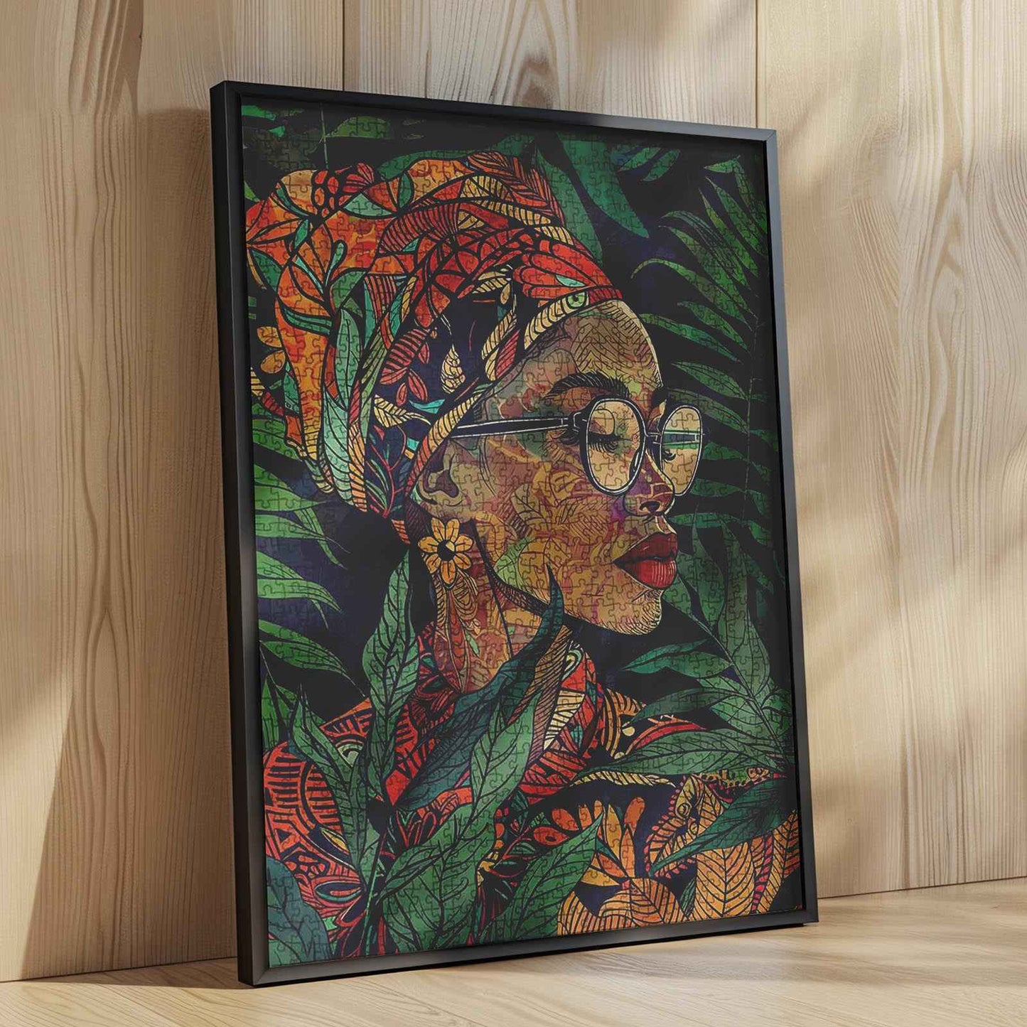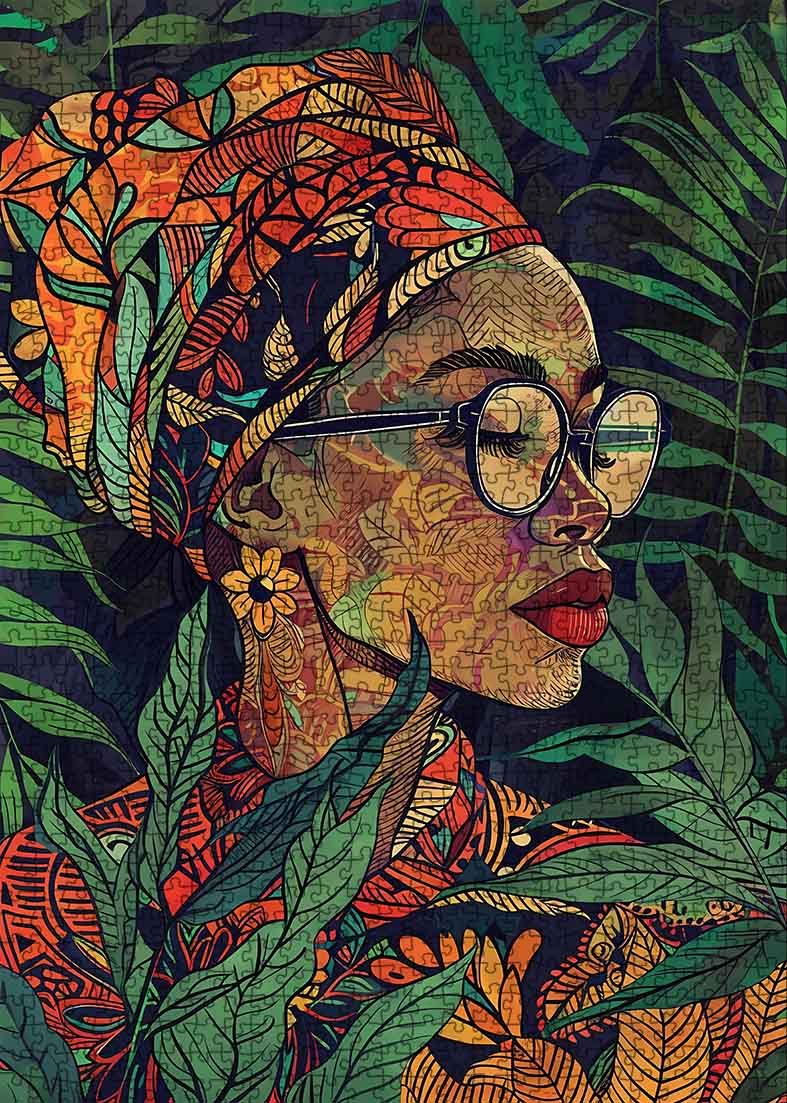 Dieses atemberaubende Puzzle zeigt eine elegante afrikanische Frau mit auffälliger Brille und einem farbenfroh gemusterten Kopftuch, umgeben von üppigen botanischen Blättern. Die komplizierten Details ihres Gesichts, die farbenfrohen Muster ihrer Kleidung und das tiefe Grün des Laubes ergeben eine harmonische und künstlerische Komposition. Dieses Puzzle ist perfekt für Kunstliebhaber und Puzzle-Liebhaber und fängt die Essenz kultureller Schönheit und natürlicher Eleganz ein und bietet eine einzigartige und befriedigende Herausforderung.