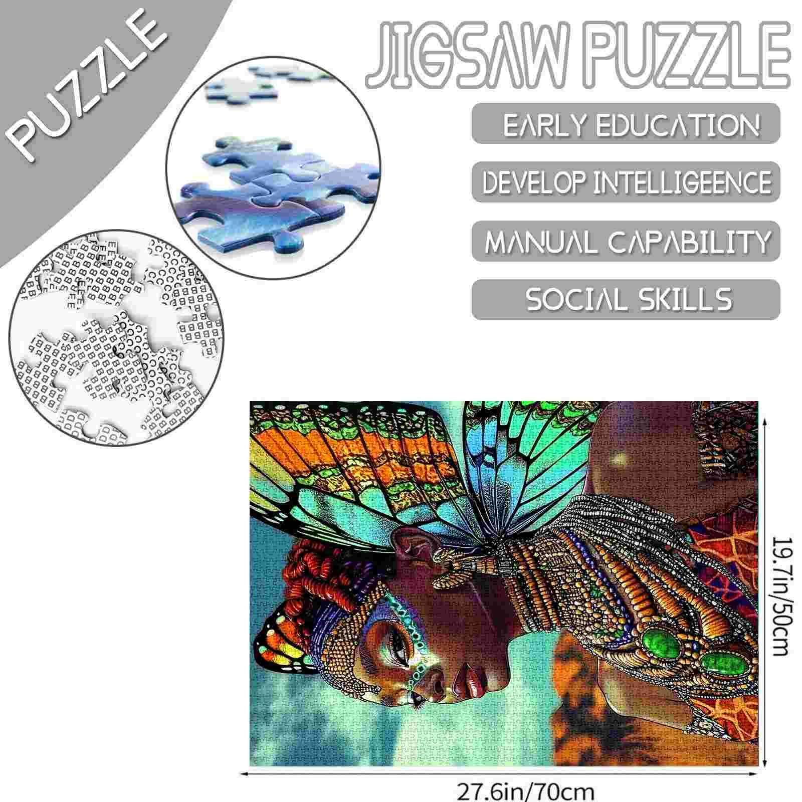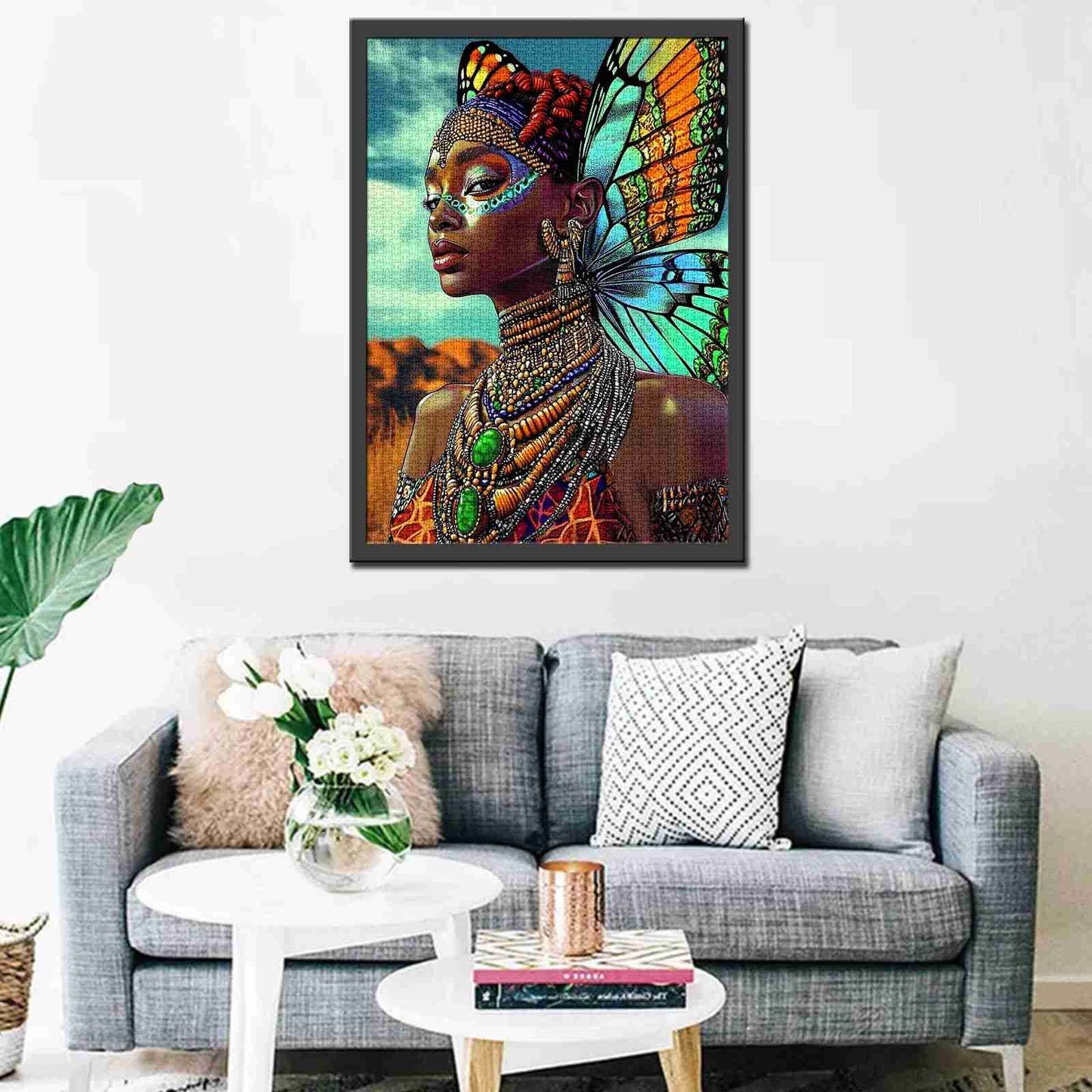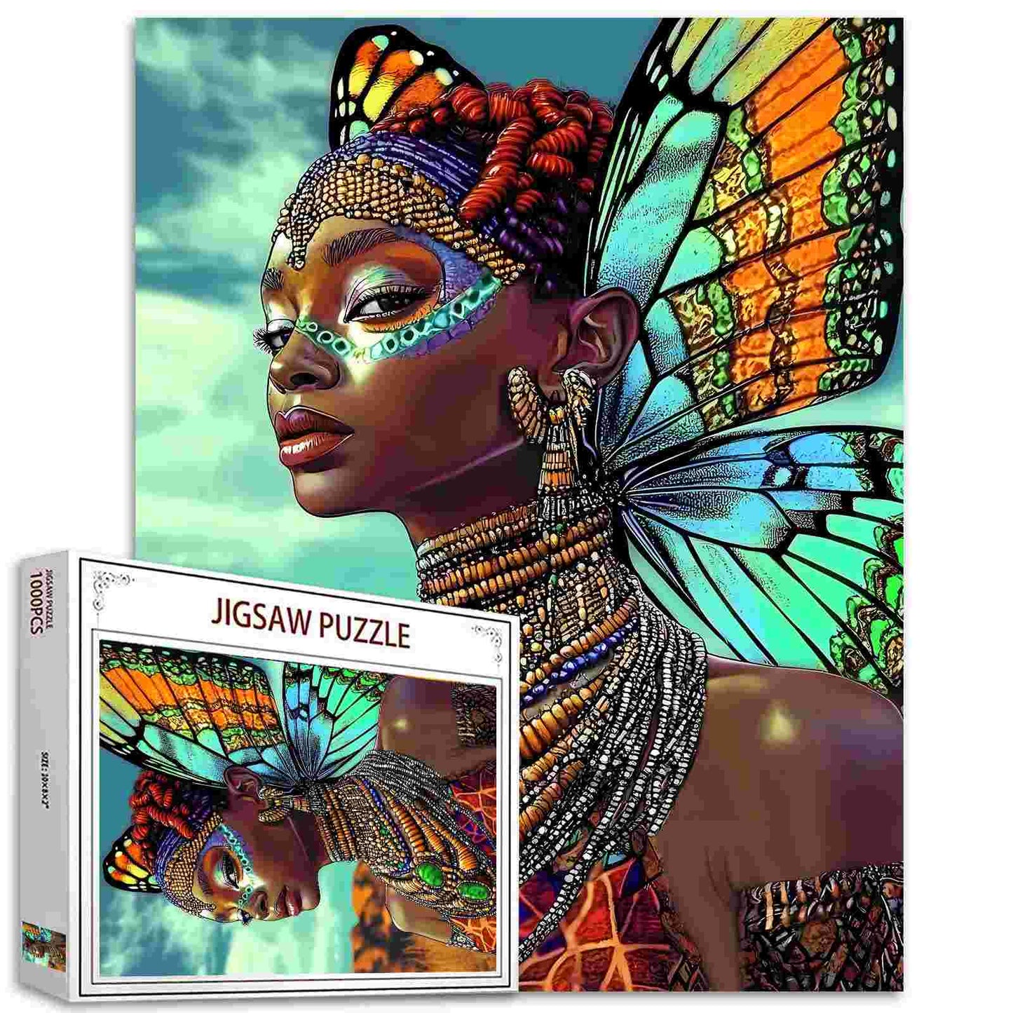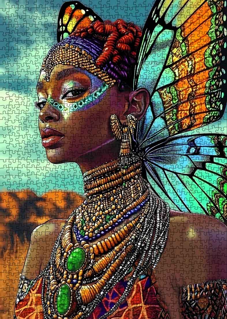Ein faszinierendes Porträt einer majestätischen Afrikanerin mit leuchtenden Schmetterlingsflügeln, geschmückt mit edlem Stammesschmuck und leuchtender Gesichtsbemalung. Dieses Puzzle zelebriert kulturellen Stolz, weibliche Kraft und mythische Schönheit. Ein atemberaubendes und kraftvolles Stück für Puzzle-Fans und Kunstliebhaber.