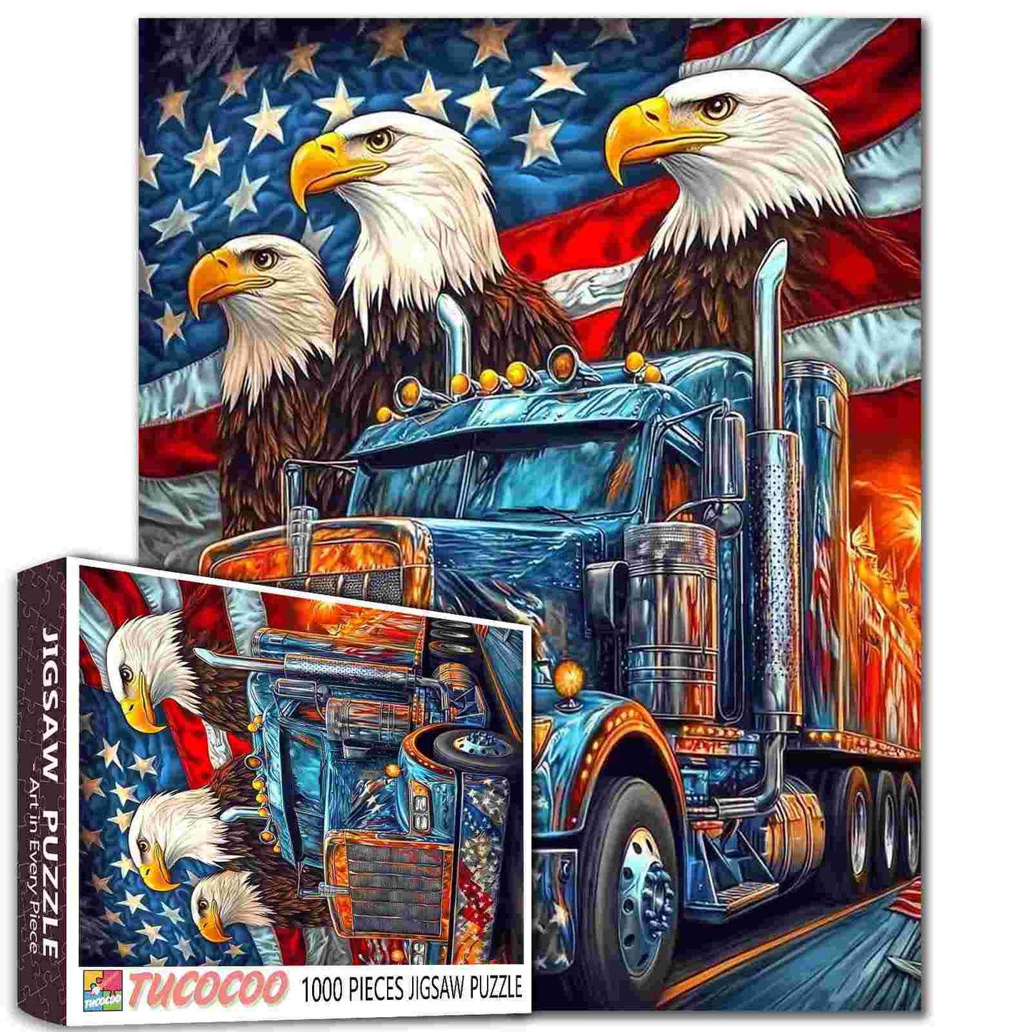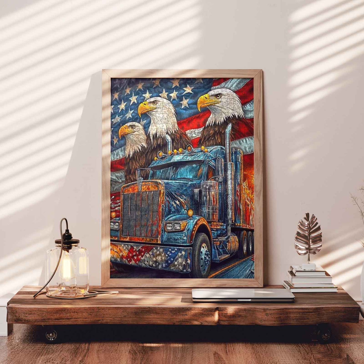 Ein kraftvoller Sattelschlepper braust heran, geschmückt mit Sternen und Streifen, die den Mut und den Stolz der offenen Straße widerspiegeln. Dahinter ragen drei Weißkopfseeadler vor einer wehenden amerikanischen Flagge empor – Symbole für Stärke, Freiheit und furchtlosen Antrieb. Flammen und Chrom verleihen dem Ganzen eine intensive Note und verbinden patriotischen Stolz mit roher Pferdestärke. Jedes Puzzleteil fängt den Geist amerikanischer Widerstandsfähigkeit ein, egal ob Sie klassische Trucks, mutiges Design oder das rot-weiß-blaue Erbe mögen. Eine wahre Hommage an das Land der Freien und die Heimat der Tapferen.