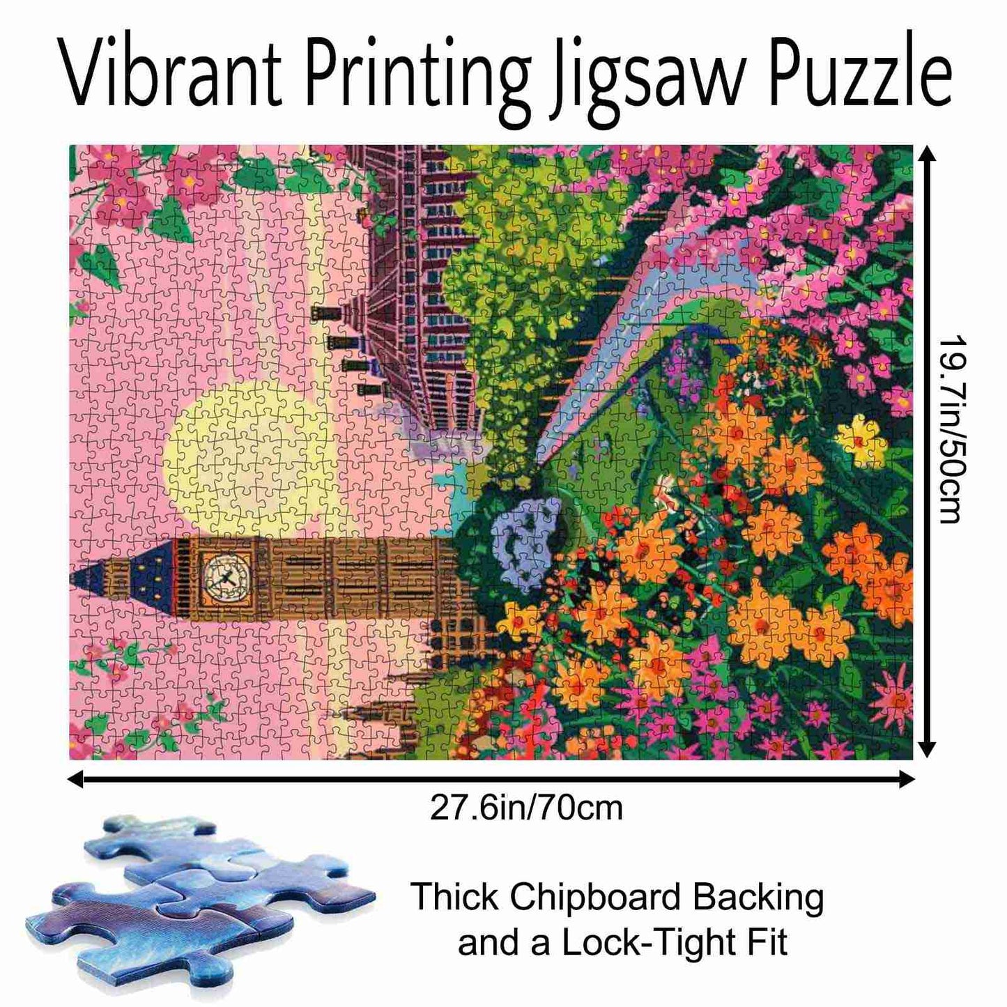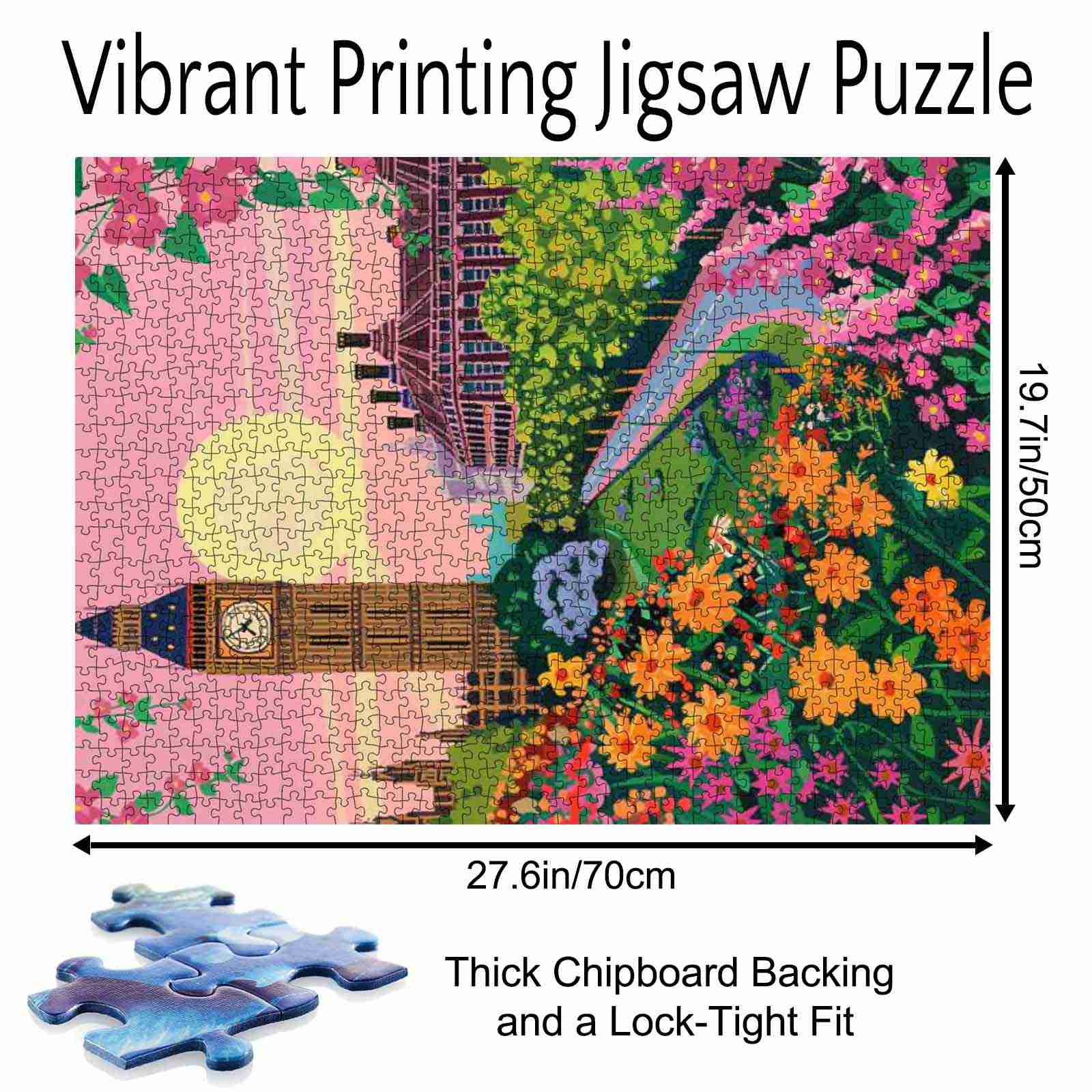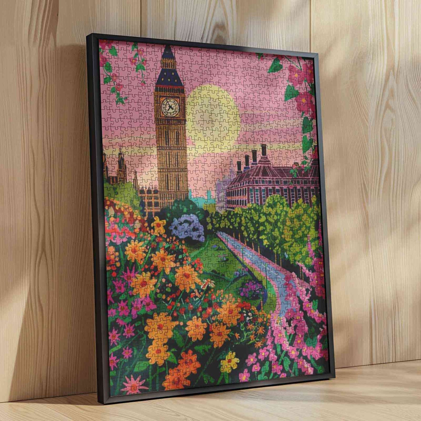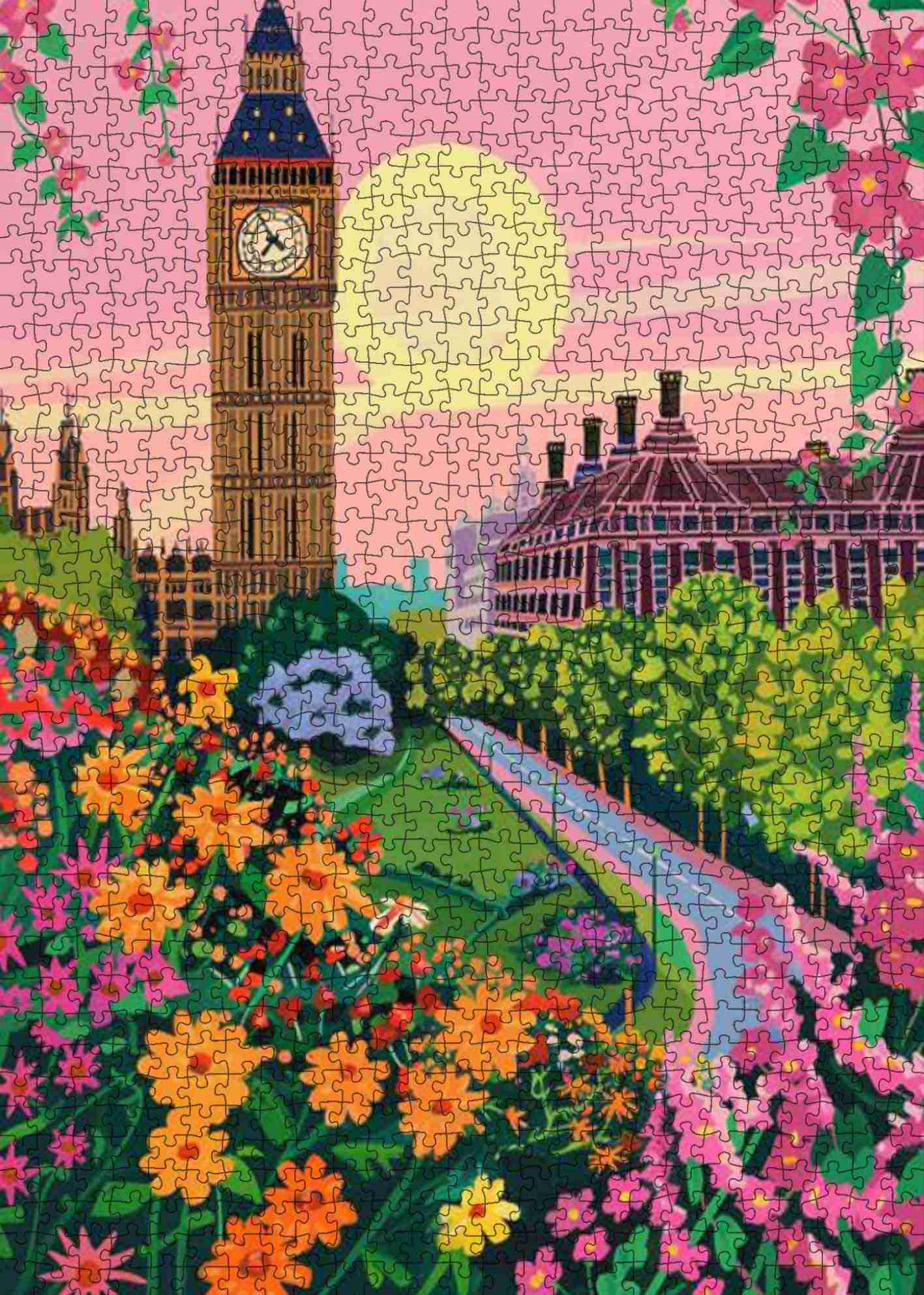 Wenn die Sonne über London untergeht, ragt Big Ben hoch in den rosa Himmel, umrahmt von blühenden Blumen und üppigen Gärten. Der gepflasterte Weg führt durch einen romantischen, malerischen Park zu ikonischer Stadtarchitektur. Mit jedem Puzzleteil entfaltet sich die goldene Stunde in detailreicher Pracht – und fängt den Zauber einer Stadt ein, in der Tradition auf die Schönheit der Natur trifft.