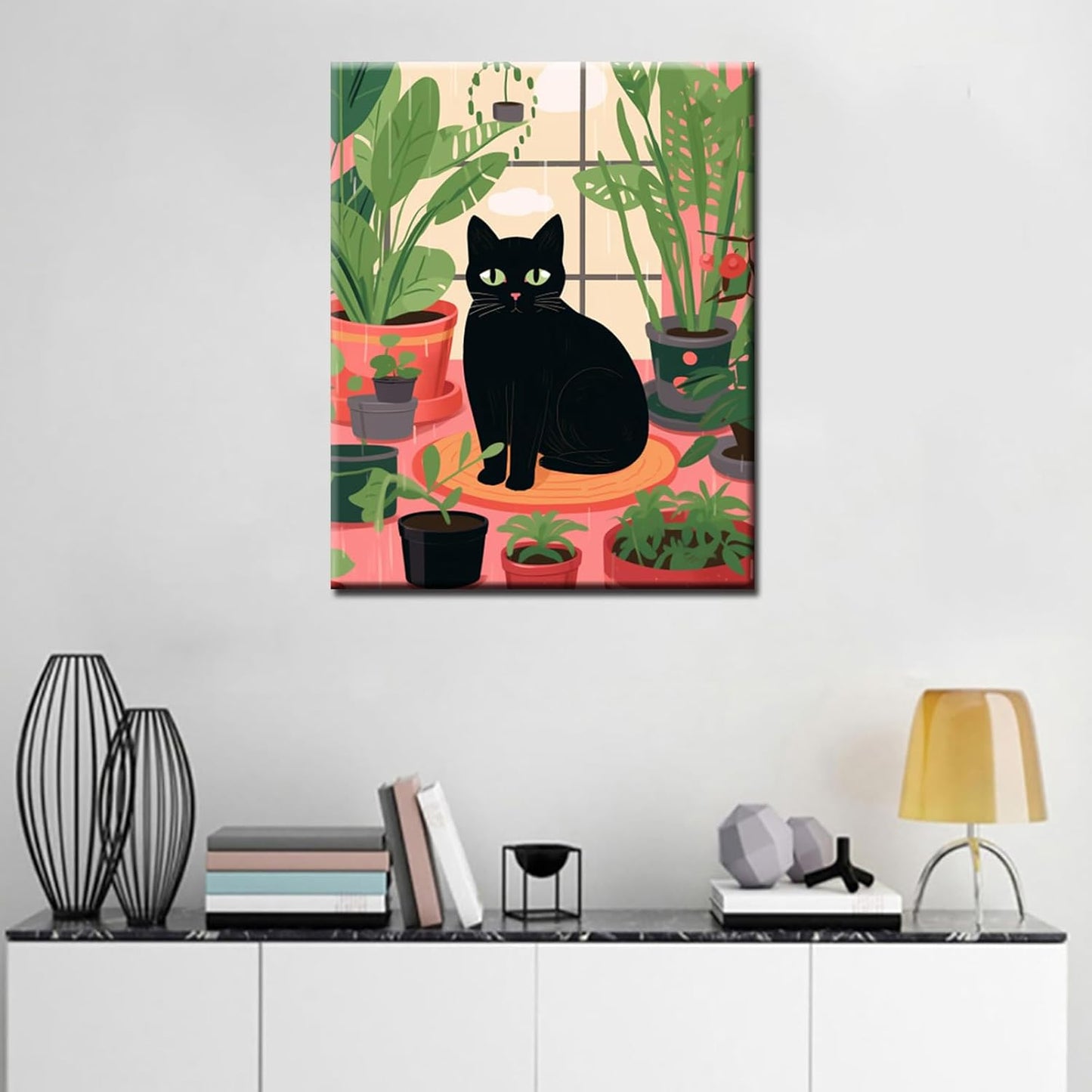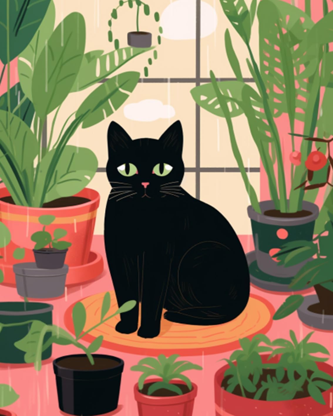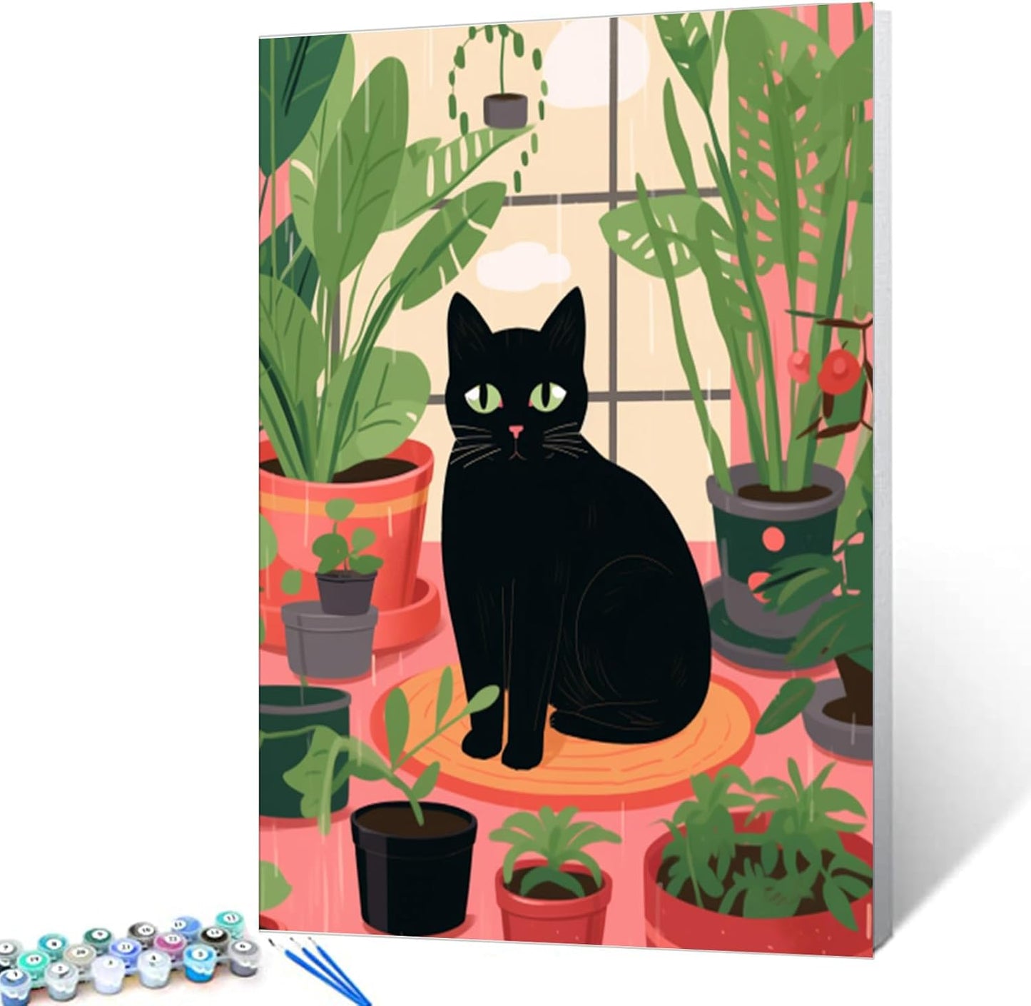 Schwarze Katze sitzt auf dem Boden, umgeben von einer Topfpflanze. Malen nach Zahlen