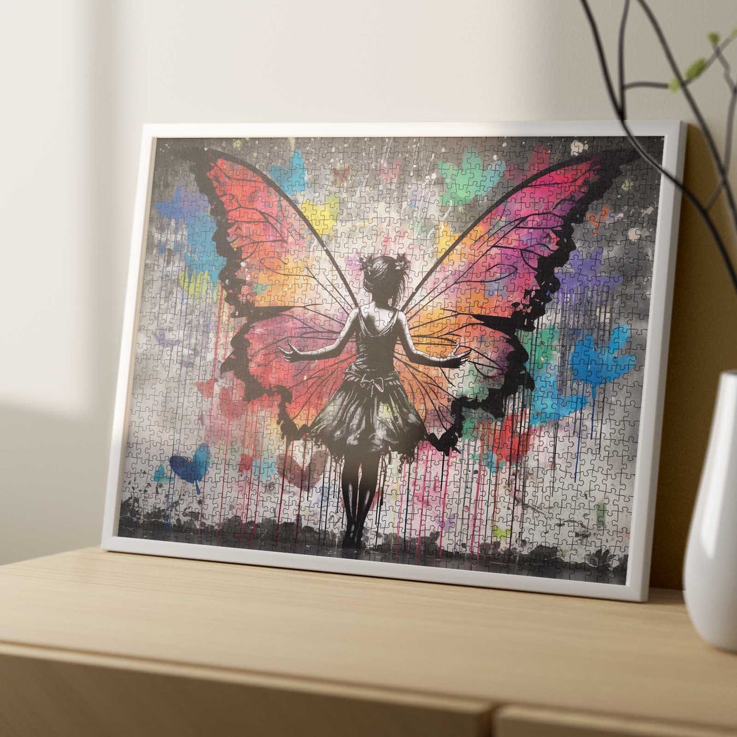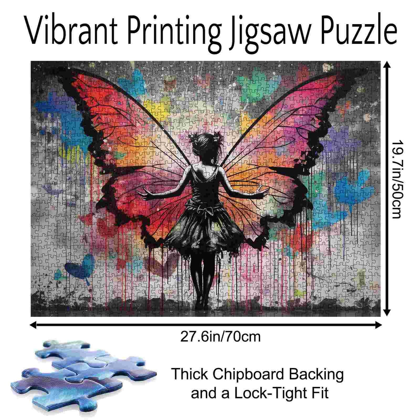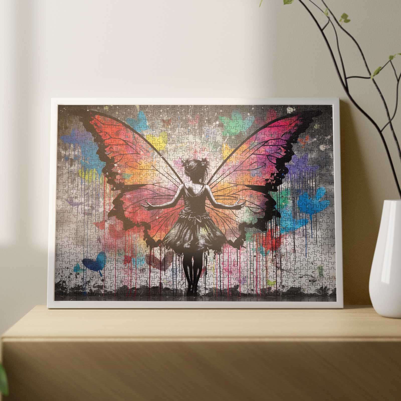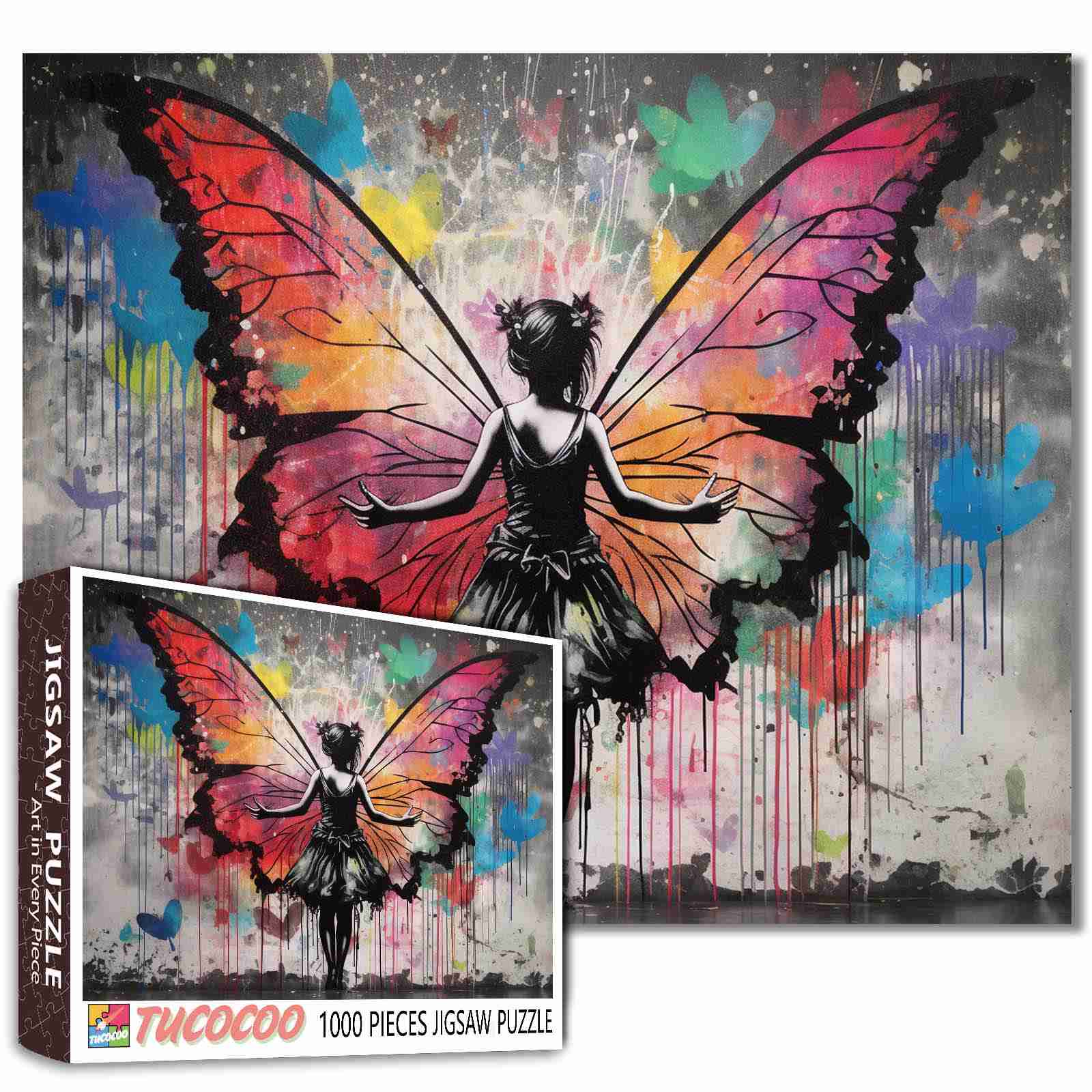 Eine fesselnde Szene entfaltet sich, als ein Mädchen mit weit ausgebreiteten Armen dasteht und farbenfrohe Schmetterlingsflügel enthüllt, die sich wunderschön hinter ihr ausbreiten. Die leuchtenden Orange-, Rosa- und Blautöne verschmelzen nahtlos und erzeugen eine Farbexplosion, die einen Kontrast zu ihrem schwarzen Kleid bildet. Dieses Kunstwerk voller Energie und Leben symbolisiert Freiheit und Transformation. Die mitten in der Bewegung eingefangene Figur lädt Sie ein, in die skurrile Schönheit dieser künstlerischen Schöpfung einzutauchen und stellt eine reizvolle Herausforderung für jeden Puzzle-Liebhaber dar. Lassen Sie Ihrer Fantasie freien Lauf, während Sie dieses beeindruckende Design zusammensetzen.
