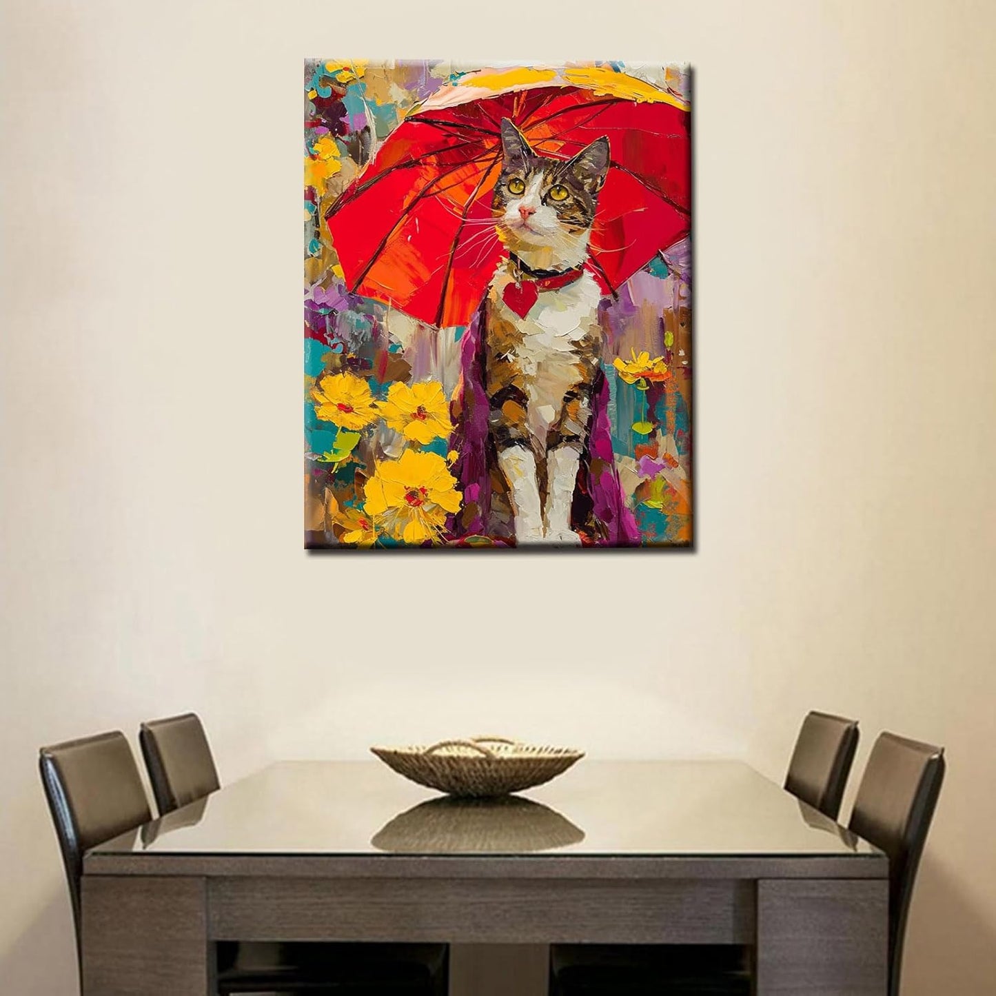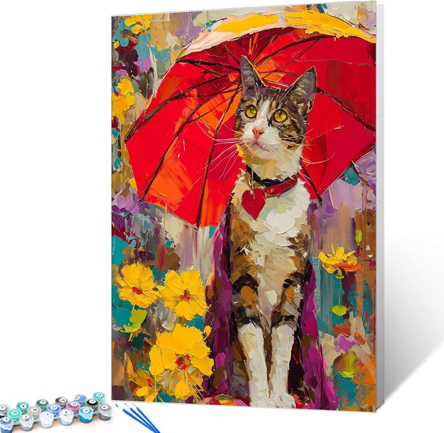 Katze unter einem roten Regenschirm Malen nach Zahlen