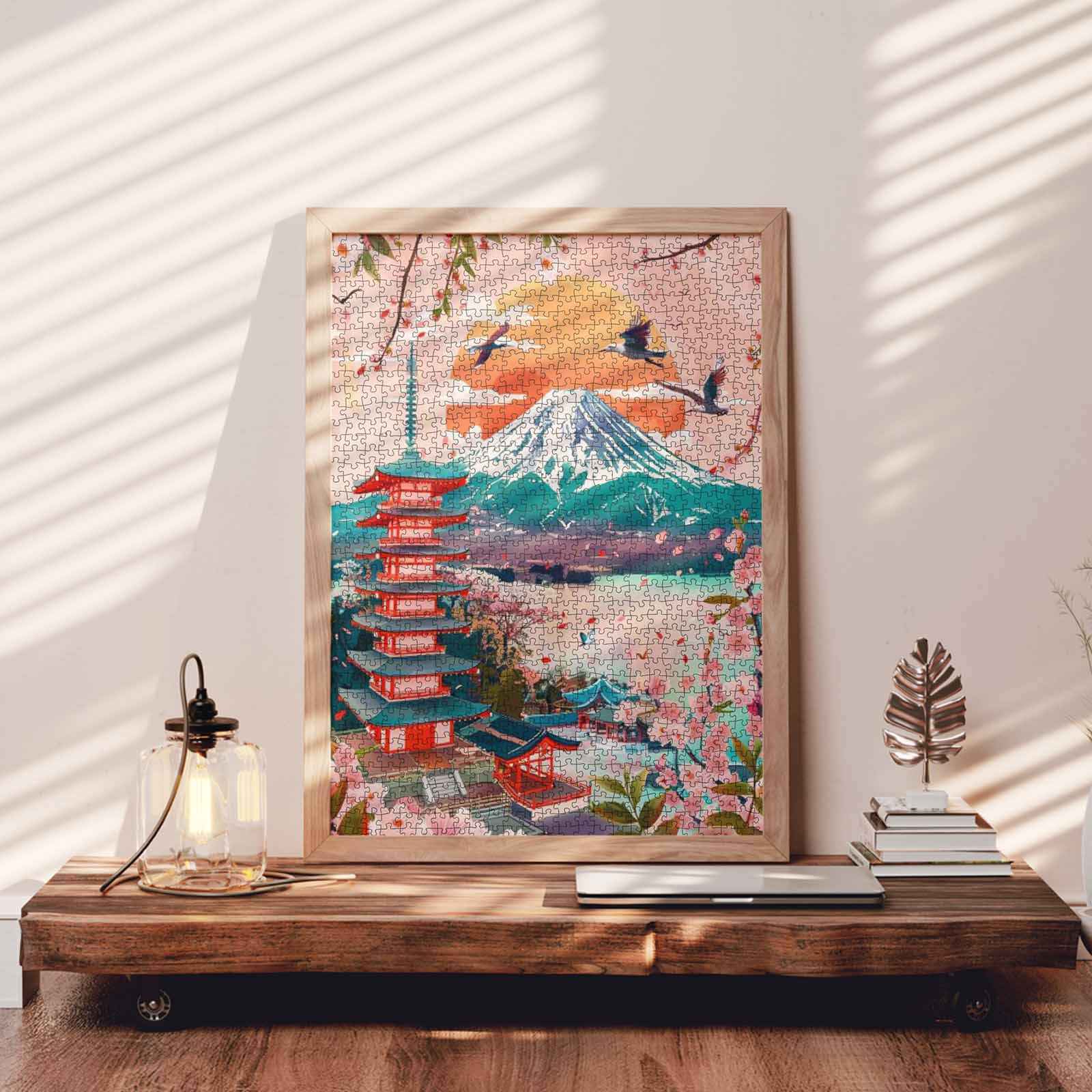 Erleben Sie die Essenz Japans mit einem malerischen Blick auf den Fuji, der sich hinter einer traditionellen roten Pagode erhebt. Kirschblüten blühen in zartem Rosa, Vögel gleiten unter der strahlenden Sonne vorbei und Tempeldächer ragen durch die Bäume. Ein friedlicher Moment frühlingshafter Gelassenheit, perfekt zum Zusammenstellen.
