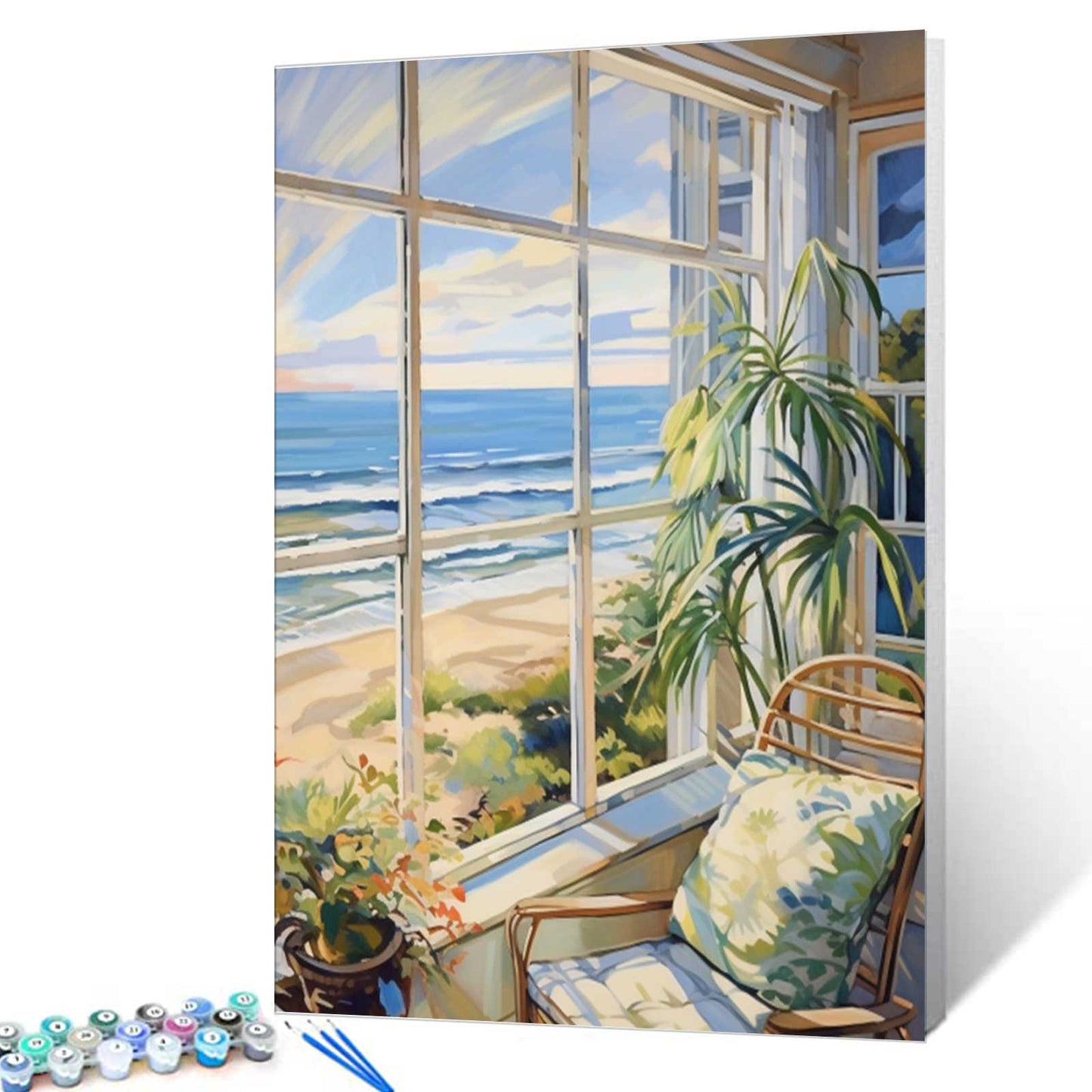 Verwandeln Sie Ihren Raum mit der friedlichen Atmosphäre eines Rückzugsorts am Meer. Dieses Malen-nach-Zahlen-Set fängt eine gemütliche Ecke mit üppigen Pflanzen, weichen Kissen und einem wunderschönen Meerblick ein, eingerahmt von großen Fenstern. Dieses Set ist sowohl für Anfänger als auch für erfahrene Künstler perfekt und bringt das erfrischende Gefühl der Küste in Ihr Zuhause.