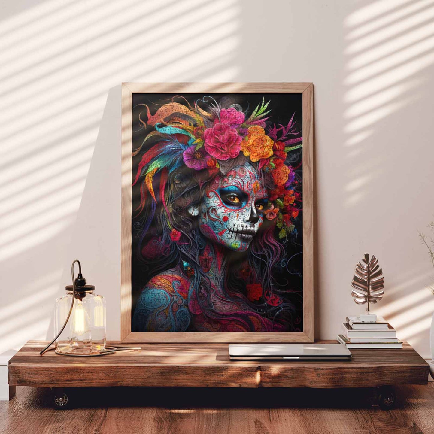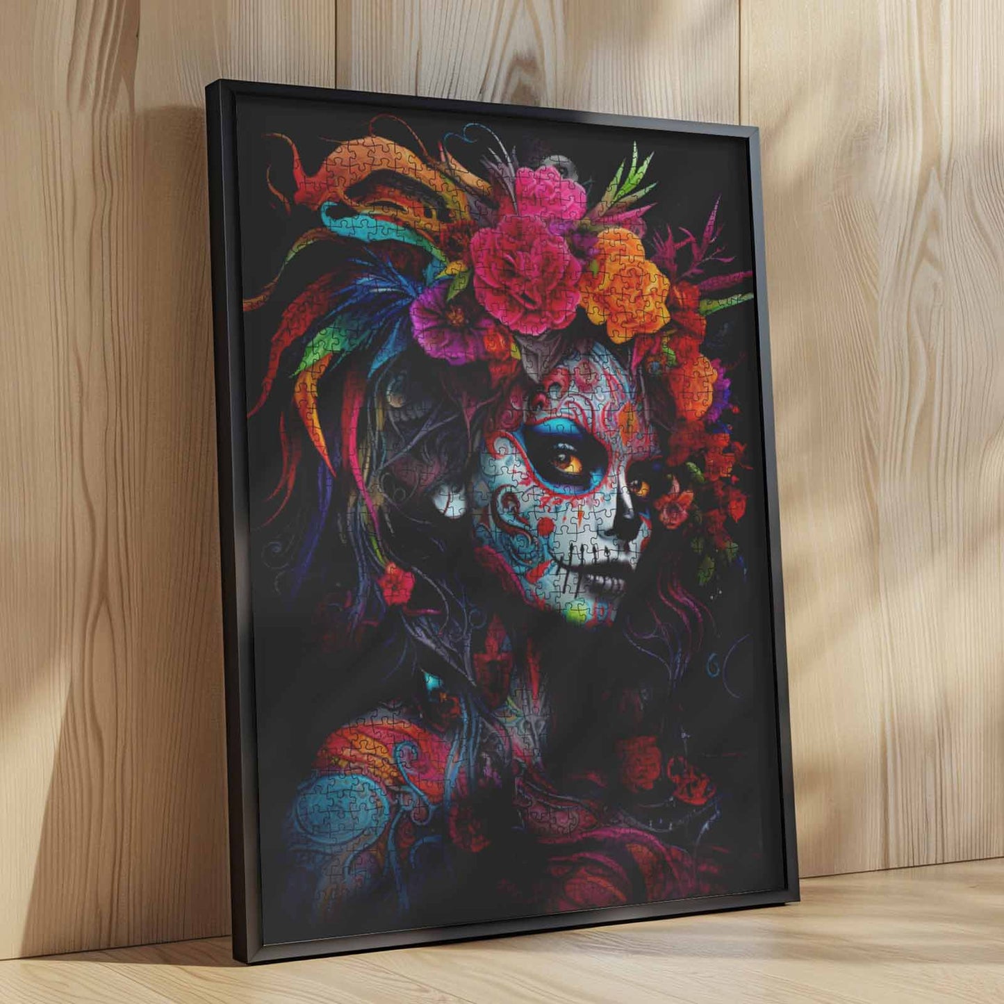 Eine beeindruckende Frau mit leuchtender Gesichtsbemalung und einer Krone aus leuchtenden Blumen taucht aus der Dunkelheit auf wie ein Geist der Feierlichkeit. Ihr Zuckerschädel-Make-up, ihre durchdringenden goldenen Augen und ihr wallendes, mit Wirbeln und Blüten verziertes Haar schaffen eine faszinierende Mischung aus Schönheit und Tradition. Jedes Puzzleteil erweckt das Leben und die Farbe dieser mutigen Hommage an den Día de los Muertos zum Vorschein.