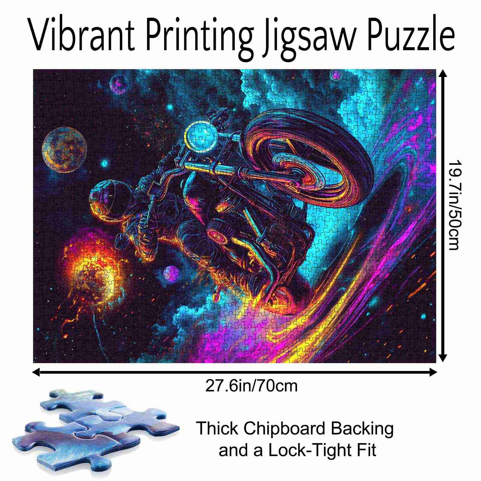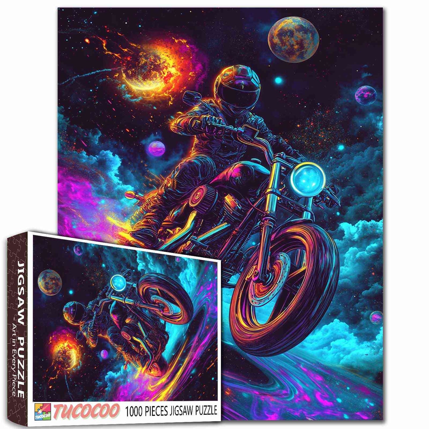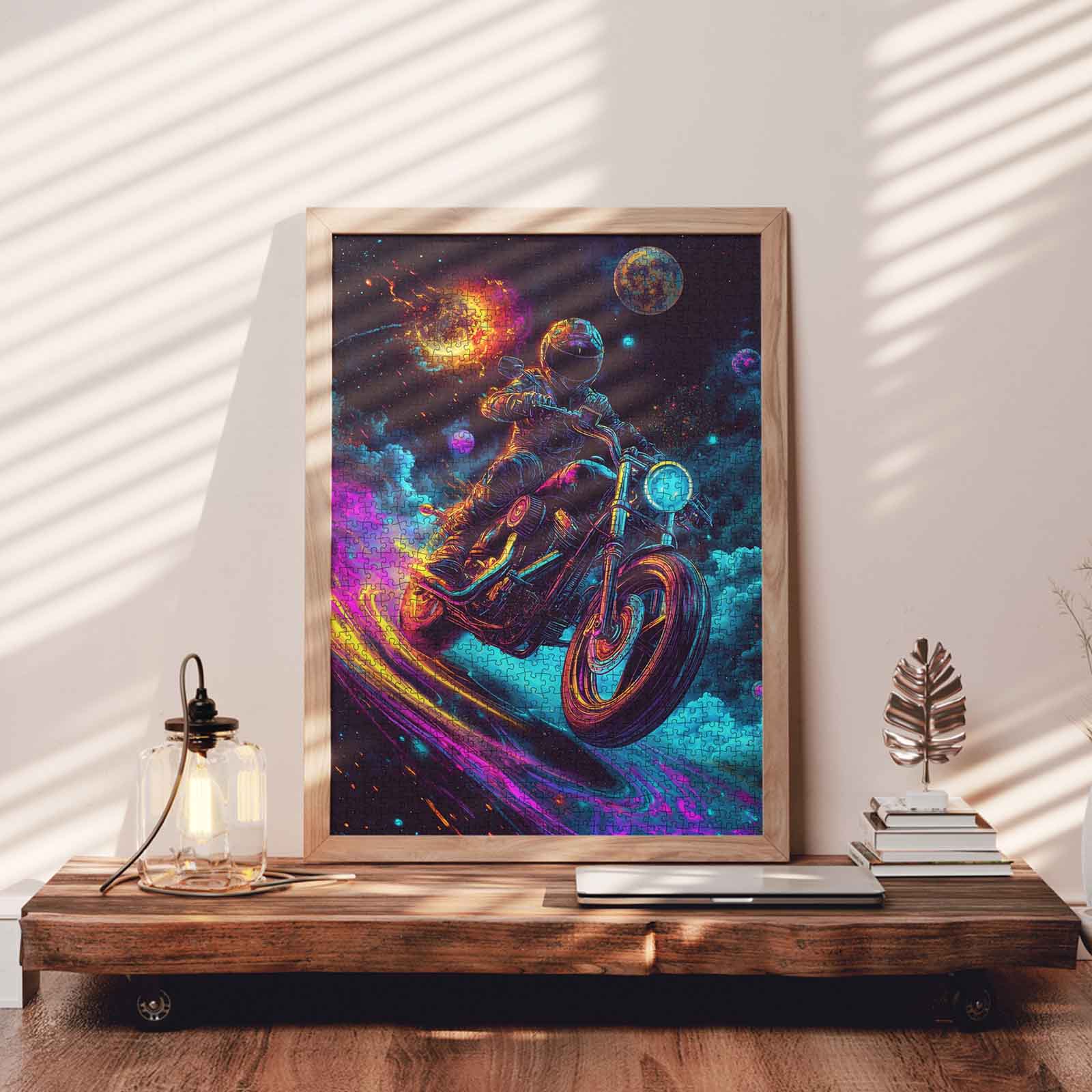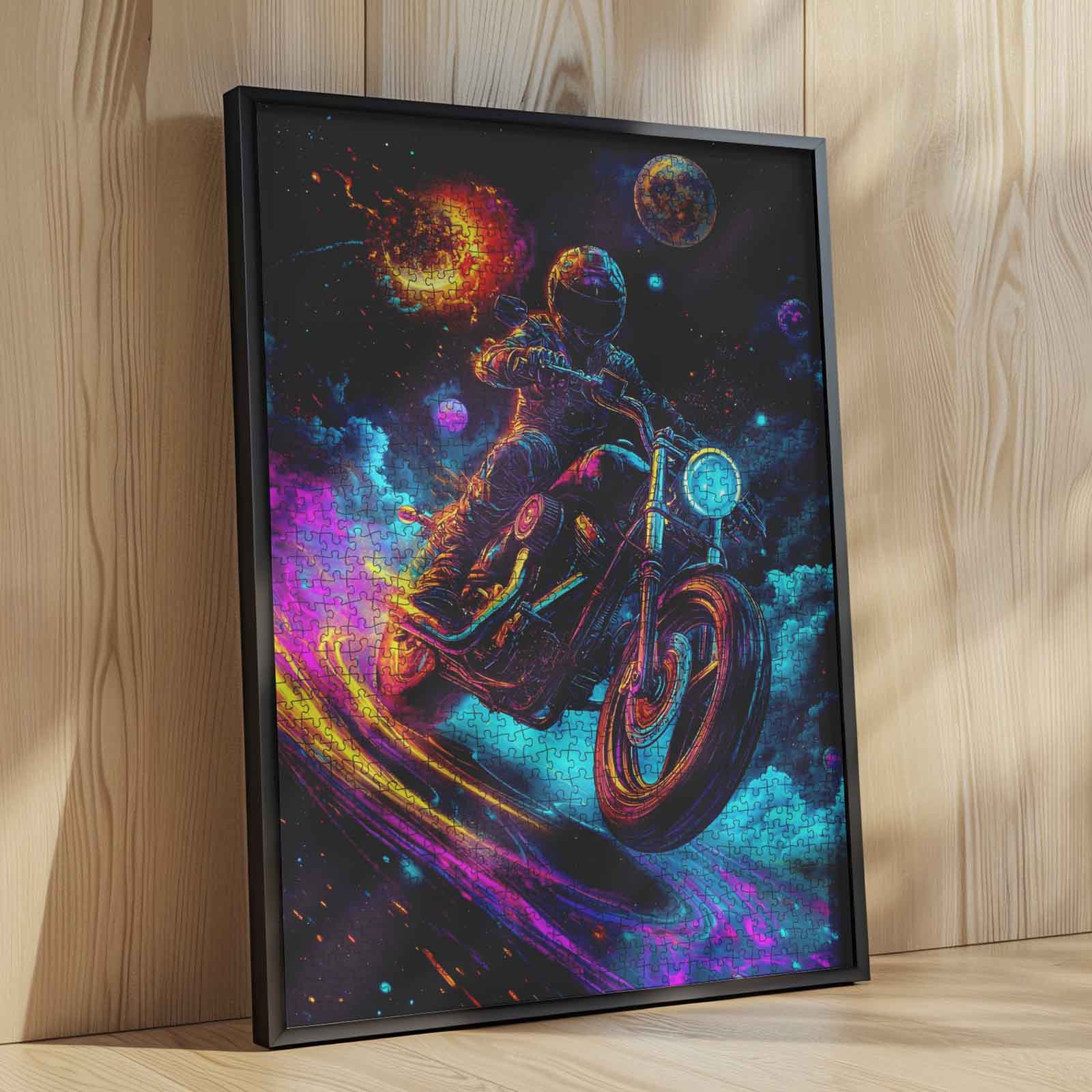 Ein einsamer Fahrer rast auf einem leuchtenden Motorrad durch die Galaxie und rast durch neonfarbene Sternenstaubspuren. Mit explodierenden Planeten und Meteoren im Hintergrund wirkt die Szene wie ein Science-Fiction-Traum mit Vollgas. Jedes Detail schimmert in leuchtendem Lila, feurigem Orange und tiefem Blau und verwandelt den Weltraum in einen Hochgeschwindigkeitsspielplatz. Jedes Puzzleteil weckt das Gefühl von Bewegung, Rebellion und kosmischen Wundern. Für alle, die Fantasie, Geschwindigkeit und interstellare Fluchten lieben, ist dieses Puzzle die Eintrittskarte in ein anderes Universum – eines, das von Fantasie und purem Adrenalin angetrieben wird.