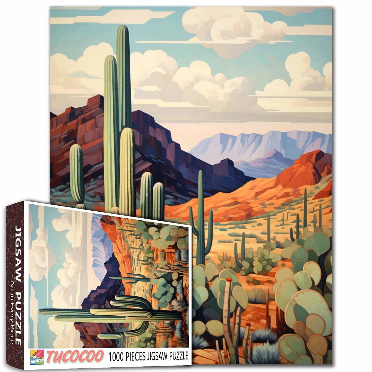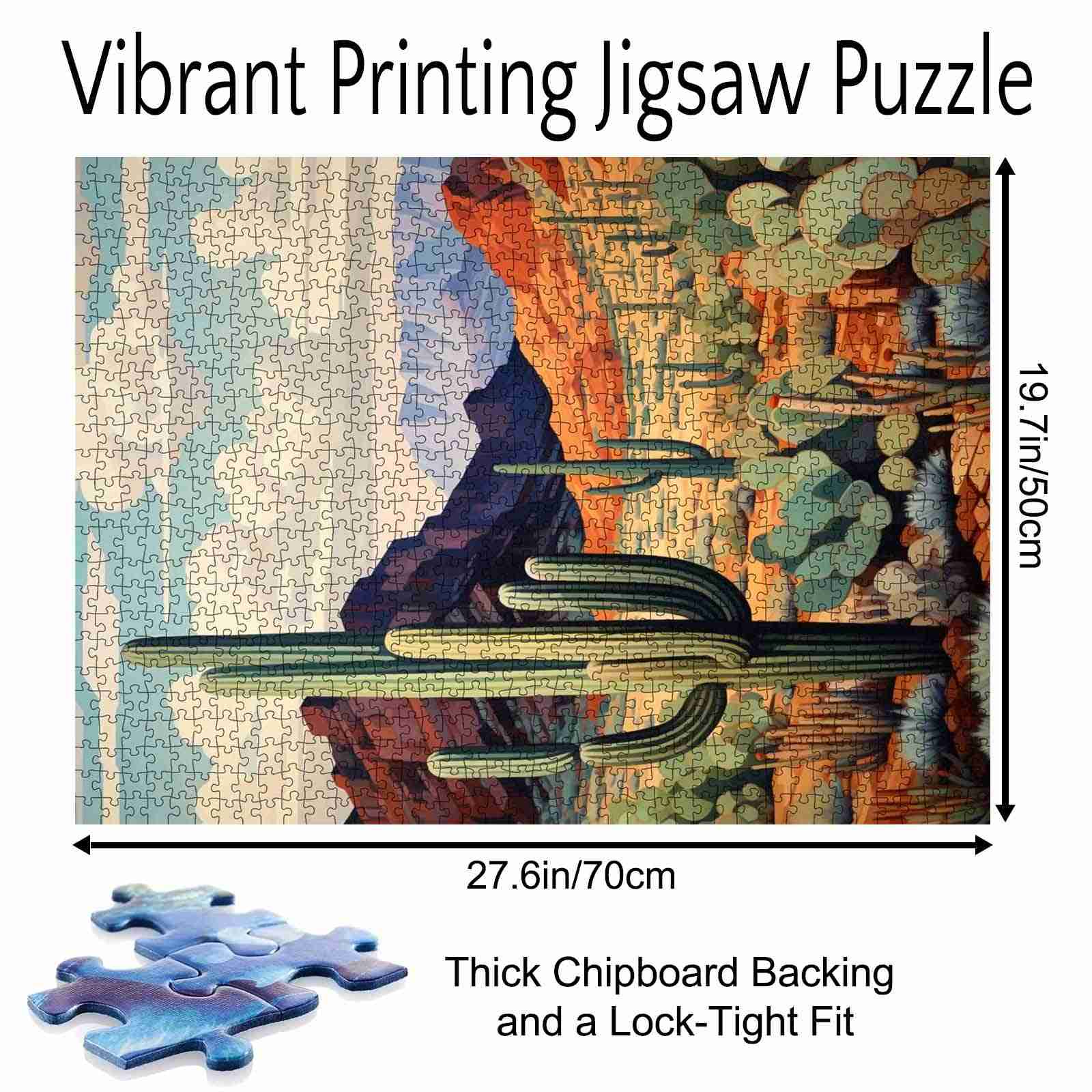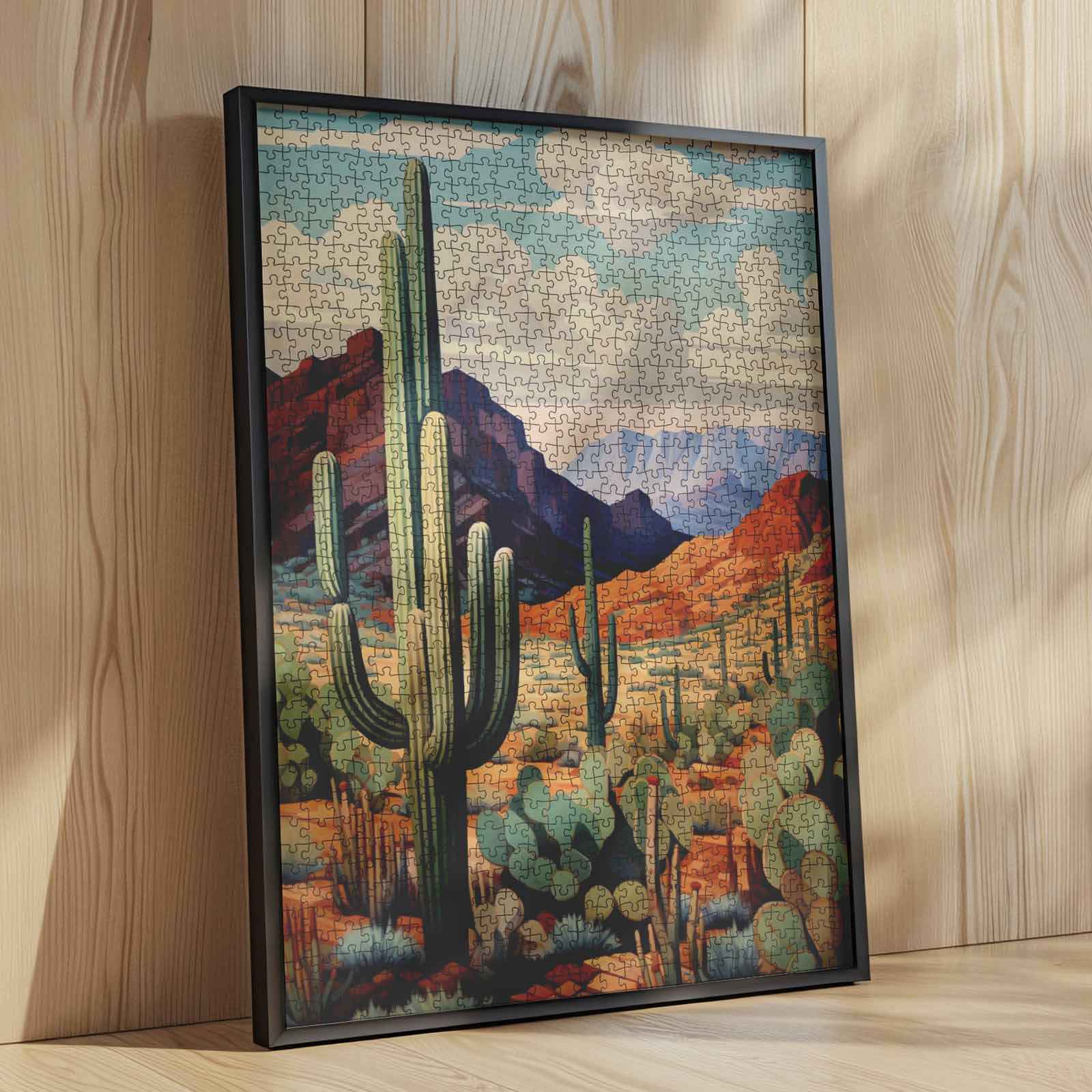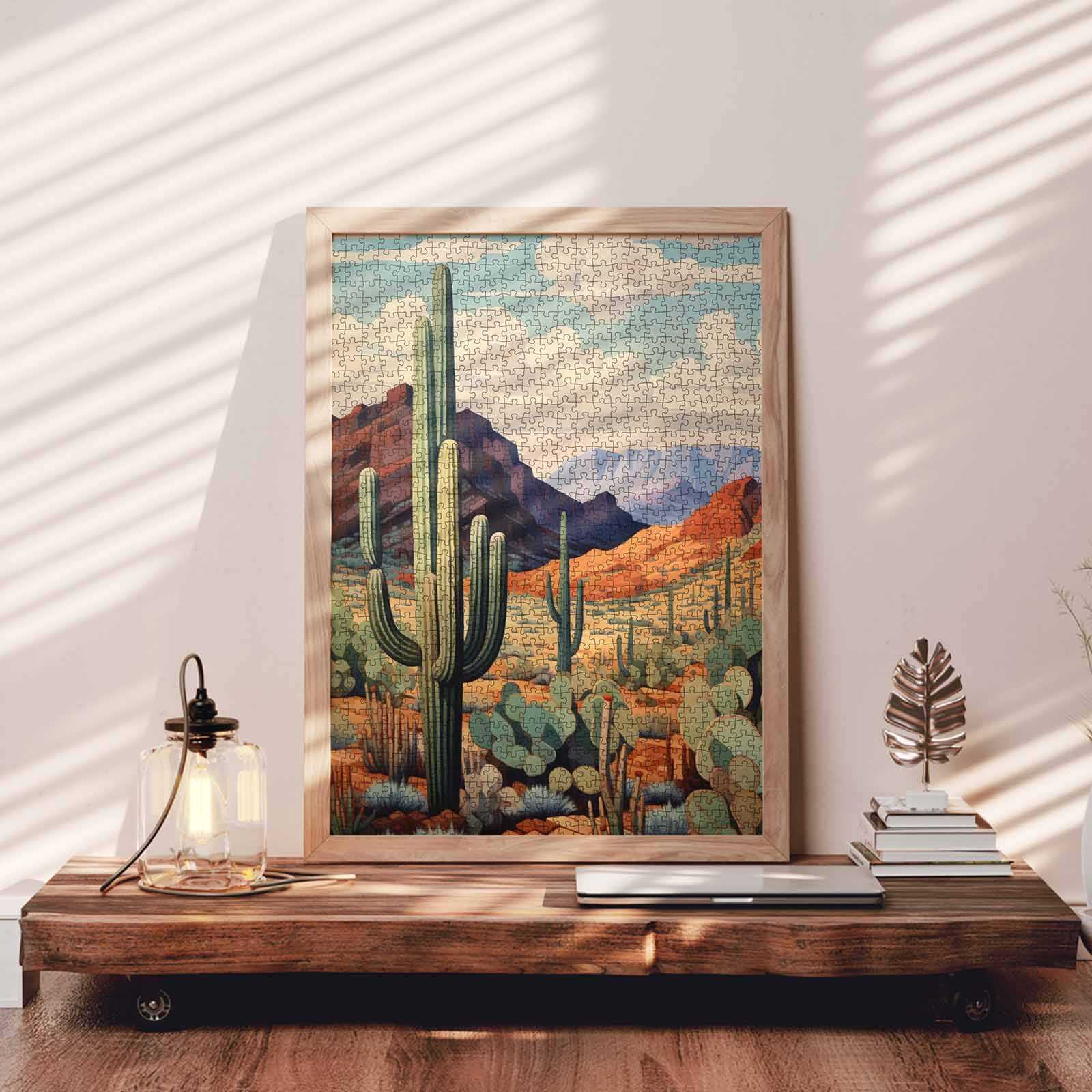 Stolz erheben sich hoch aufragende Kakteen in einem sonnenbeschienenen Wüstental, umgeben von schroffen roten Felsen und fernen Bergrücken. Die warmen Töne von Orange, Braun und Ocker verschmelzen nahtlos mit tiefen Schatten und strahlendem Himmel. Jede Kurve des Canyons und jede Form des Kaktus trägt zum Rhythmus dieser friedlichen südwestlichen Szene bei. Stück für Stück offenbart das Puzzle die Kraft und Ruhe der Wüste – still, kraftvoll und voller Leben. Ein perfekter Rückzugsort für alle, die weite Landschaften und zeitlose Naturschönheit lieben.