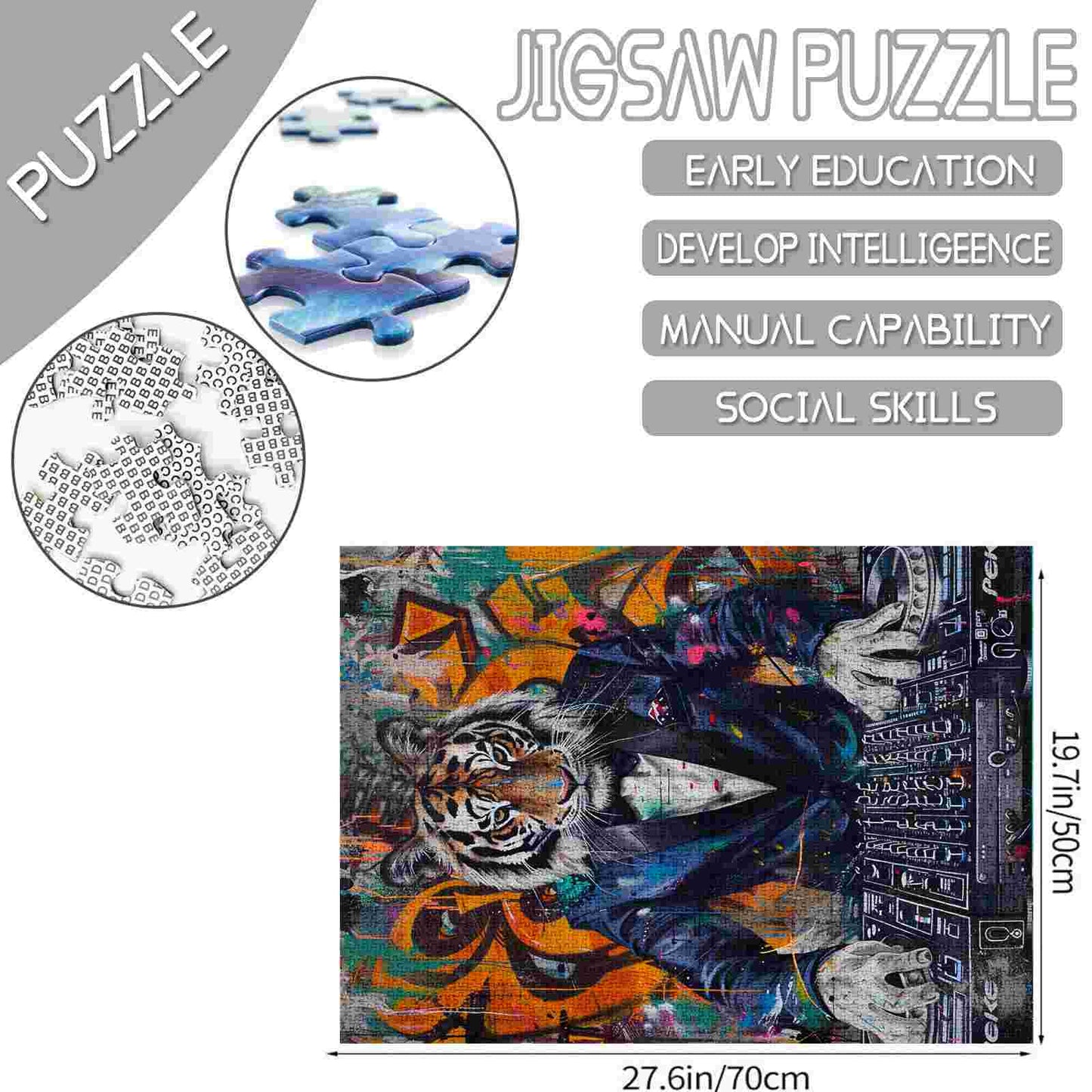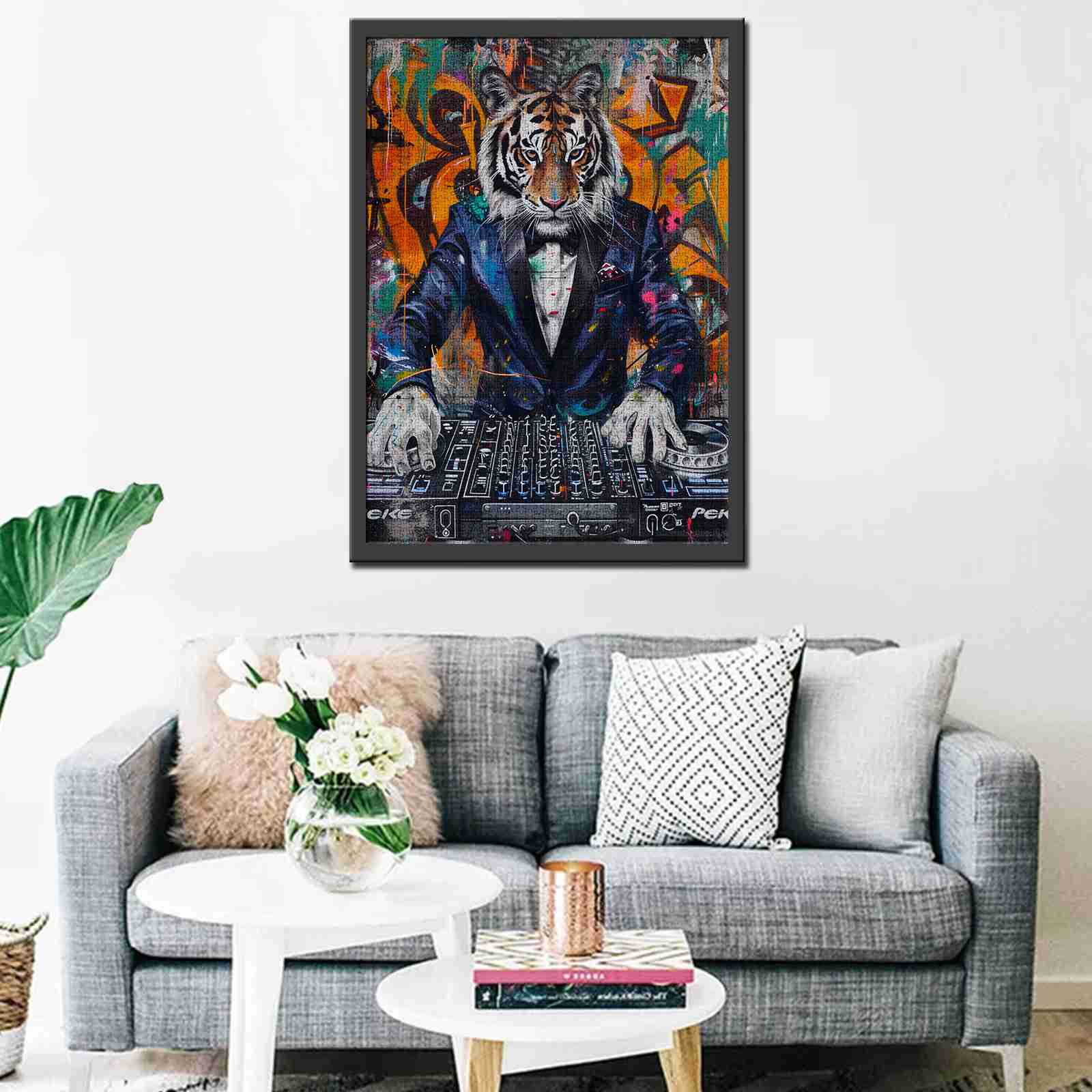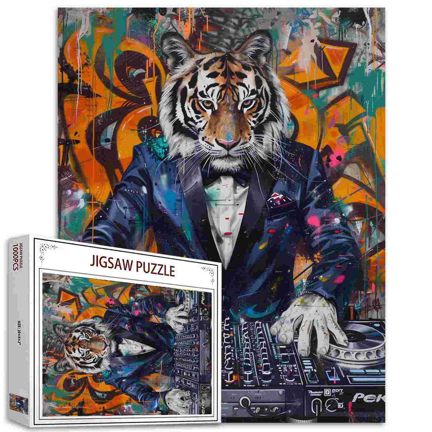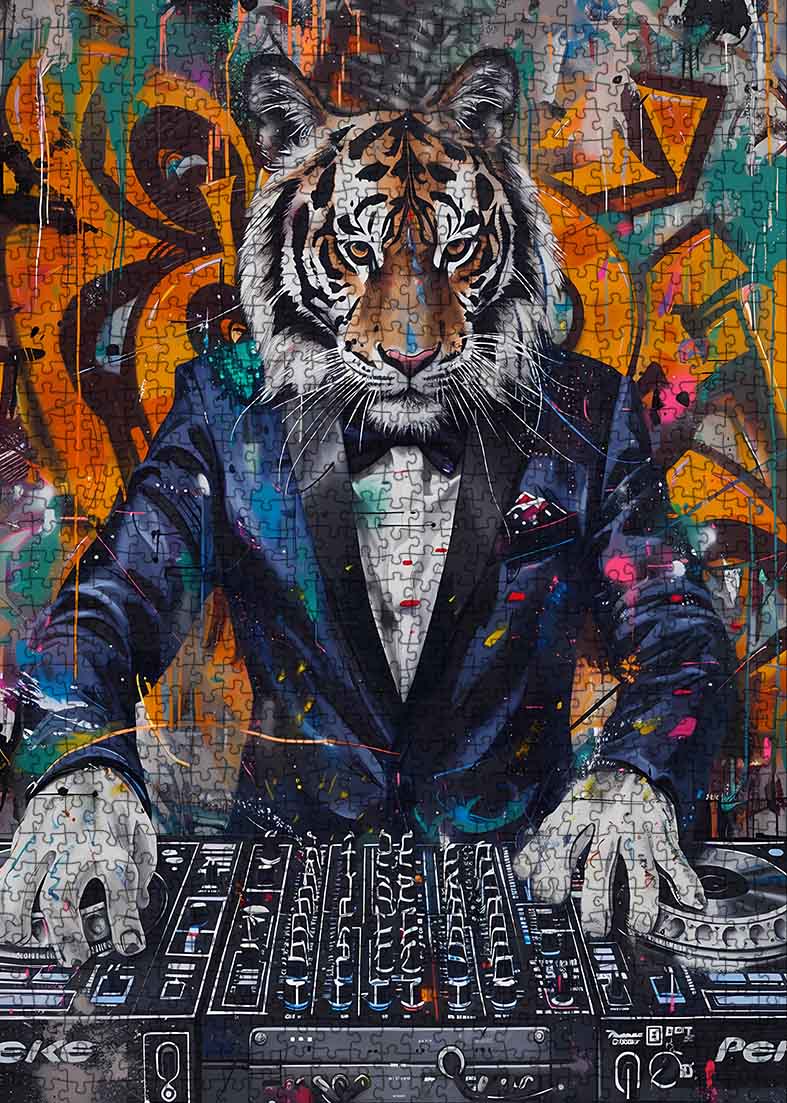 Ein wilder Tiger im eleganten Smoking steht am DJ-Pult, seine scharfen Augen fokussieren, während er mit jedem Beat die Nacht beherrscht. Umgeben von Graffiti-Farbexplosionen und urbaner Textur spielt er nicht nur Musik – er beherrscht die Tanzfläche des Betondschungels. Der Kontrast zwischen der rohen Kraft des Tigers und der Eleganz seines Outfits schafft eine kühne und unvergessliche Szene und macht jedes Puzzleteil zu einem Teil eines ungezähmten Rhythmus.