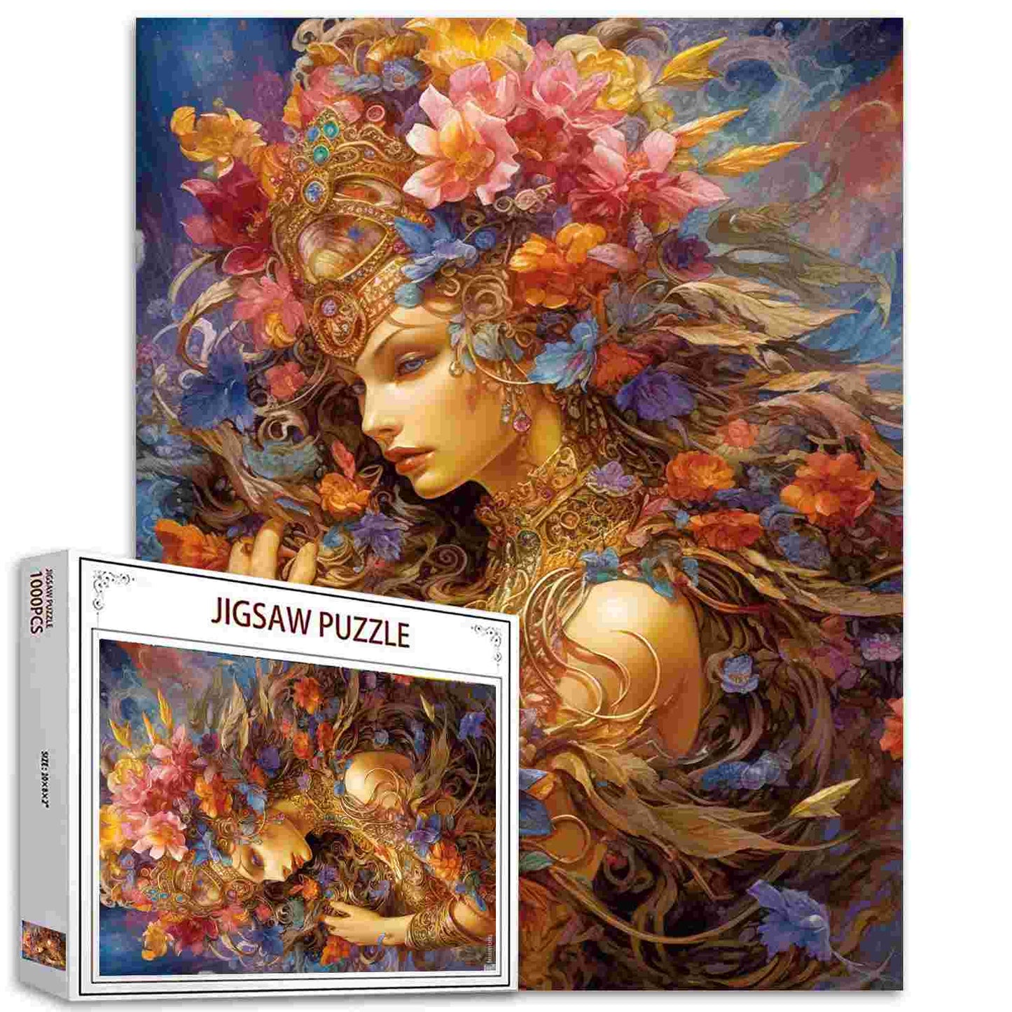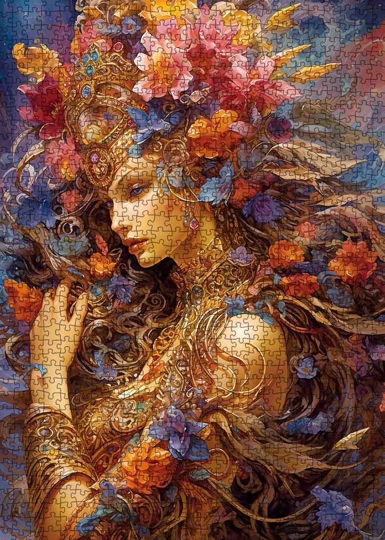 Betreten Sie mit diesem Fairy Queen-Puzzle eine Welt voller Eleganz und Wunder. Das Kunstwerk zeigt eine majestätische Königin, umgeben von einer Explosion leuchtender Blumen in Orange-, Rosa- und Blautönen, die nahtlos mit ihrem wallenden goldenen Haar verflochten sind. Ihre mit funkelnden Juwelen geschmückte Krone verleiht eine königliche Note, während ihr detailreiches Kleid mit goldenen Verzierungen schimmert. Die sanfte Mischung aus Farben und Texturen erweckt die Szene zum Leben und schafft ein Bild, das sich fast magisch anfühlt. Jedes Teil enthüllt ein neues Detail, wodurch der Zusammenbauprozess genauso faszinierend ist wie das endgültige Bild selbst.