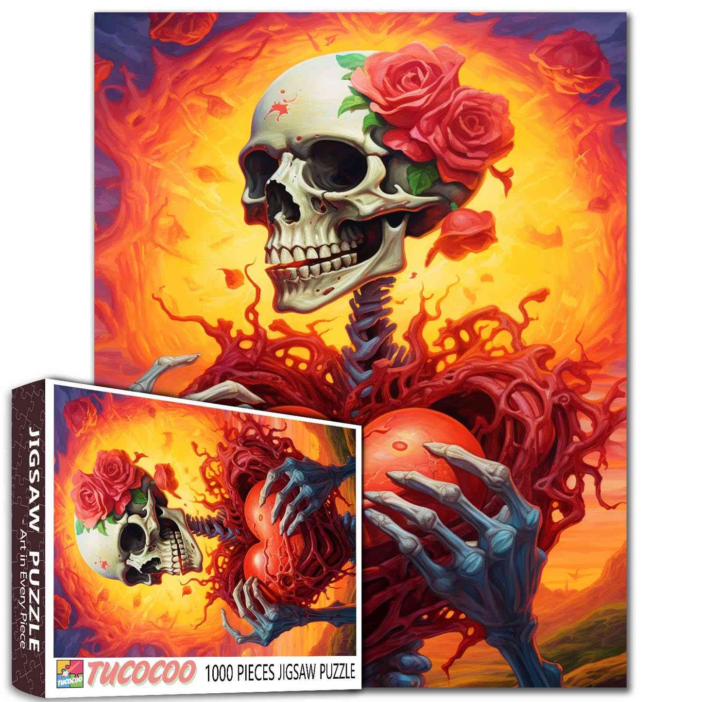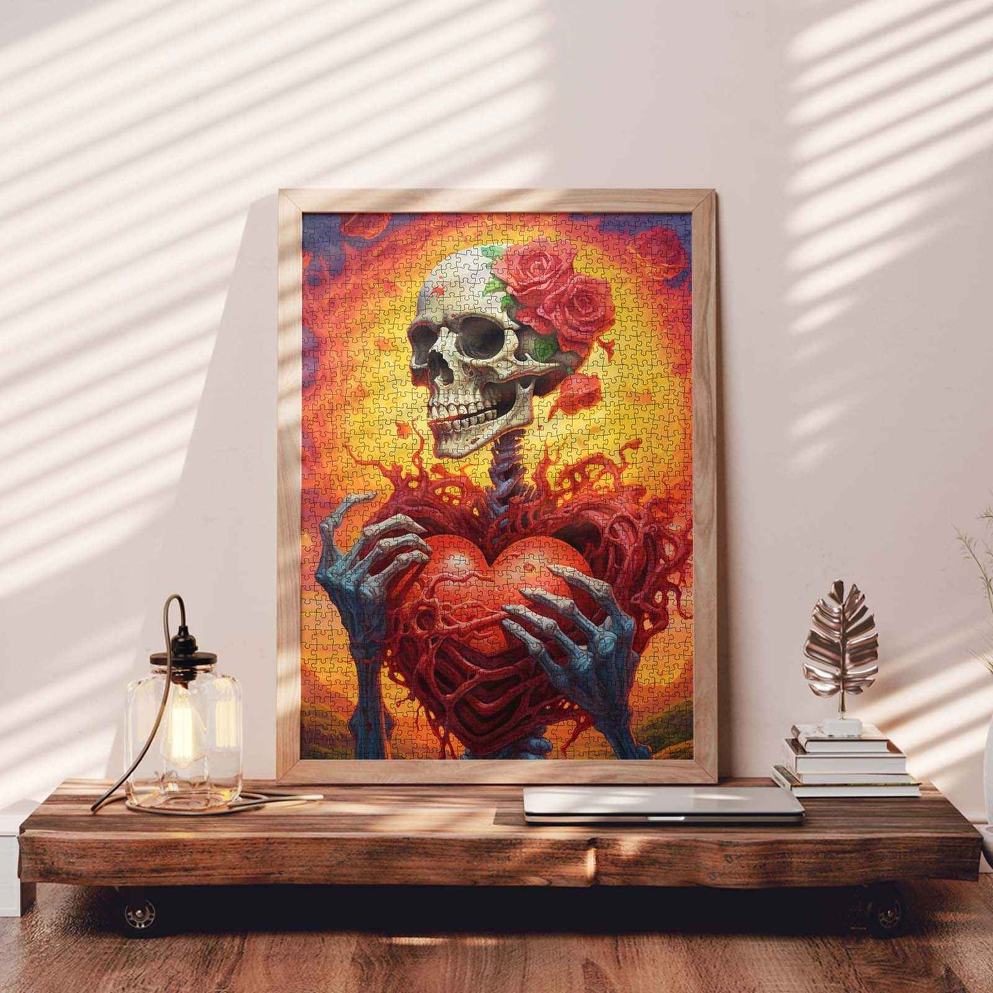 In lodernden Flammen getaucht, umklammert ein Skelett fest ein leuchtend rotes Herz, das von Adern aus Feuer und Emotionen durchzogen ist. Ein Paar Rosen blüht aus dem Schädel und mildert die Intensität der Szene. Es ist ein dramatisches Bild der Liebe, die über den Tod hinaus brennt – perfekt für alle, die surreale und symbolische Kunst lieben.