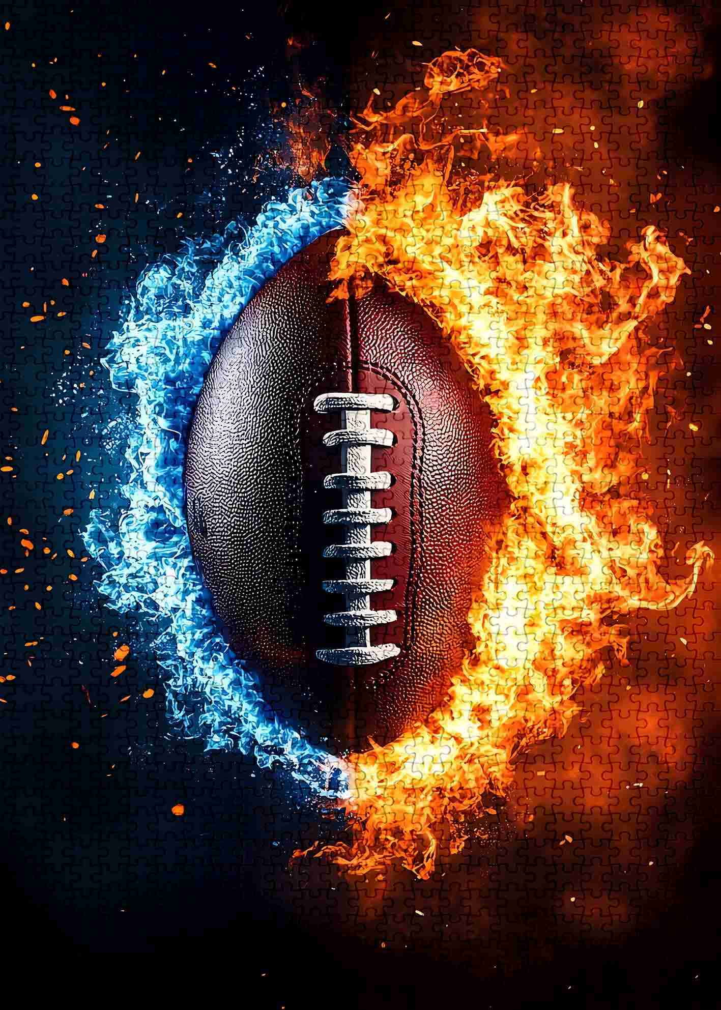 Spüren Sie die Intensität des Spiels mit diesem beeindruckenden 1000-teiligen Puzzle. Ein von feurigen Flammen und eisblauen Streifen umhüllter Fußball symbolisiert den ultimativen Kampf zwischen Kraft und Präzision. Perfekt für Sportbegeisterte und Puzzlefans, ist es eine optisch beeindruckende Herausforderung für Ihre Sammlung.