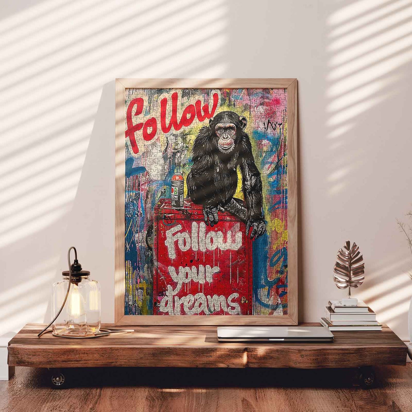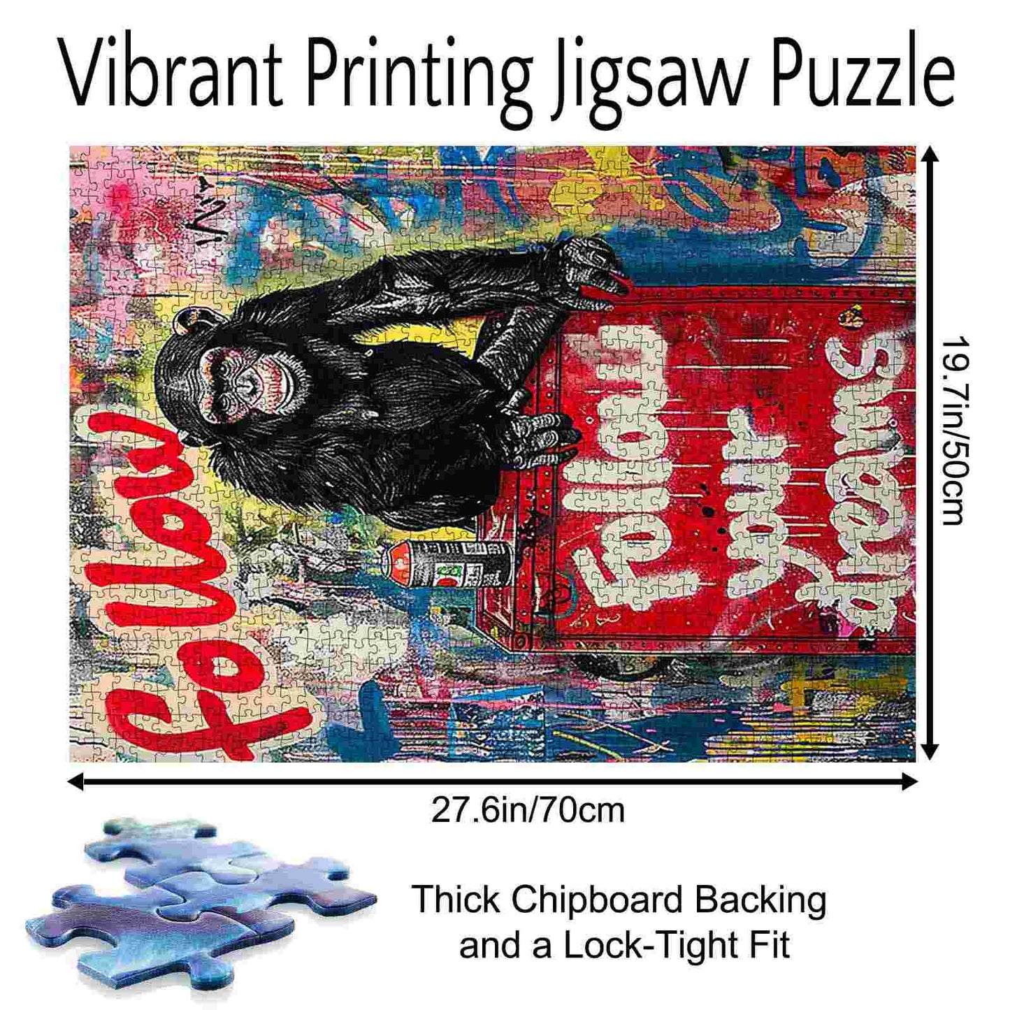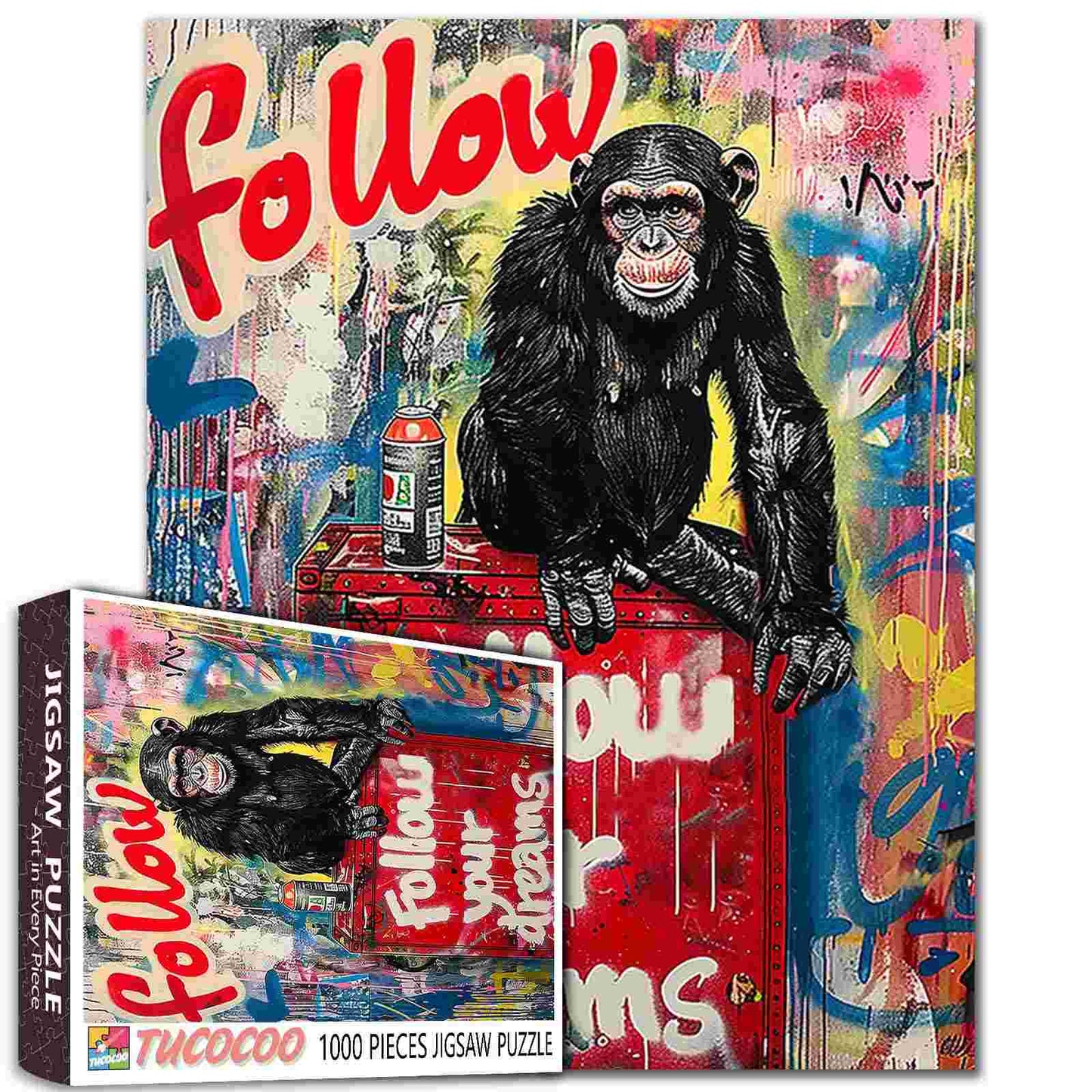 Ein Graffiti-inspiriertes Puzzle mit einem mutigen Affen, der eine Spraydose hält und dich ermutigt, deinen Träumen zu folgen. Das lebendige Kunstwerk verbindet Street Art mit einer positiven Botschaft. Die bunten Farbspritzer rund um den ikonischen Affen schaffen eine energiegeladene Szene. Perfekt für alle, die zeitgenössische Kunst und positive Botschaften lieben. Dieses Puzzle ist nicht nur eine lustige Herausforderung, sondern auch eine inspirierende Ergänzung für dein Zuhause. Lass deiner Kreativität freien Lauf und erwecke dieses Street-Art-Meisterwerk zum Leben!