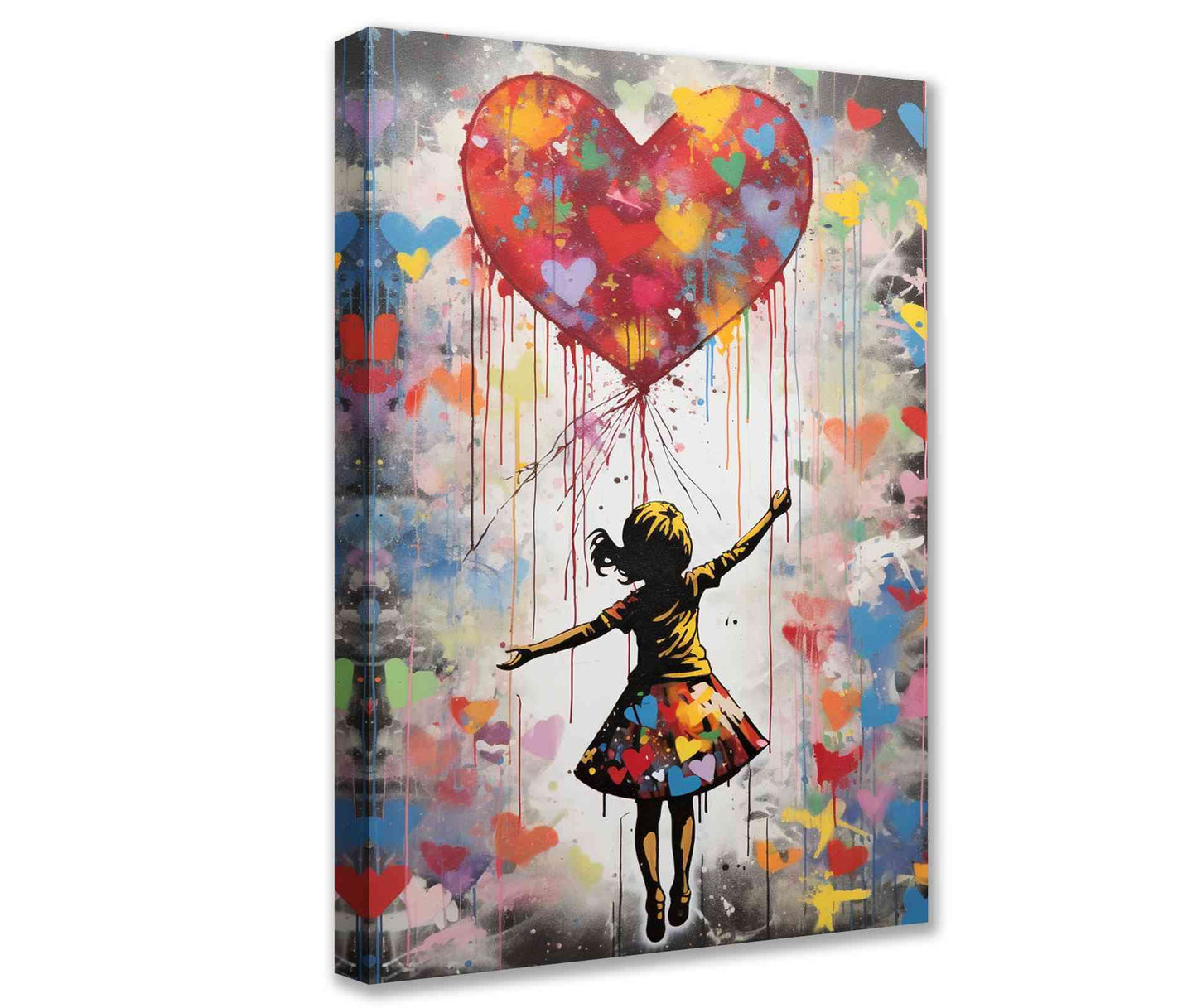 - Dieses auffällige Graffiti-Kunstwerk auf Leinwand zeigt ein junges Mädchen, das freudig nach einem großen, herzförmigen Ballon greift. Die lebhaften Farbspritzer im Hintergrund erzeugen eine verträumte, urbane Szene voller Energie und Leben. Mit Farbtropfen und einer verspielten Mischung aus Herzen bringt dieses Werk eine Mischung aus Unschuld und Street-Art-Flair und verleiht jedem Raum einen Hauch von Persönlichkeit.