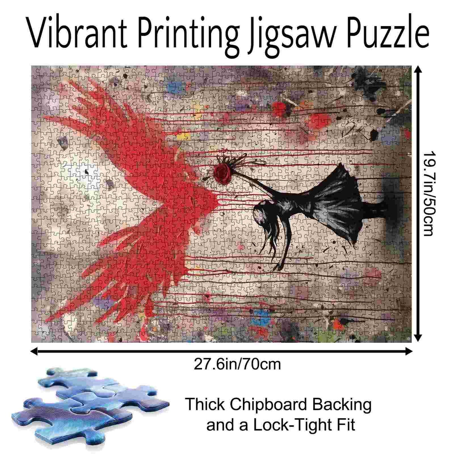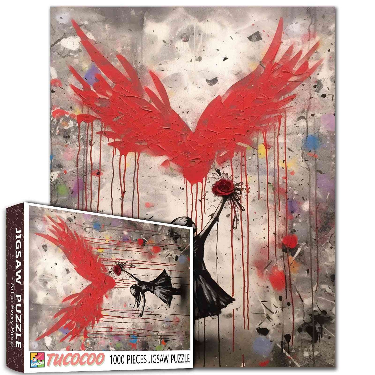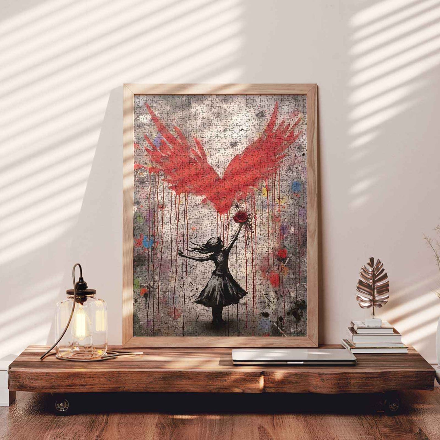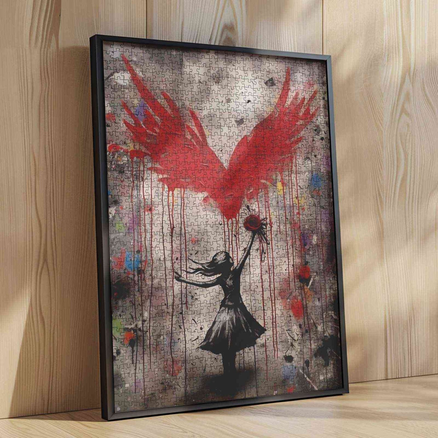 Ein atemberaubendes Kunstwerk eines Mädchens mit offenen Armen, das einen Rosenstrauß hält. Über ihr tropfen zwei wunderschöne rote, herzförmige Flügel leuchtend rot. Der von Street-Art inspirierte Hintergrund besticht durch bunte Farbspritzer und einen Mix aus abstrakten Elementen, die Liebe, Freiheit und Kreativität perfekt miteinander verbinden. Dieses Puzzle lädt Sie ein, in eine Welt einzutauchen, in der Emotionen durch eindrucksvolle Bilder zum Ausdruck kommen. Herz und Flügel symbolisieren Freiheit und Leidenschaft, während die unbeschwerte Haltung des Mädchens das Thema Selbstdarstellung unterstreicht. Lassen Sie sich von den Farben und zarten Linien durch eine spannende und inspirierende Puzzle-Reise führen.