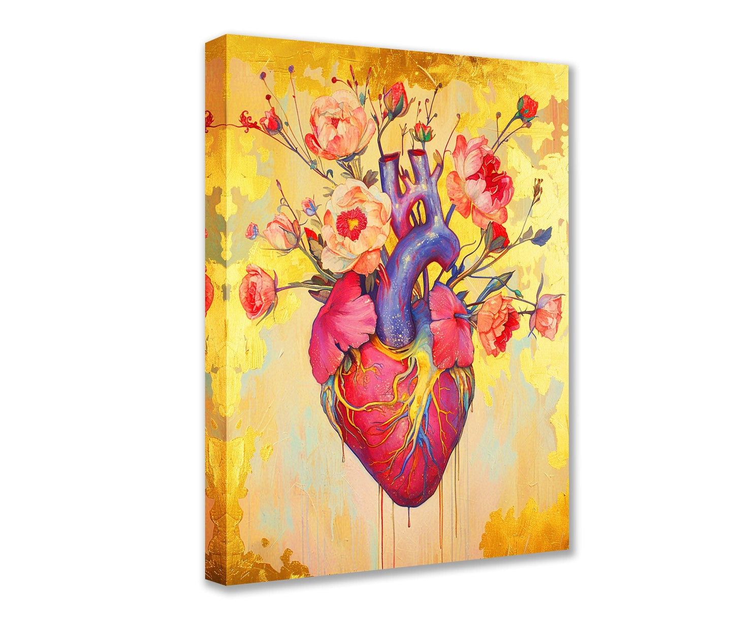 Dieses Kunstwerk strahlt Wärme und Leben aus und zeigt ein Herz, das mit leuchtend rosa und goldfarbenen Blumen erblüht. Vor einem strahlend goldenen Hintergrund symbolisiert es Liebe und Vitalität. Perfekt als bedeutungsvolles Dekorationsstück oder außergewöhnliches Geschenk für Kunstliebhaber.