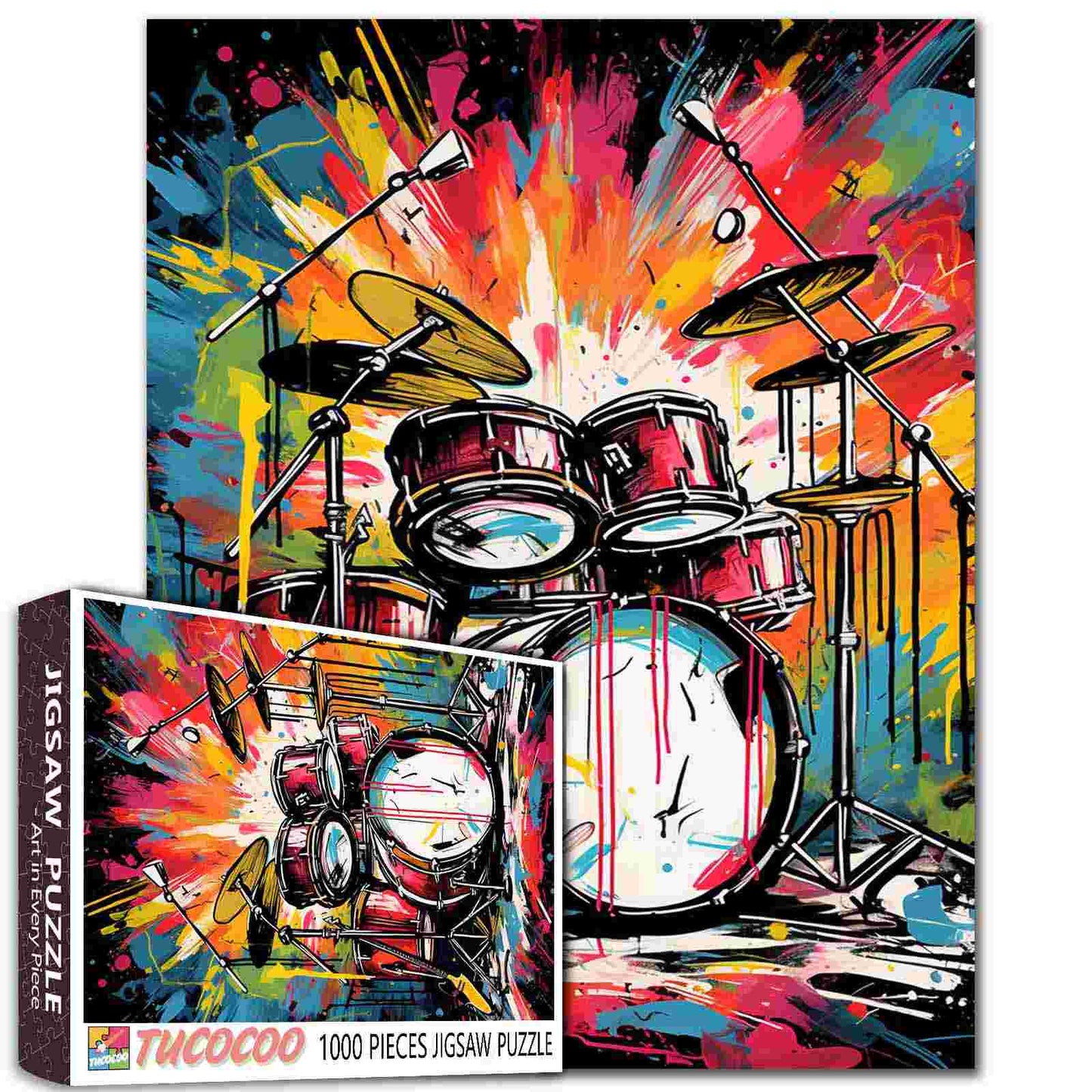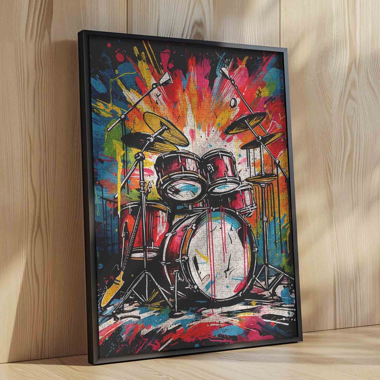 Dieses farbenfrohe Puzzle zeigt ein Graffiti-inspiriertes Schlagzeug in kräftigen Farben wie Rot, Gelb, Blau und Pink. Die Trommeln stehen im Mittelpunkt, umgeben von dynamischen Spritzern, die die Energie und Leidenschaft der Musik einfangen. Perfekt für Musik- und Kunstliebhaber – eine spannende Herausforderung.