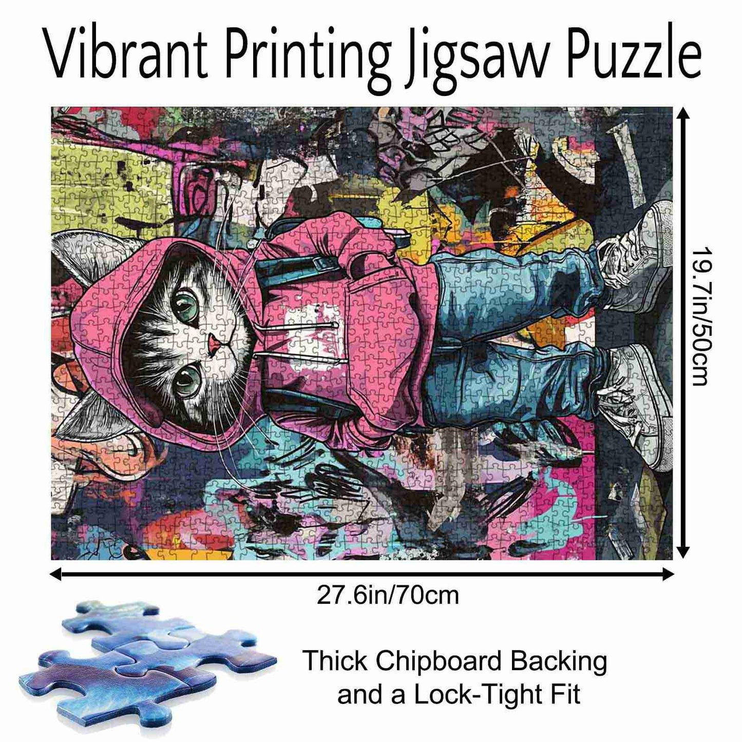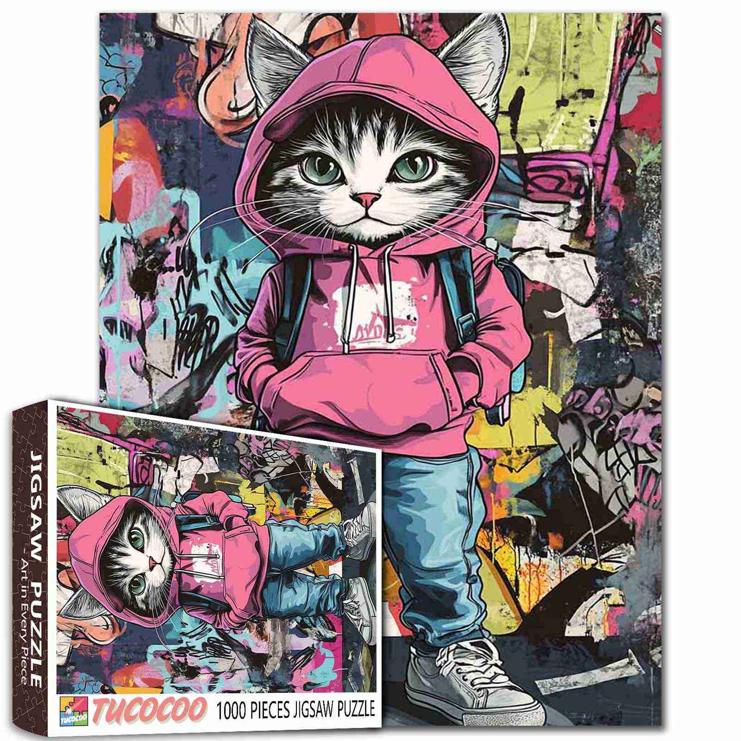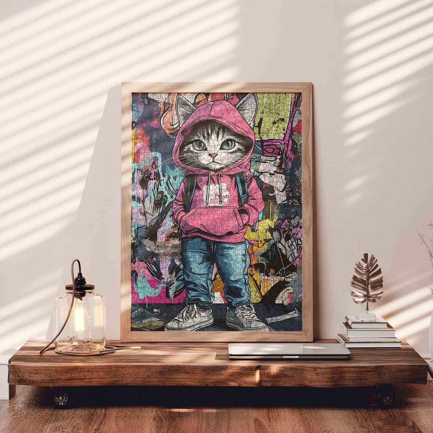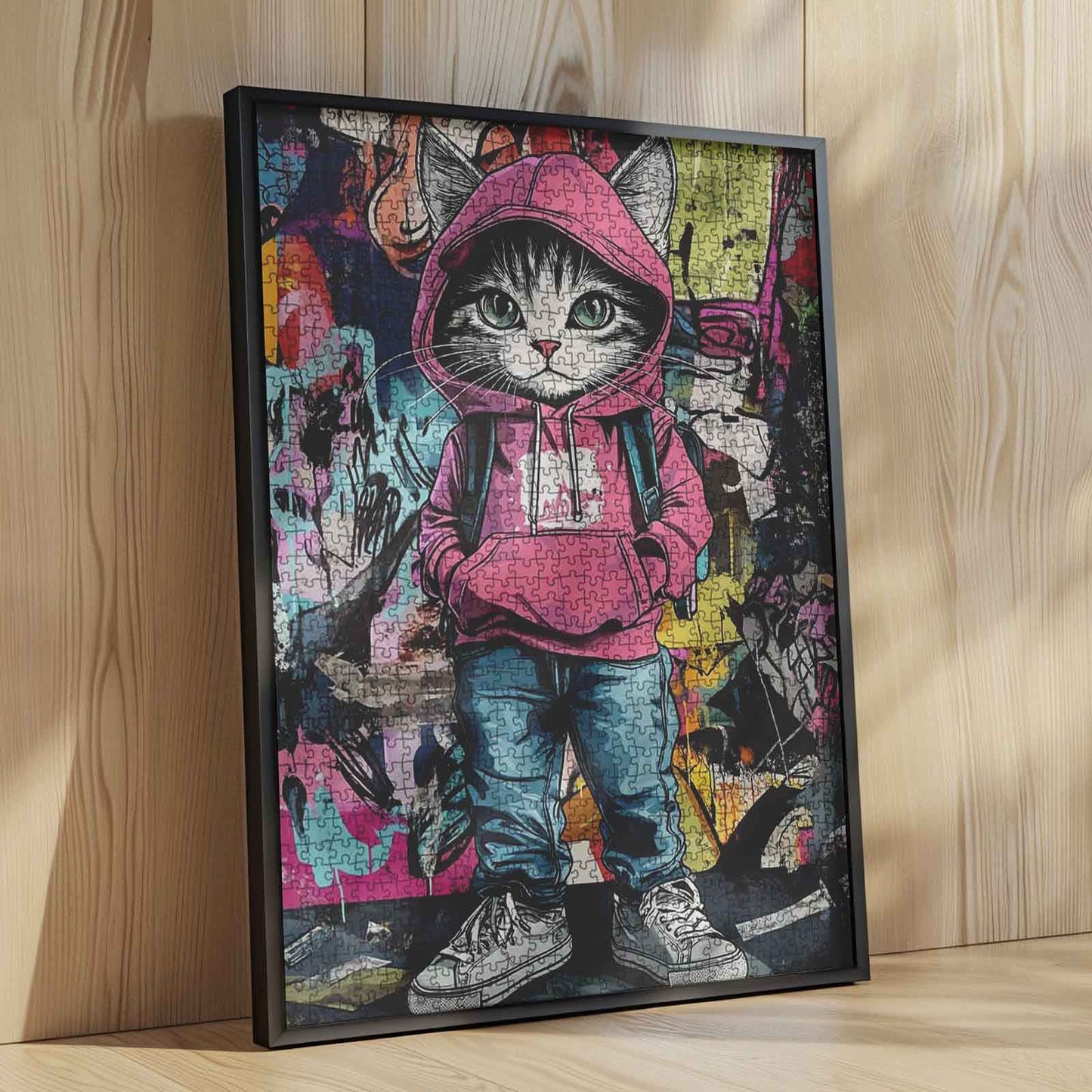 Diese coole Katze, bekleidet mit pinkem Hoodie, Jeans und Sneakers, steht selbstbewusst vor einer farbenfrohen Graffiti-Wand. Der Mix aus kräftigen Farben und Streetart verleiht diesem Puzzle Energie und Stil. Mit ihrem selbstbewussten Ausdruck und ihrer entspannten Haltung verkörpert diese Katze urbane Mode und Individualität. Perfekt für Puzzle-Fans und Fans von Katzen und Streetart – eine lustige und kreative Herausforderung.