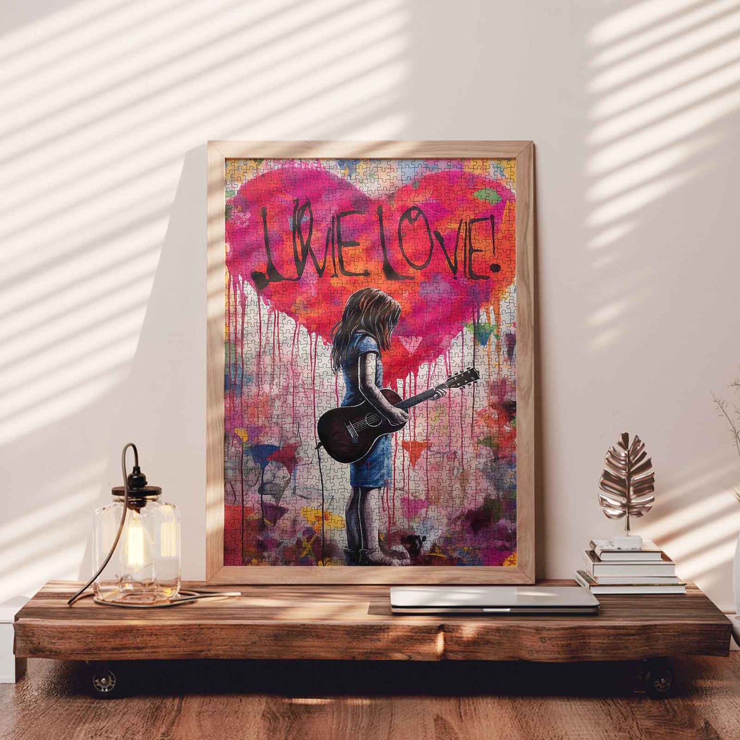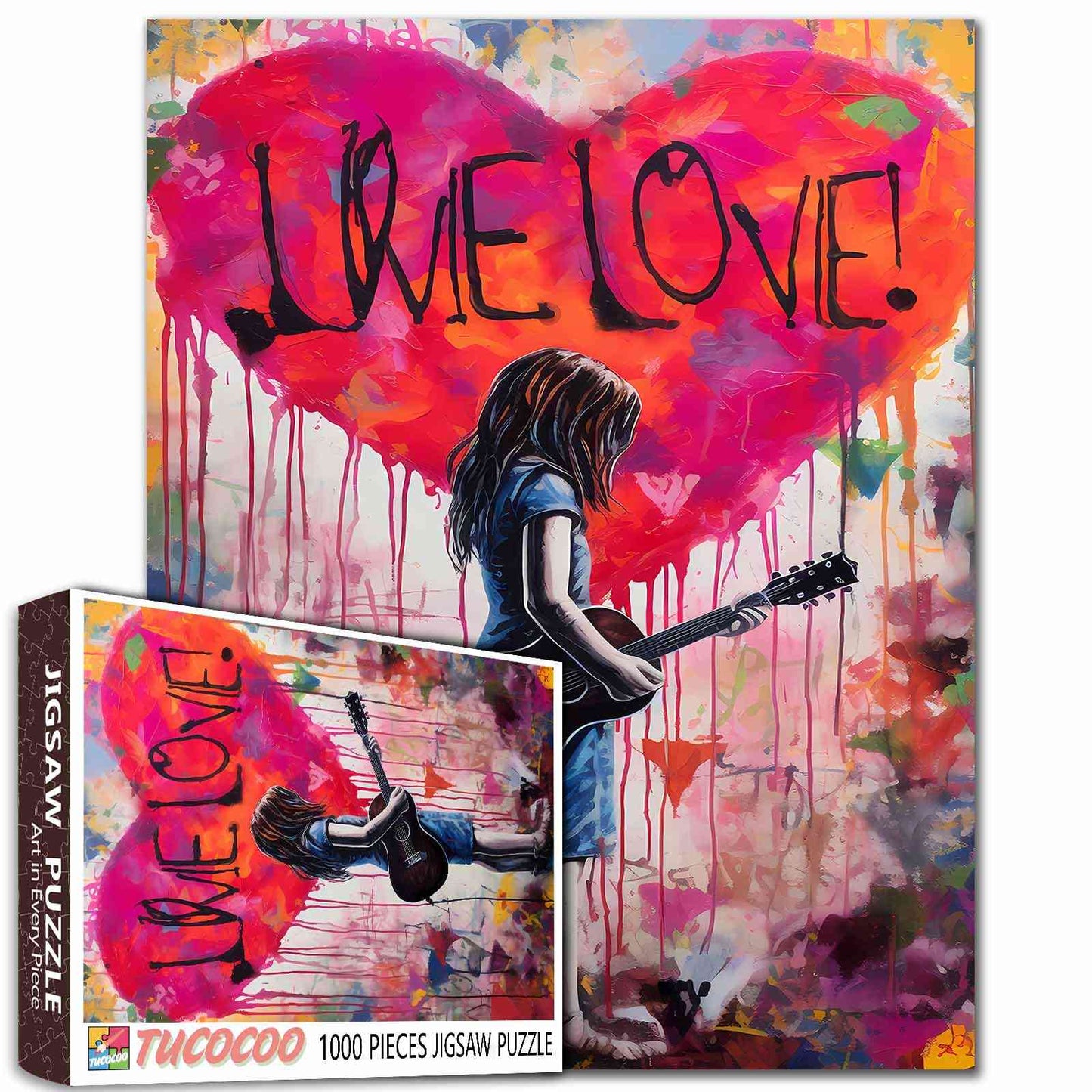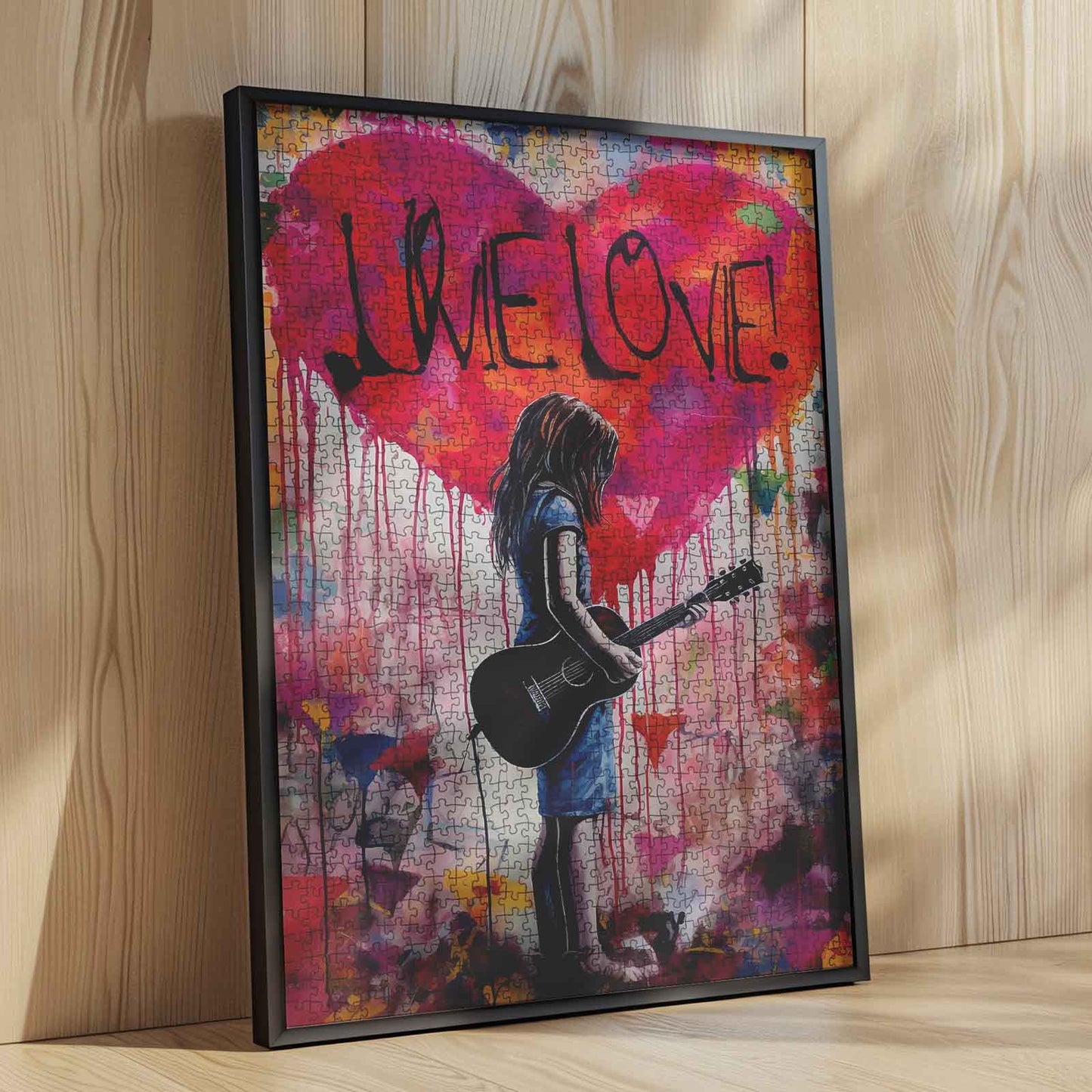 Ein junges Mädchen mit ihrer Gitarre steht vor einem farbenfrohen herzförmigen Graffiti mit dem Schriftzug „LOVE“. Umgeben von bunten Tropfen und Sprühfarbe fängt das Bild einen Moment voller Musik, Kunst und Emotionen ein. Das perfekte Puzzle für alle, die eine Mischung aus Street Art und jugendlichem Geist schätzen.