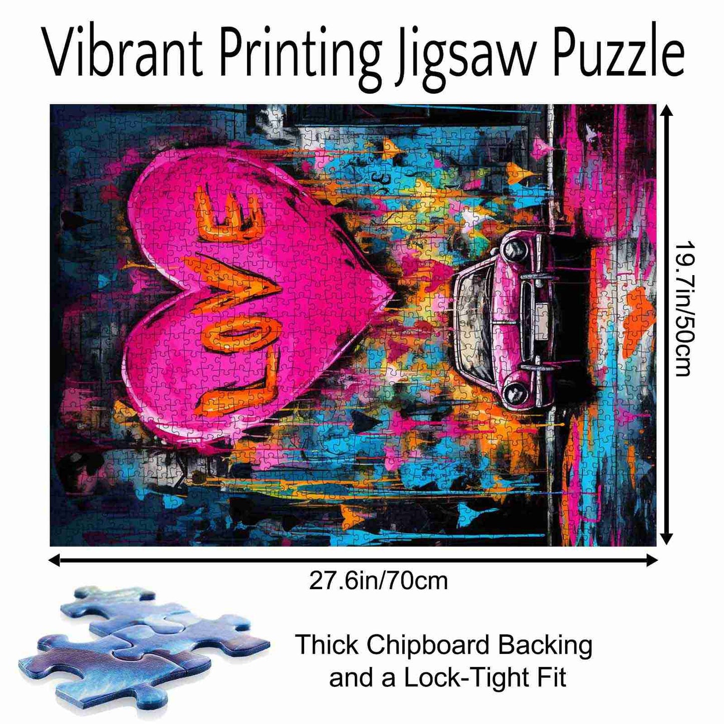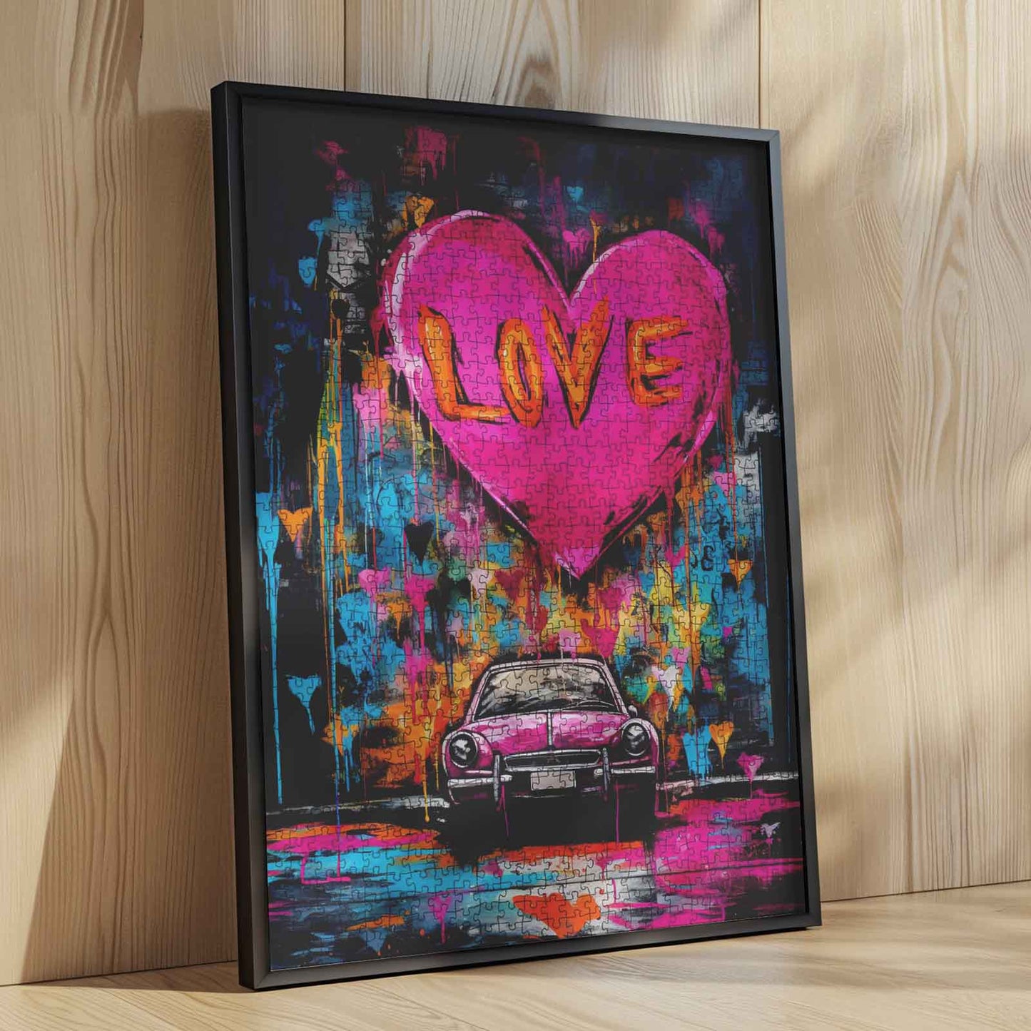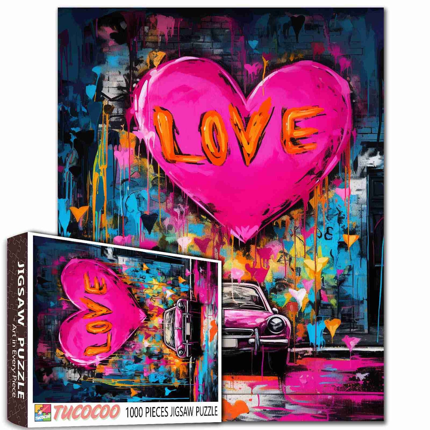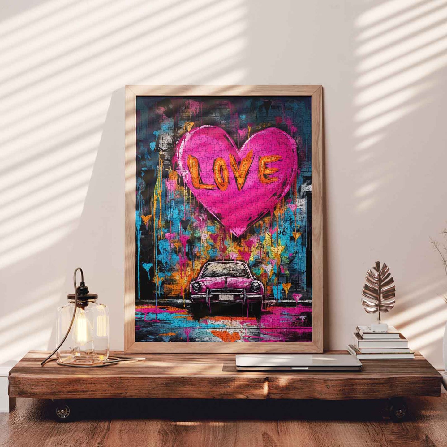 Dieses von Street-Art inspirierte Puzzle sprüht vor Farben und Kreativität. Ein leuchtend pinkes Herz mit der Aufschrift „LOVE“ dominiert die Szene und bildet einen Kontrast zu den kühlen Graffiti-Tönen im Hintergrund. Ein Oldtimer davor verleiht dem modernen urbanen Bild einen Hauch von Nostalgie. Mit jedem Teil nähern Sie sich einem Meisterwerk – perfekt für Kunstliebhaber und Puzzle-Fans gleichermaßen.