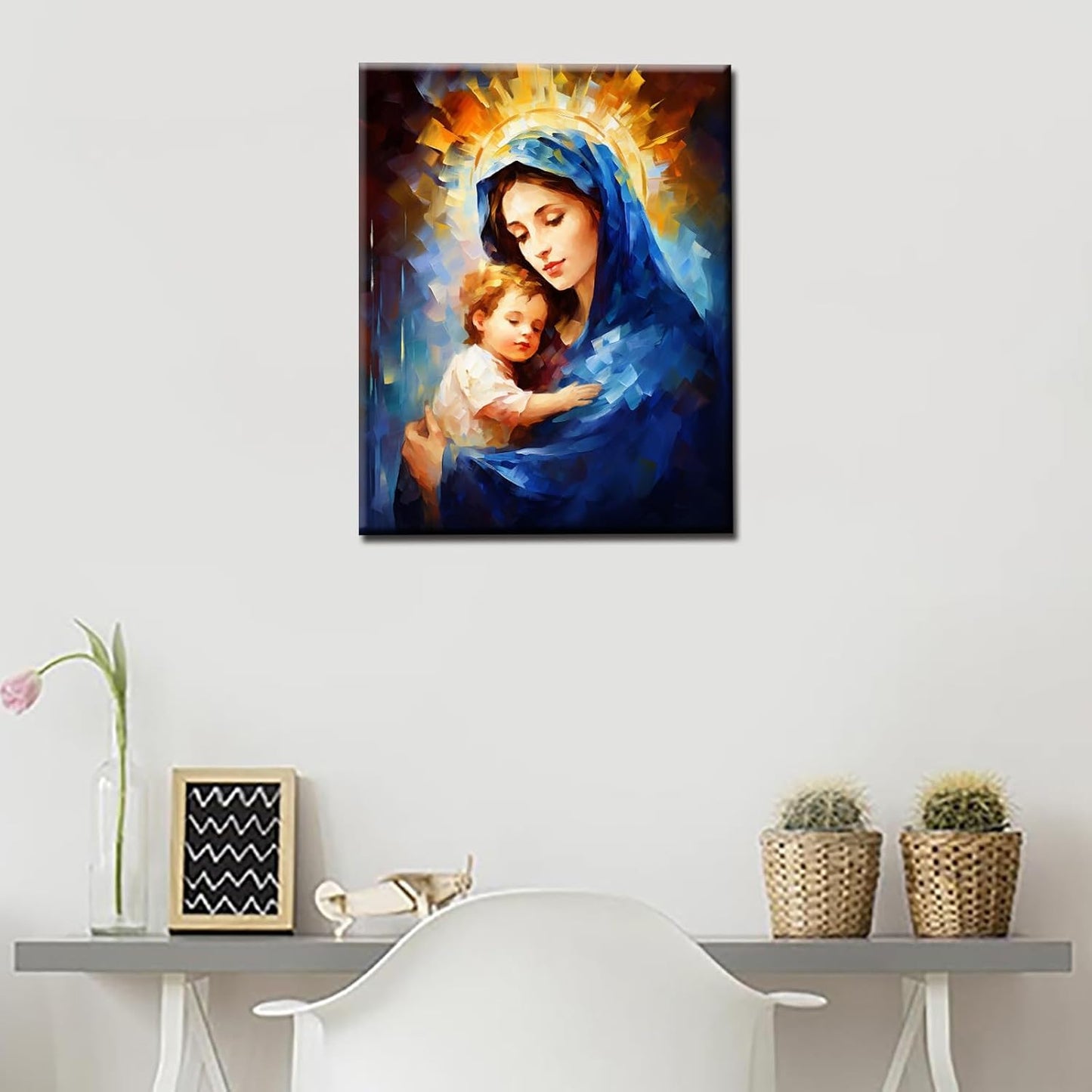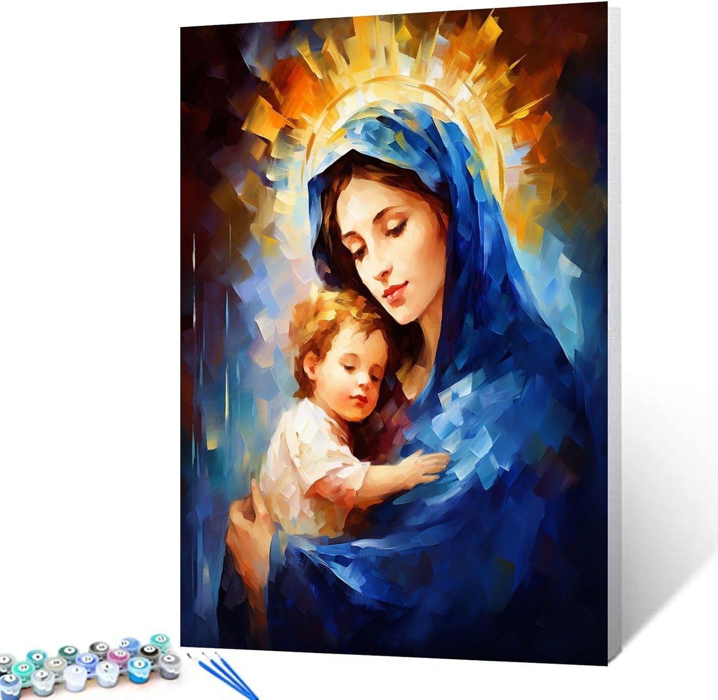 Dieses Jesus-Malen-nach-Zahlen-Set zeigt eine wunderschöne Darstellung der Jungfrau Maria, die das Jesuskind hält. Das Gemälde fängt die Liebe und Hingabe einer Mutter für ihr Kind ein und ist somit eine perfekte Ergänzung für jedes Zuhause. Es ist eine entspannende und lohnende Aktivität, mit der Sie ein atemberaubendes Kunstwerk schaffen können.