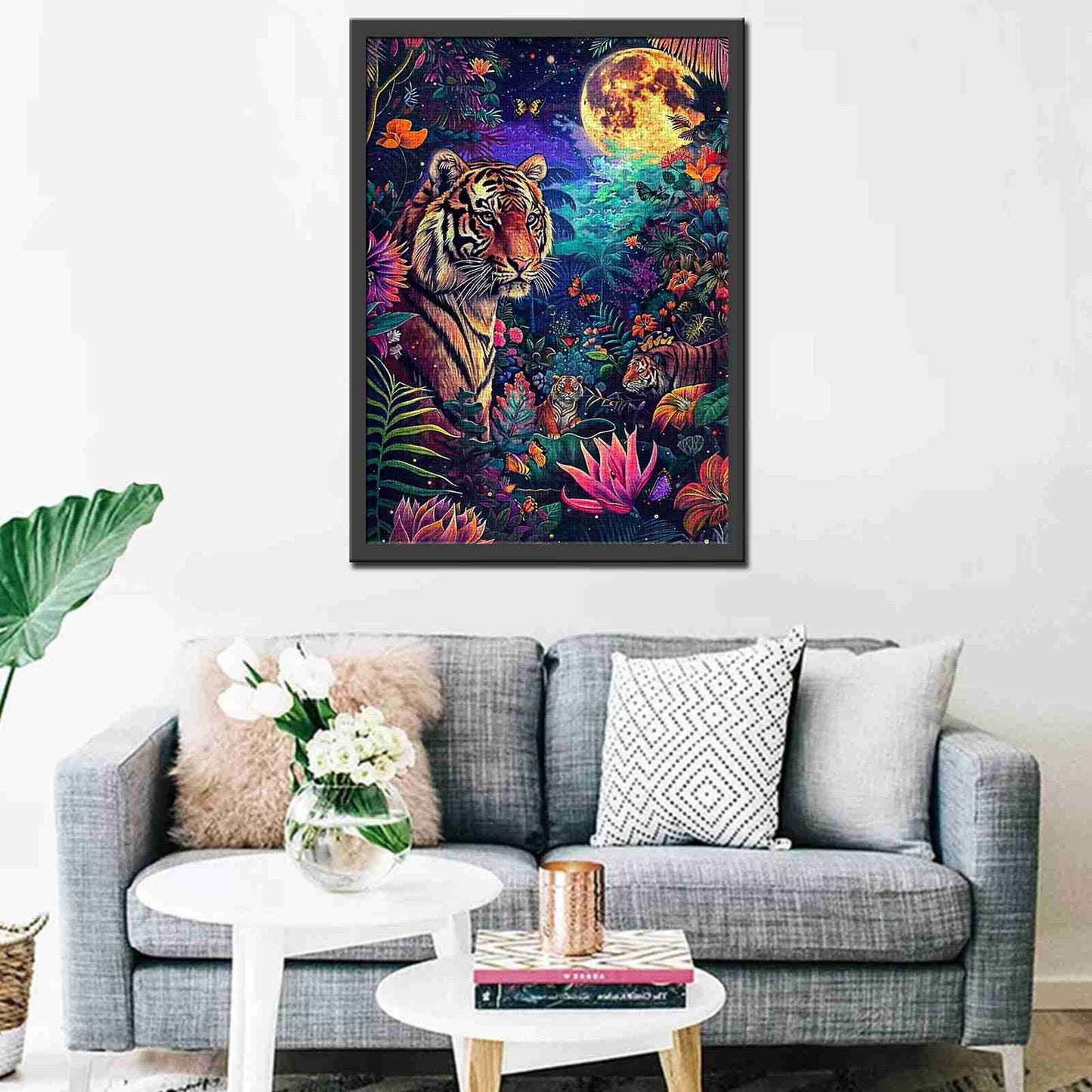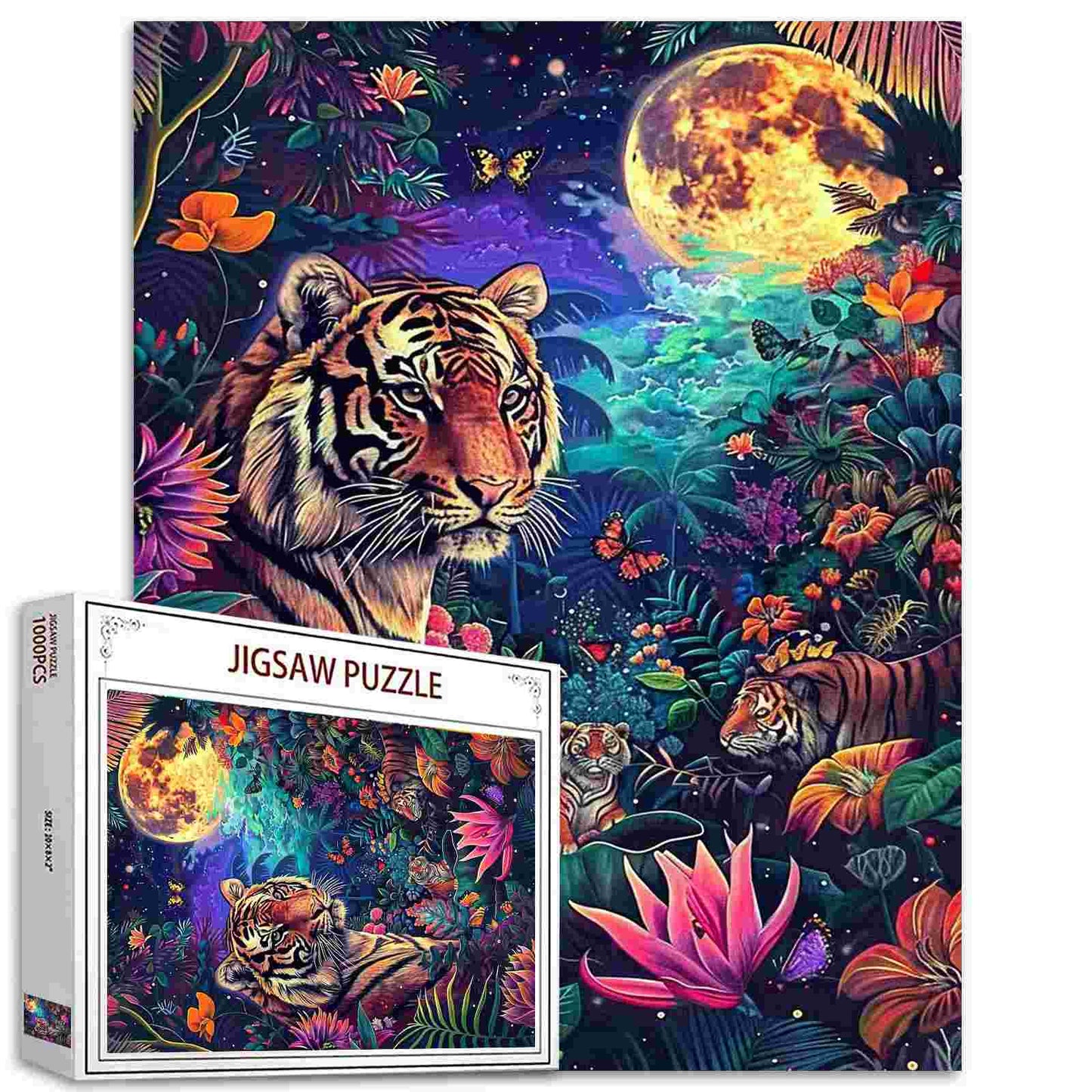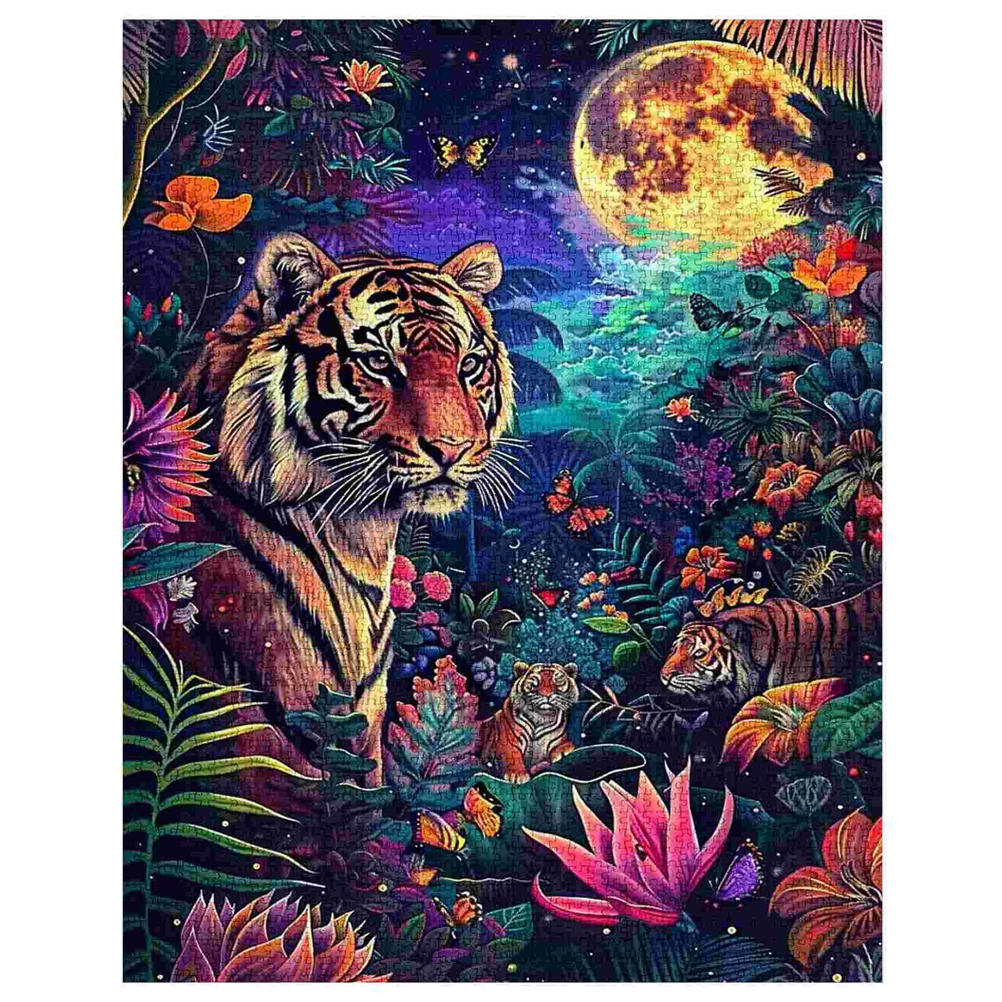 Ein majestätischer Tiger taucht aus den Schatten eines mondbeschienenen Dschungels auf. Seine Augen leuchten sanft im Licht des strahlenden Vollmonds. Umgeben von üppigen tropischen Pflanzen, bunten Schmetterlingen und leuchtenden Blumen wirkt die Szenerie verzaubert und zugleich friedlich. Im Hintergrund ruhen zwei weitere Tiger und verleihen der wilden Umgebung einen Hauch von Geheimnis und Harmonie. Der leuchtende Himmel, die üppige Flora und die ruhige Präsenz der Katze schaffen ein magisches Erlebnis, das den nächtlichen Dschungel Puzzleteil für Puzzleteil zum Leben erweckt.