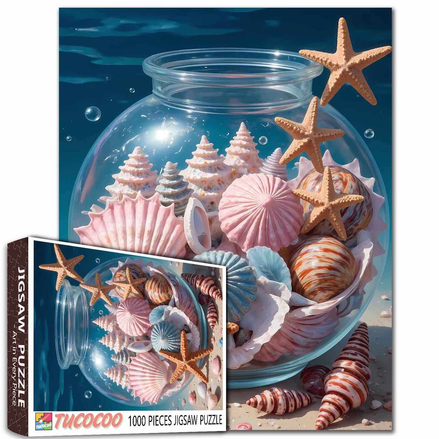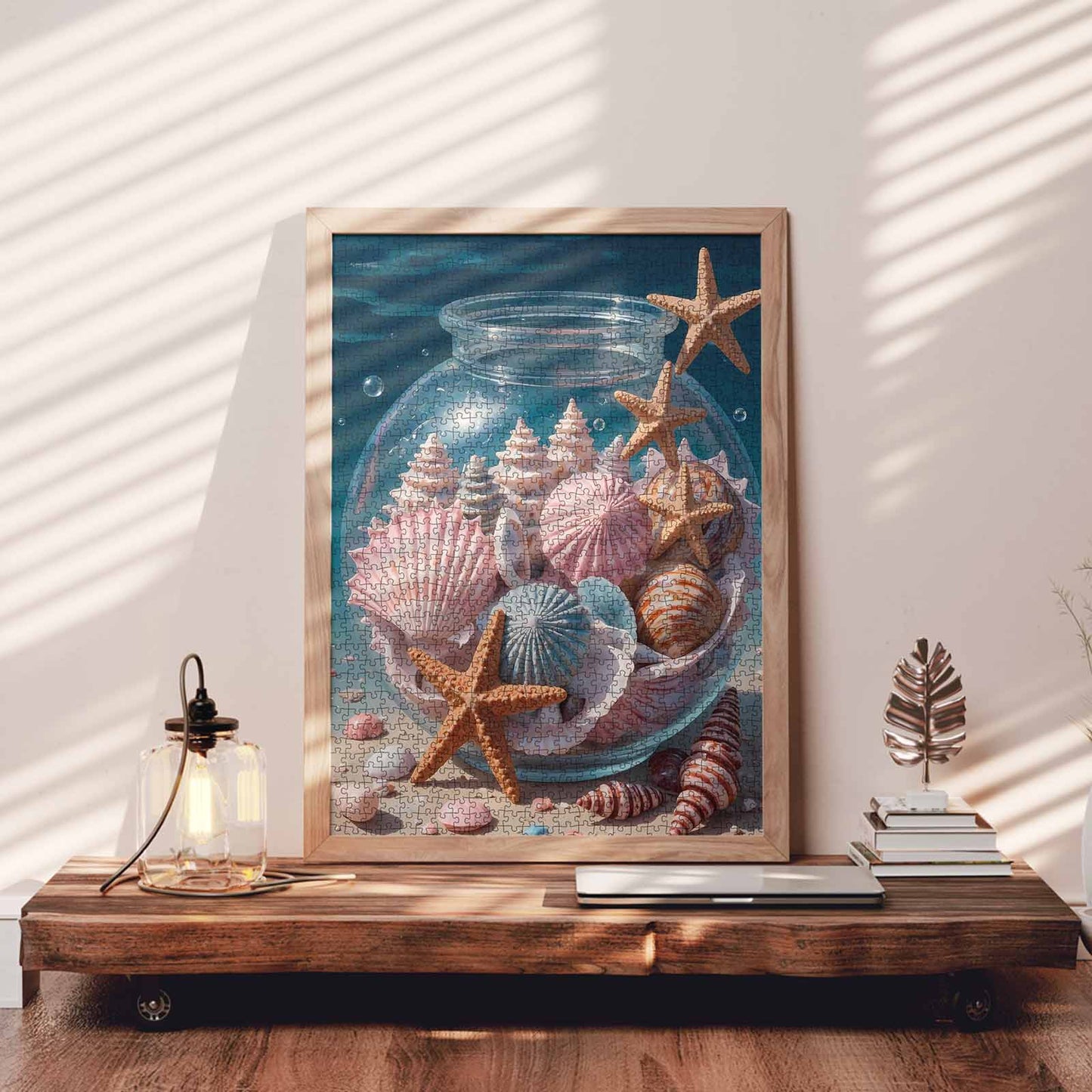 Tauchen Sie ein in eine Unterwasser-Schatzkammer, in der pastellfarbene Muscheln und strukturierte Seesterne in einem kristallklaren Glas schimmern. Sanft auf dem Meeresboden ruhend, fängt dieses Puzzle die stille Schönheit der vergessenen Schätze des Ozeans ein. Von Spiralschnecken bis zu gerippten Venusmuscheln erzählt jede Muschel eine Geschichte von Gezeiten und Zeit. Eine beruhigende Wahl für Meeresliebhaber.