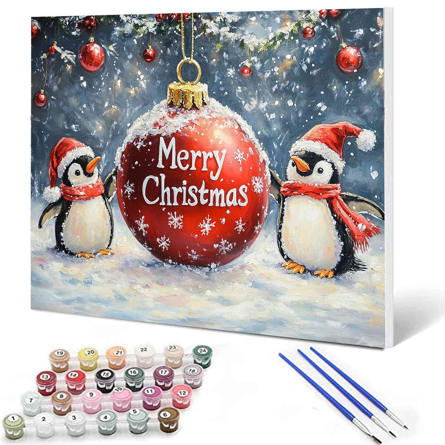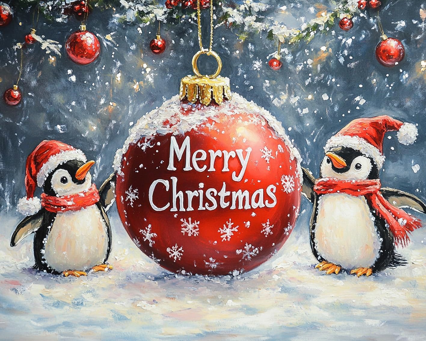 Zwei fröhliche Pinguine mit Weihnachtsmannmützen flankieren ein riesiges rotes Ornament mit der Aufschrift „Frohe Weihnachten“, umgeben von schneebedeckten Girlanden und leuchtenden Kugeln. Ihre warmen Schals und aufgeregten Gesichter bringen Freude in die frostige Weihnachtskulisse. Das Malen dieses herzerwärmenden Moments weckt festliche Stimmung und verleiht Ihrer Weihnachtsdekoration einen fröhlichen Touch.