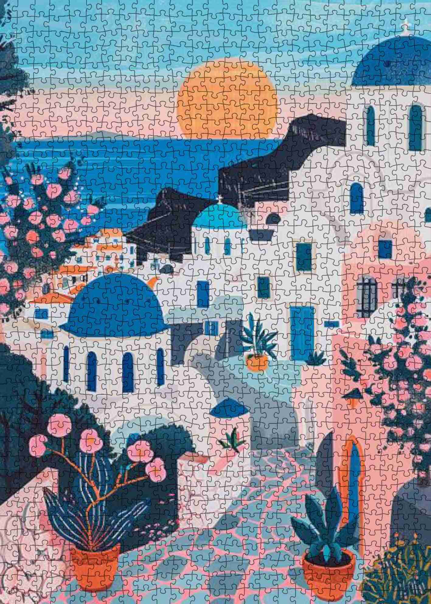 Die goldene Sonne versinkt im tiefblauen Meer und wirft sanftes Licht auf Santorinis weiß getünchte Mauern und die charakteristischen blauen Kuppeln. Ein gepflasterter Weg schlängelt sich durch blühende Terrassen und sonnendurchflutete Häuser und fängt den entspannten Charme dieser berühmten griechischen Insel ein. Topfpflanzen, pfirsichfarbene Schatten und die Stille der Dämmerung machen dies zu einem traumhaften Rückzugsort. Jedes Puzzleteil entführt Sie tiefer in die Wärme, Eleganz und stille Freude des mediterranen Lebens.