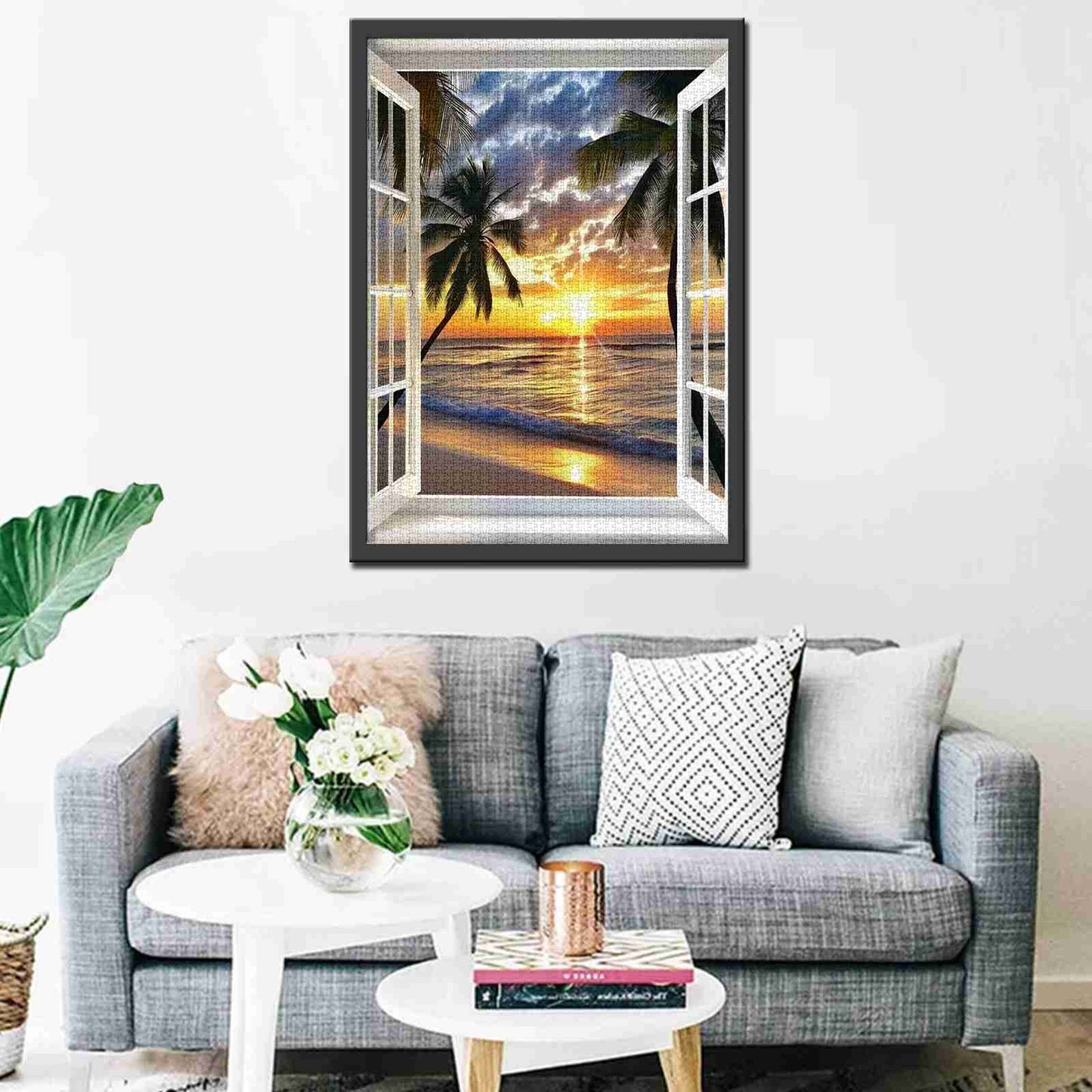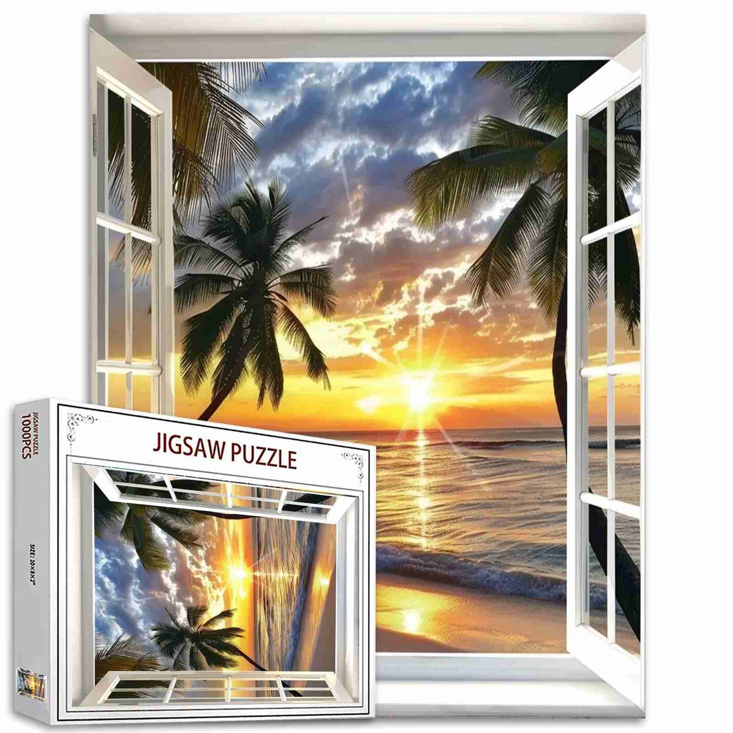 Ein atemberaubender Anblick entfaltet sich, wenn die Sonne hinter dem Horizont verschwindet und den Himmel in Orange-, Rosa- und Goldtönen taucht. Umrahmt von sanft wiegenden Palmen und einem offenen Fenster fängt die Szene die ruhige Schönheit eines tropischen Strandes bei Sonnenuntergang ein. Jedes Stück fügt sich zusammen und schafft einen ruhigen, in der Zeit eingefrorenen Moment.