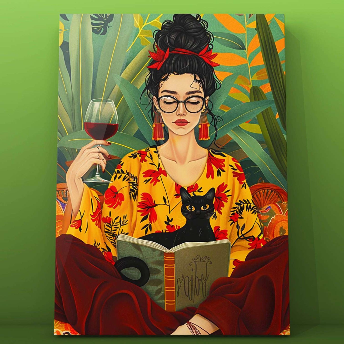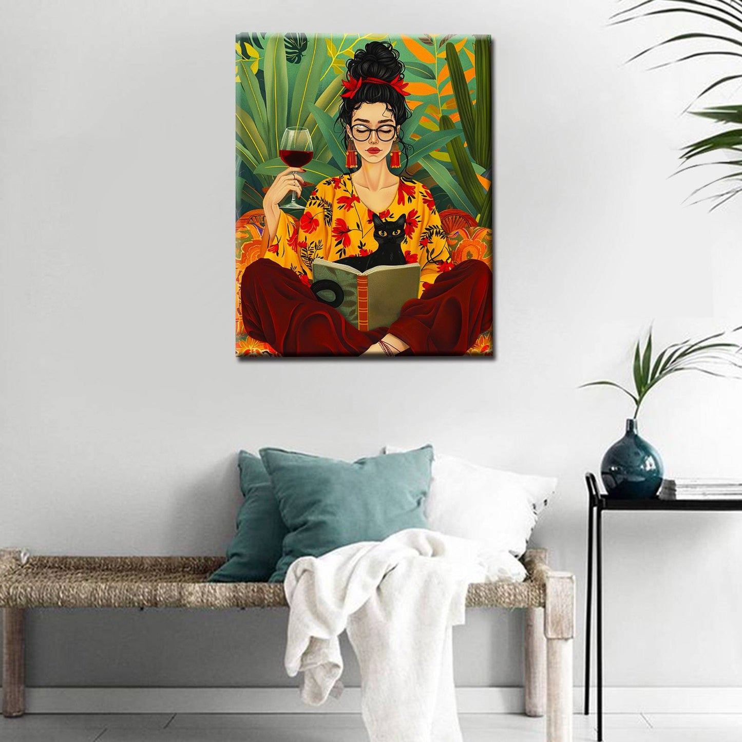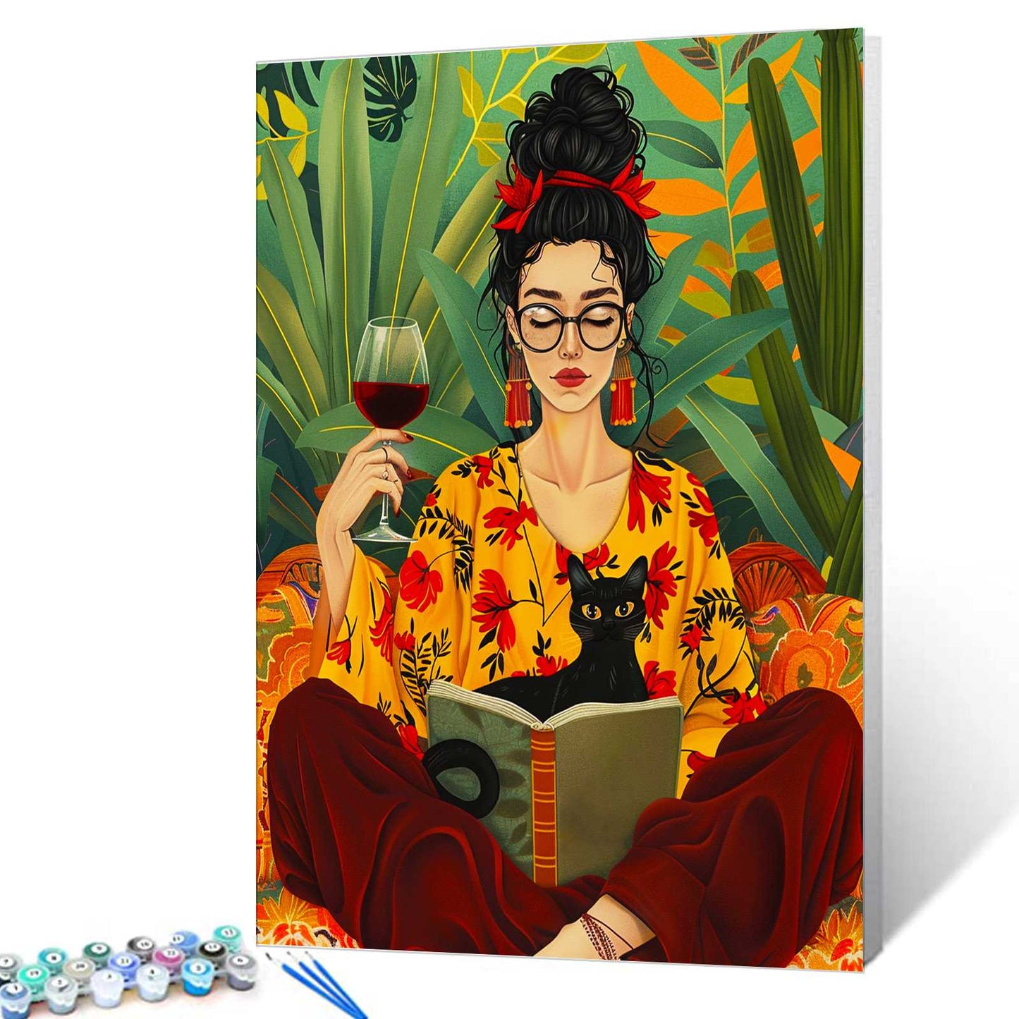 Fangen Sie Eleganz mit diesem Malen nach Zahlen ein, das eine stilvolle Frau zeigt, die mit ihrer schwarzen Katze vor einem üppigen und lebendigen Hintergrund liest. Ihr geblümtes Outfit, ihr Glas Rotwein und die komplizierten Details erwecken dieses Design zum Leben. Perfekt zum Entspannen und um Ihrem Dekor Charme zu verleihen.