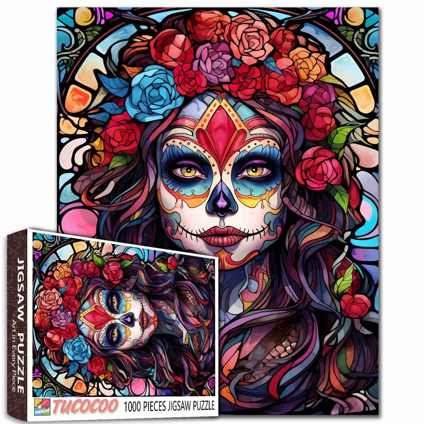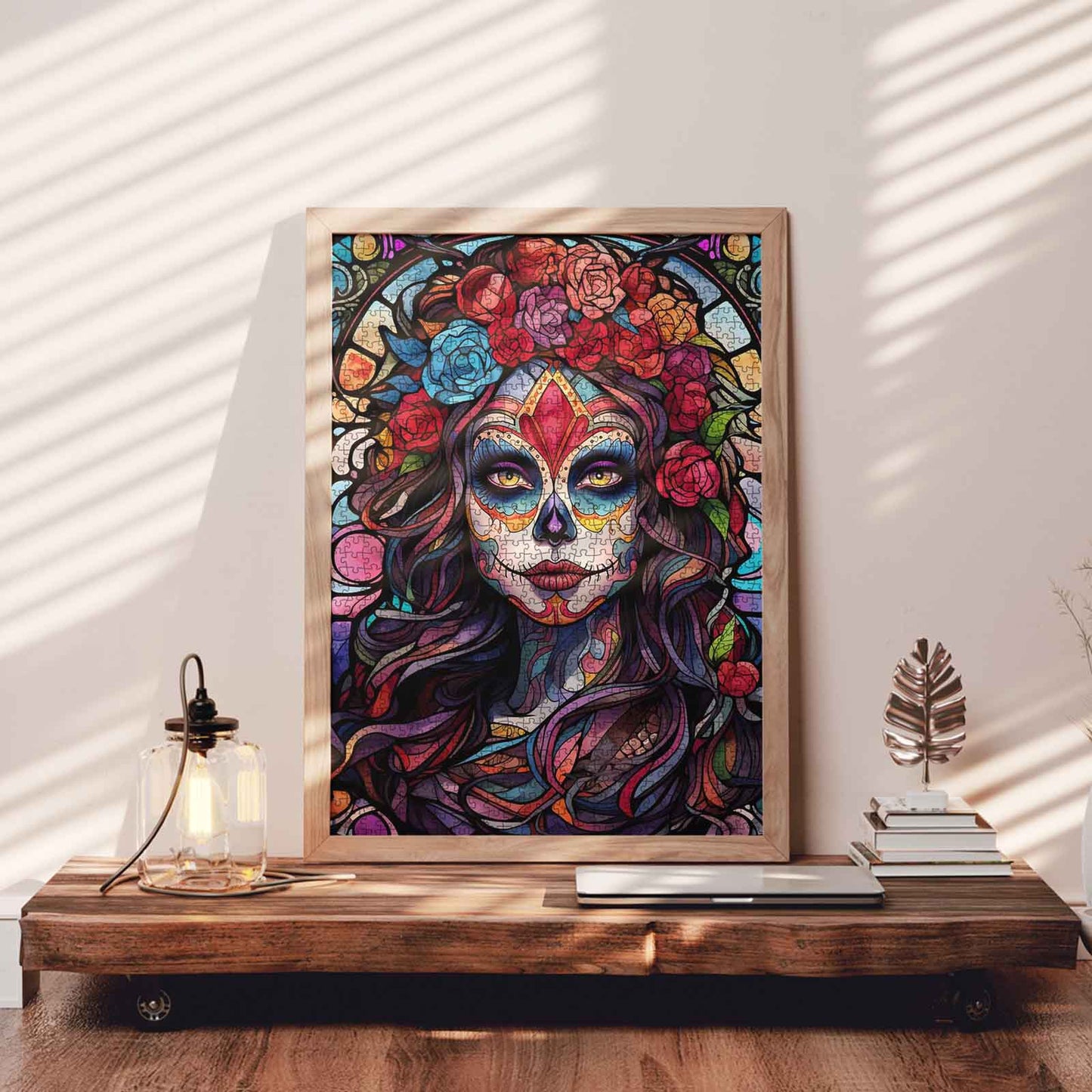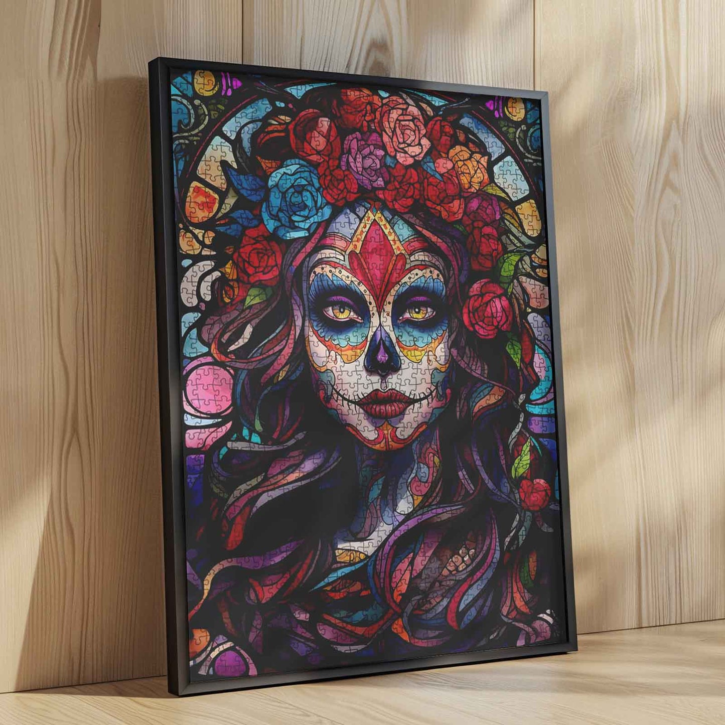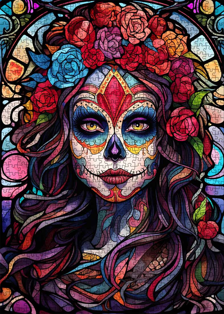 Eine beeindruckende Frau blickt kühn geradeaus. Ihr Gesicht ist mit filigranen Zuckerschädel-Motiven verziert, eingerahmt von einer leuchtenden Rosenkrone. Dieses Kunstwerk verbindet den Geist des Día de los Muertos mit der Eleganz von Buntglas und schafft so eine atemberaubende Fusion aus Farbe, Symbolik und weiblicher Kraft. Ihre ausdrucksstarken Augen und ihr wallendes Haar sind in wirbelnden Linien und juwelenfarbenen Farbtönen eingefangen, wodurch jedes Puzzleteil zu einem kleinen Fenster zu Feier, Erinnerung und künstlerischer Schönheit wird. Perfekt für alle, die Kultur, Drama und lebendigen Ausdruck lieben.