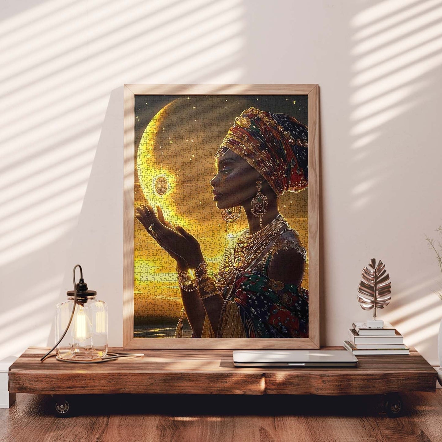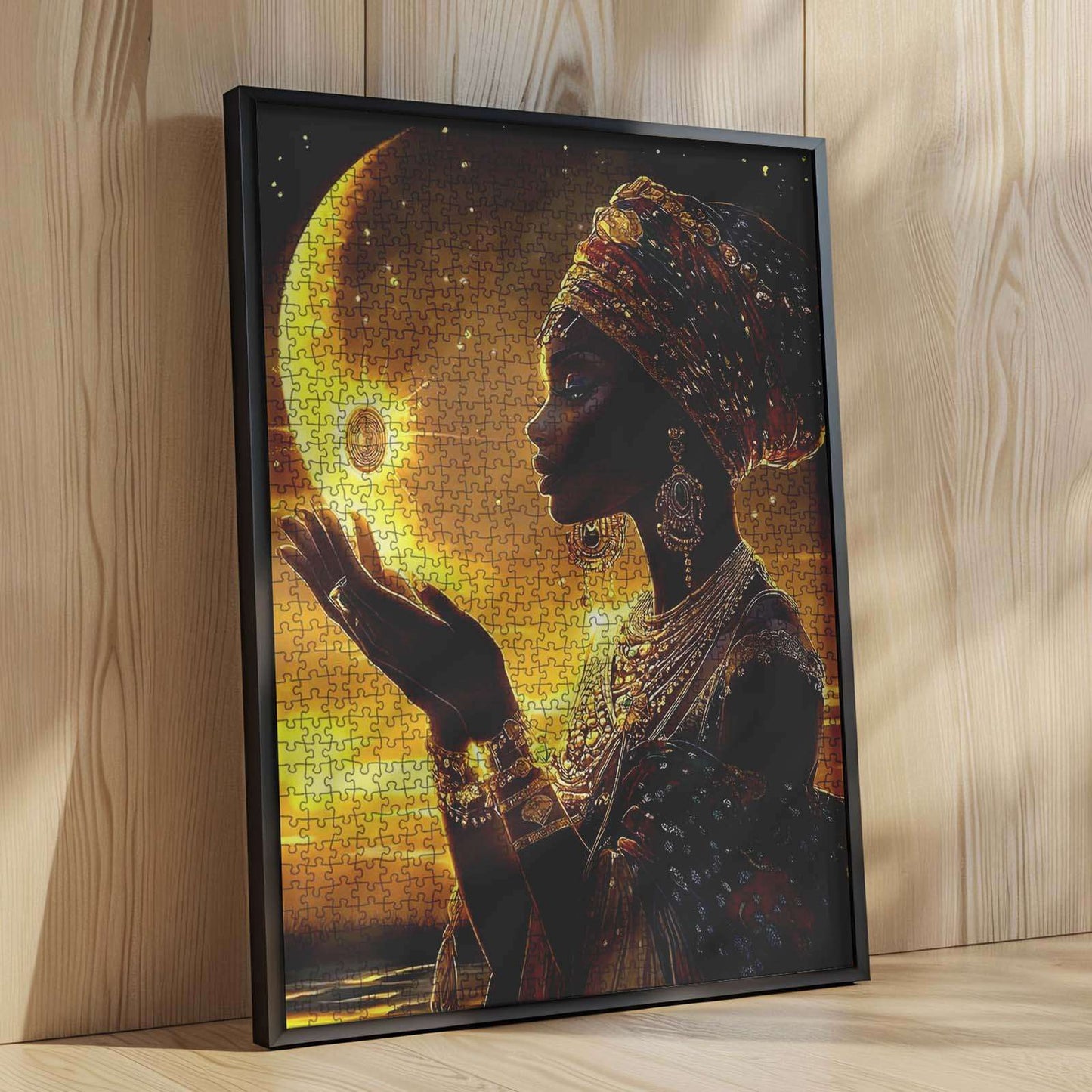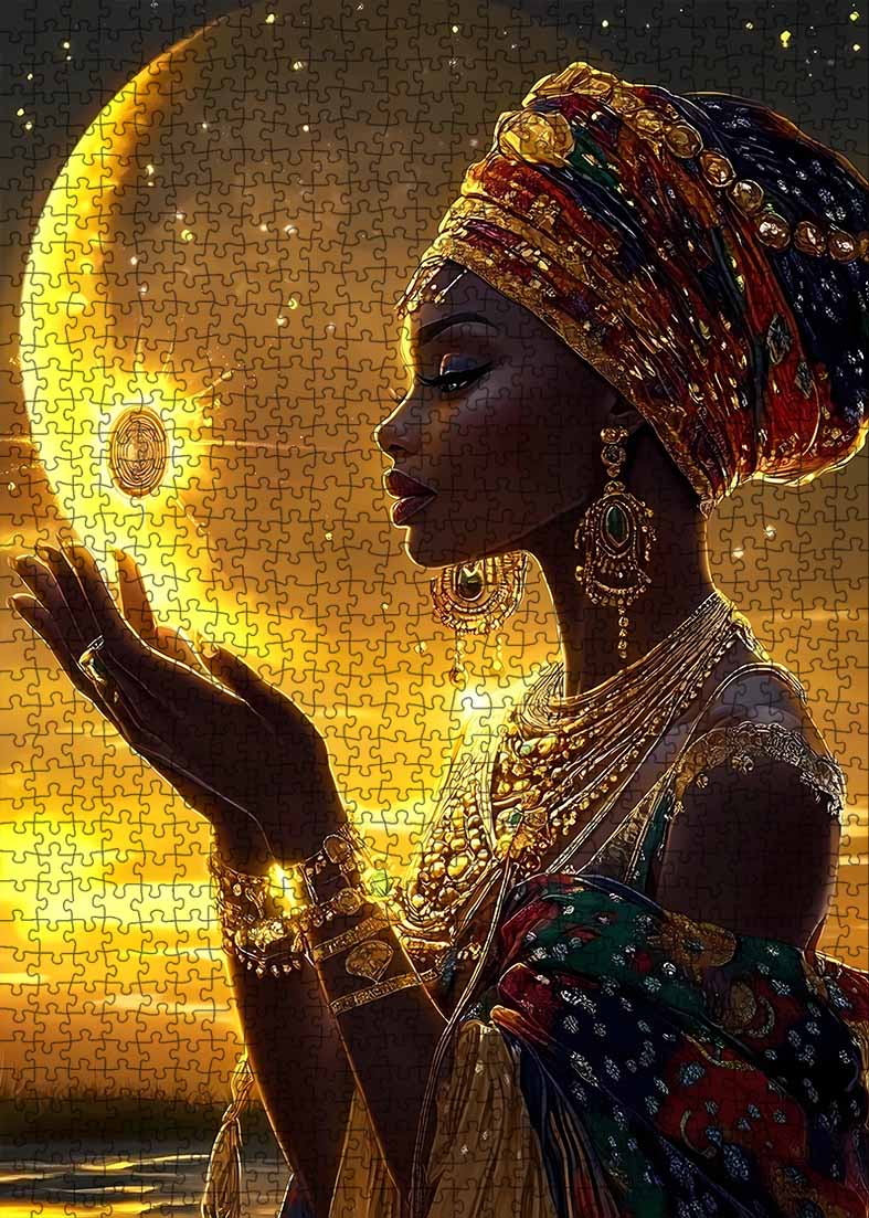 Tauchen Sie mit unserem Puzzle „Afrikanische Eleganz“ in das reiche Erbe und die atemberaubende Schönheit Afrikas ein. Dieses Stück fängt die Anmut einer majestätischen afrikanischen Königin im Mondlicht ein, geschmückt mit traditioneller Kleidung und Schmuck, und spiegelt die lebendige Kultur und Kunstfertigkeit des Kontinents wider. Perfekt für diejenigen, die komplizierte Details und kulturelle Erkundung schätzen, lädt jedes Puzzleteil Sie ein, eine Geschichte aus Erbe und Schönheit zusammenzusetzen.