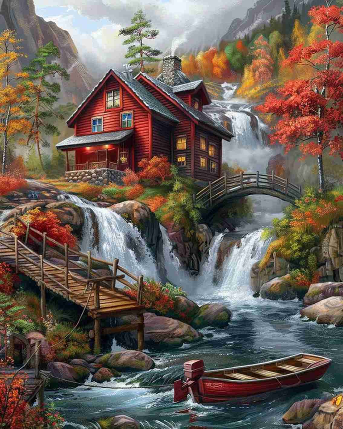 Entfliehen Sie mit unserem Malen nach Zahlen „Herbstliche Seehütte“ in ein ruhiges Refugium am See. Diese detailreiche Szene zeigt eine bezaubernde rote Hütte an einem Wasserfall, umrahmt von leuchtenden Herbstbäumen und einer Holzbrücke. Ein kleines Boot liegt auf dem ruhigen See und verstärkt die gemütliche, friedliche Atmosphäre. Perfekt für alle, die naturinspirierte Kunst lieben.