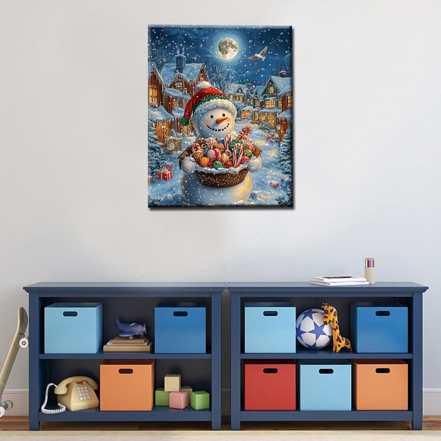 Ein fröhlicher Schneemann trotzt dem verschneiten Dorf unter dem strahlenden Vollmond und hält einen Korb voller festlicher Süßigkeiten und Bonbons in den Händen. Umgeben von warm beleuchteten Hütten und fallendem Schnee bringt er festliche Freude an jede Haustür. Perfekt für alle, die Weihnachtszauber und gemütliche Winterlandschaften lieben.