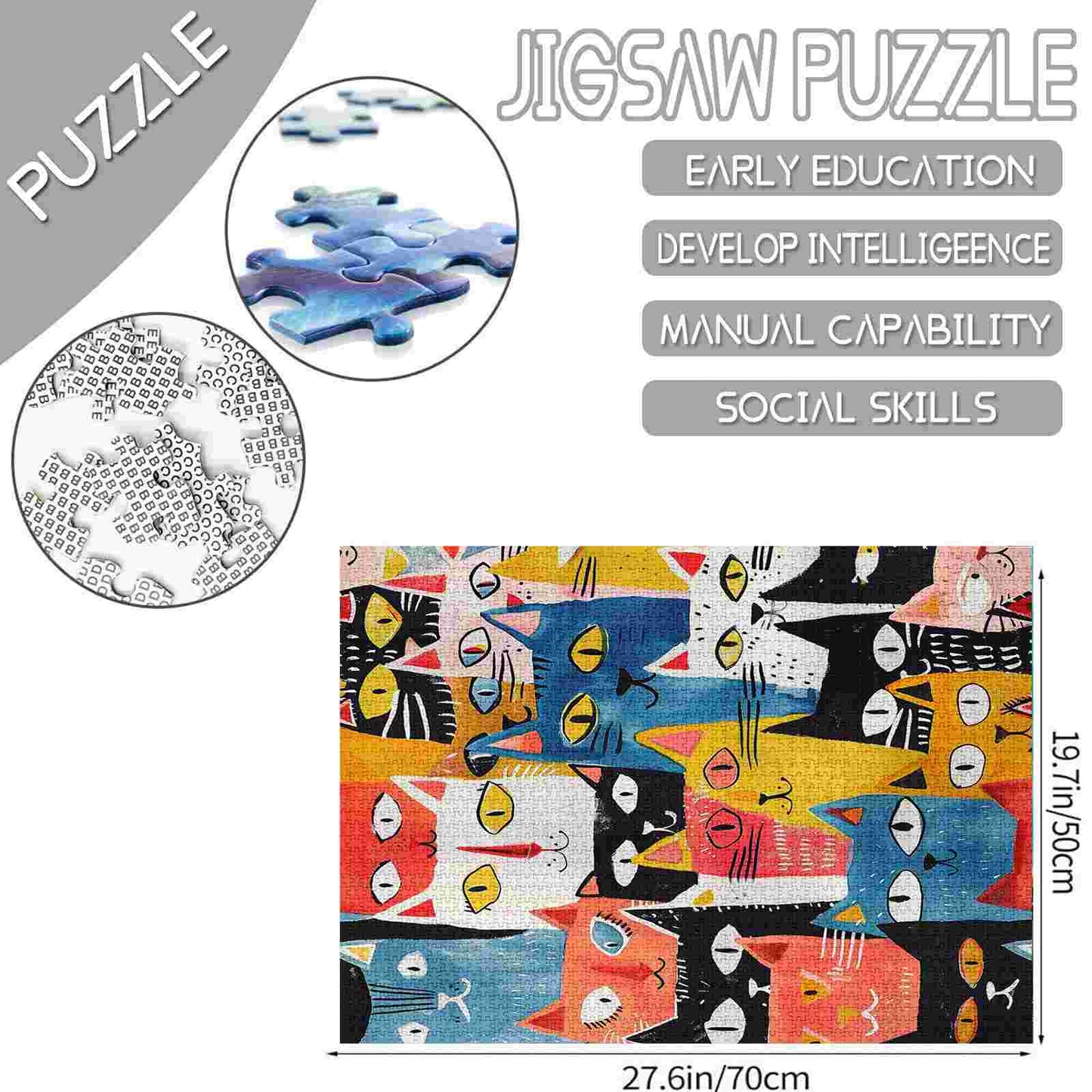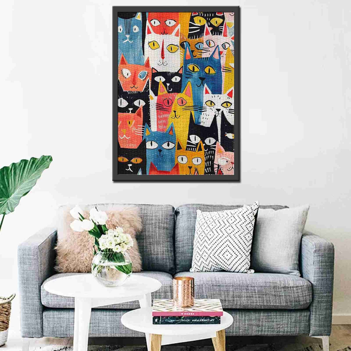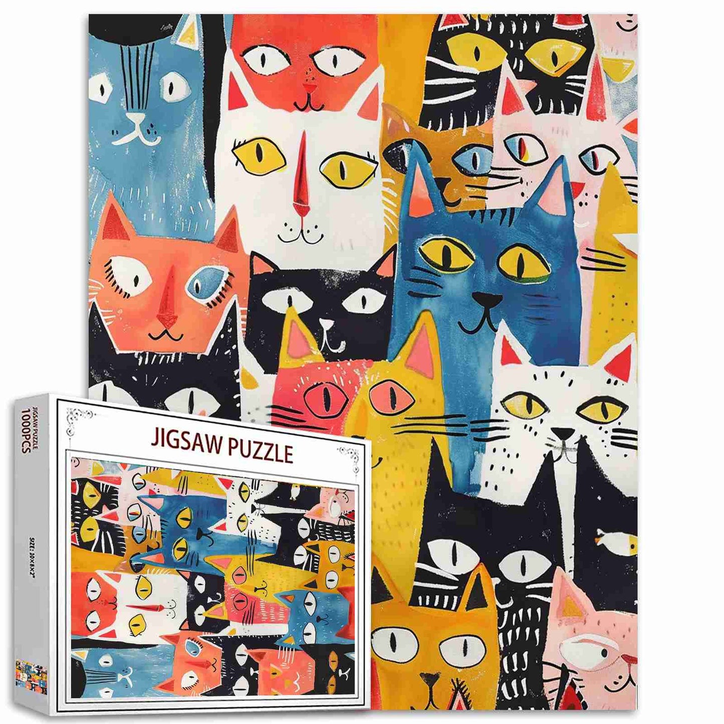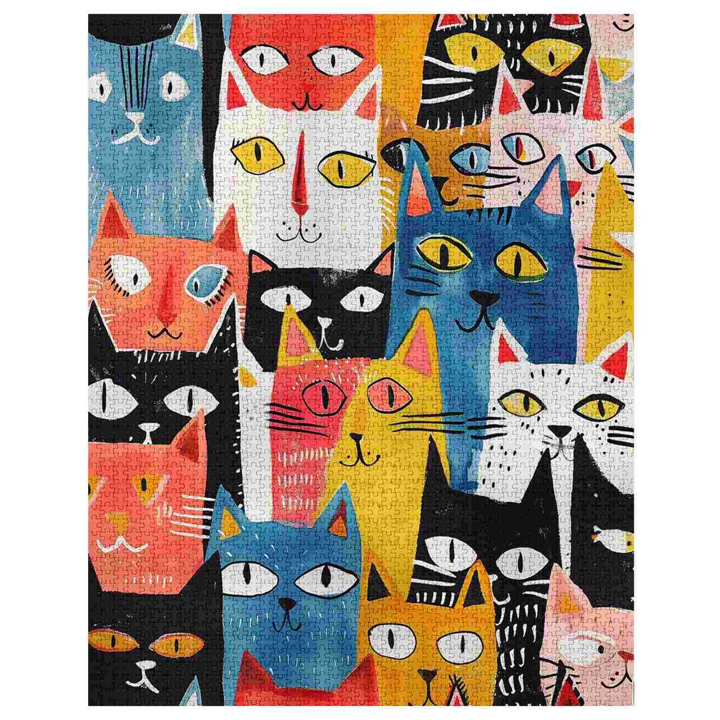 Eine Horde verschrobener Katzen mit großen Augen in allen erdenklichen Farben erfüllt die Szene mit lebendiger Energie und Laune. Von Zitronengelb bis Jeansblau – ihre abstrakten Ausdrücke und ungewöhnlichen Blicke verleihen dem Puzzle den Charakter eines modernen Kunstgemäldes. Jede Katze scheint ihre eigene Persönlichkeit zu haben, die aus jeder Ecke des Spielfelds hervorlugt und Sie einlädt, innezuhalten und eine Galerie katzenartigen Charmes zusammenzusetzen. Es ist nicht nur ein Puzzle – es ist ein entzückendes Farbenspiel, ein skurriles Spiel mit Ausdruck, das sich mit jedem platzierten Teil entfaltet.