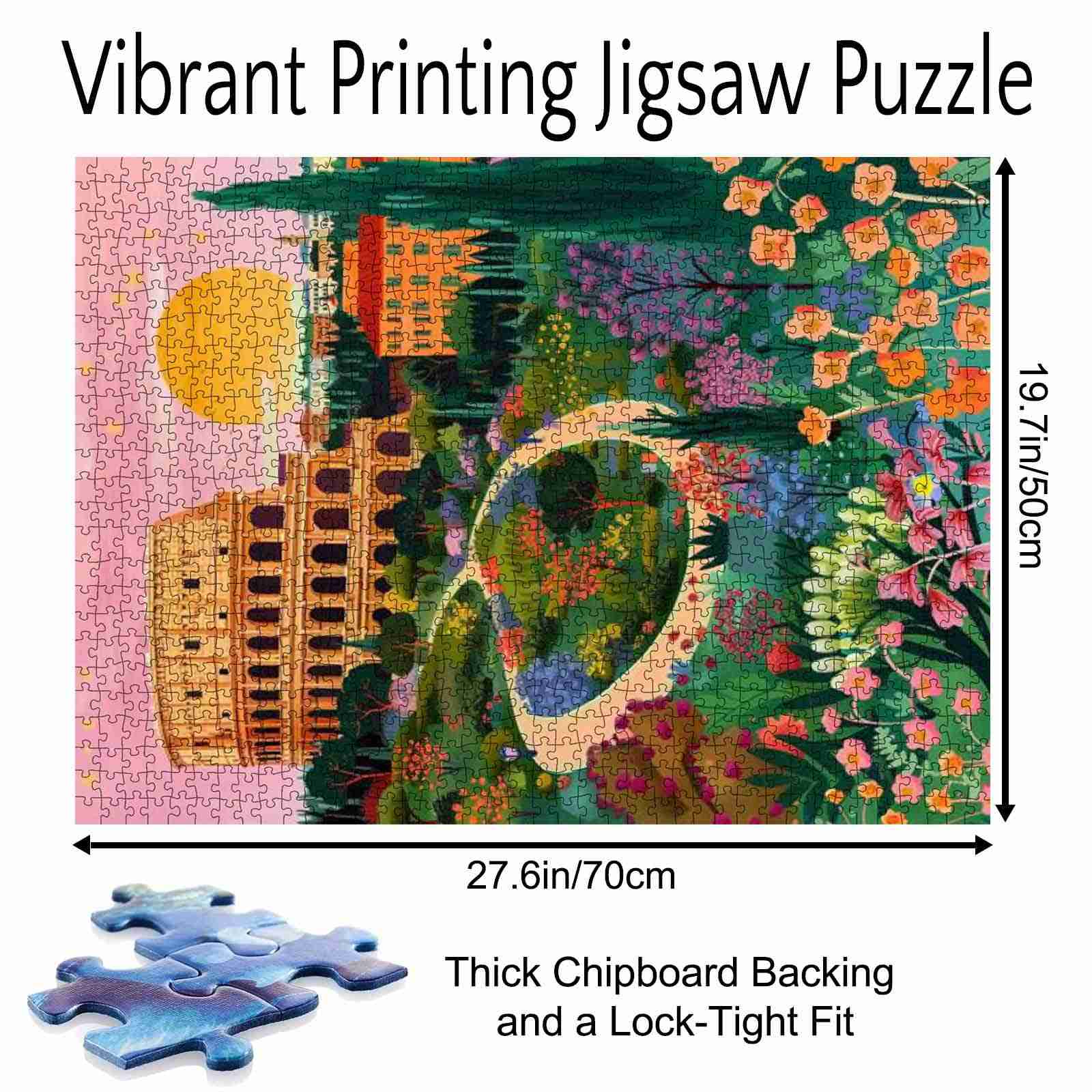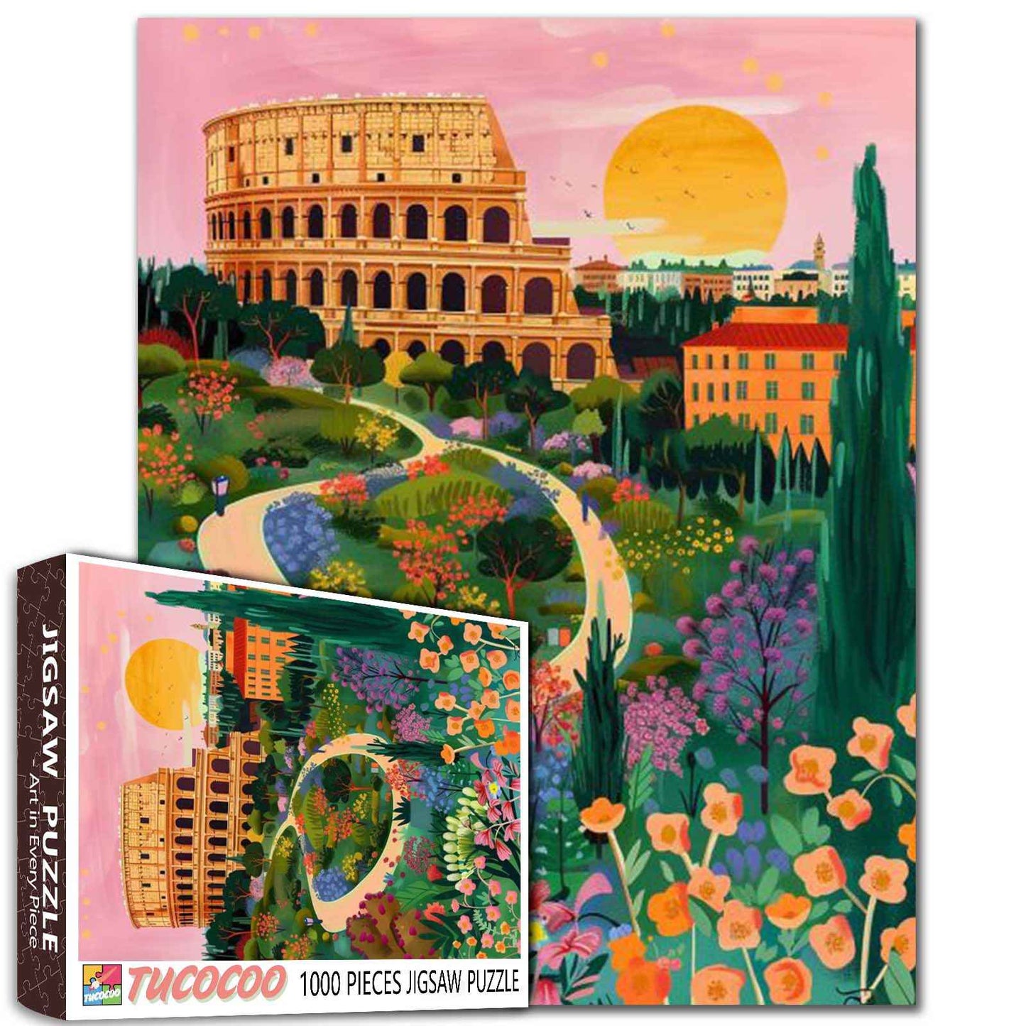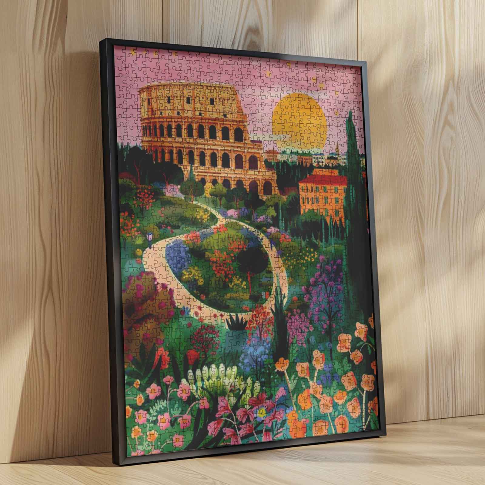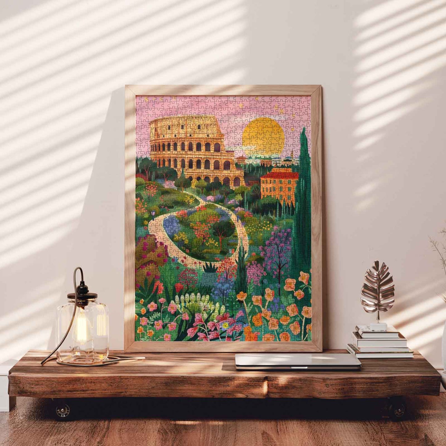 Schlendern Sie über einen gewundenen Gartenweg zum goldenen Kolosseum und genießen Sie den Glanz eines italienischen Sonnenuntergangs. Eingerahmt von Zypressen, blühenden Wildblumen und orangefarbenem Himmel fängt diese Szene die friedliche Seite der legendären Pracht Roms ein. Von sonnenbeschienenen Blütenblättern bis hin zu majestätischem Mauerwerk – jedes Puzzleteil offenbart in jeder Ecke Schichten von Geschichte und Romantik.