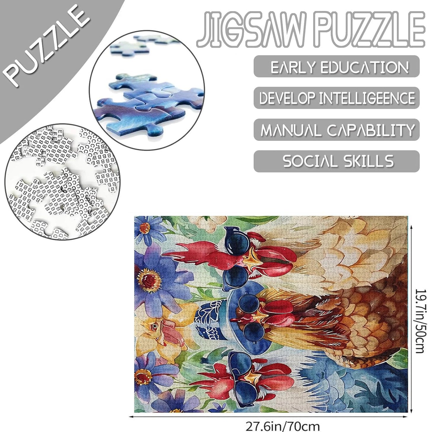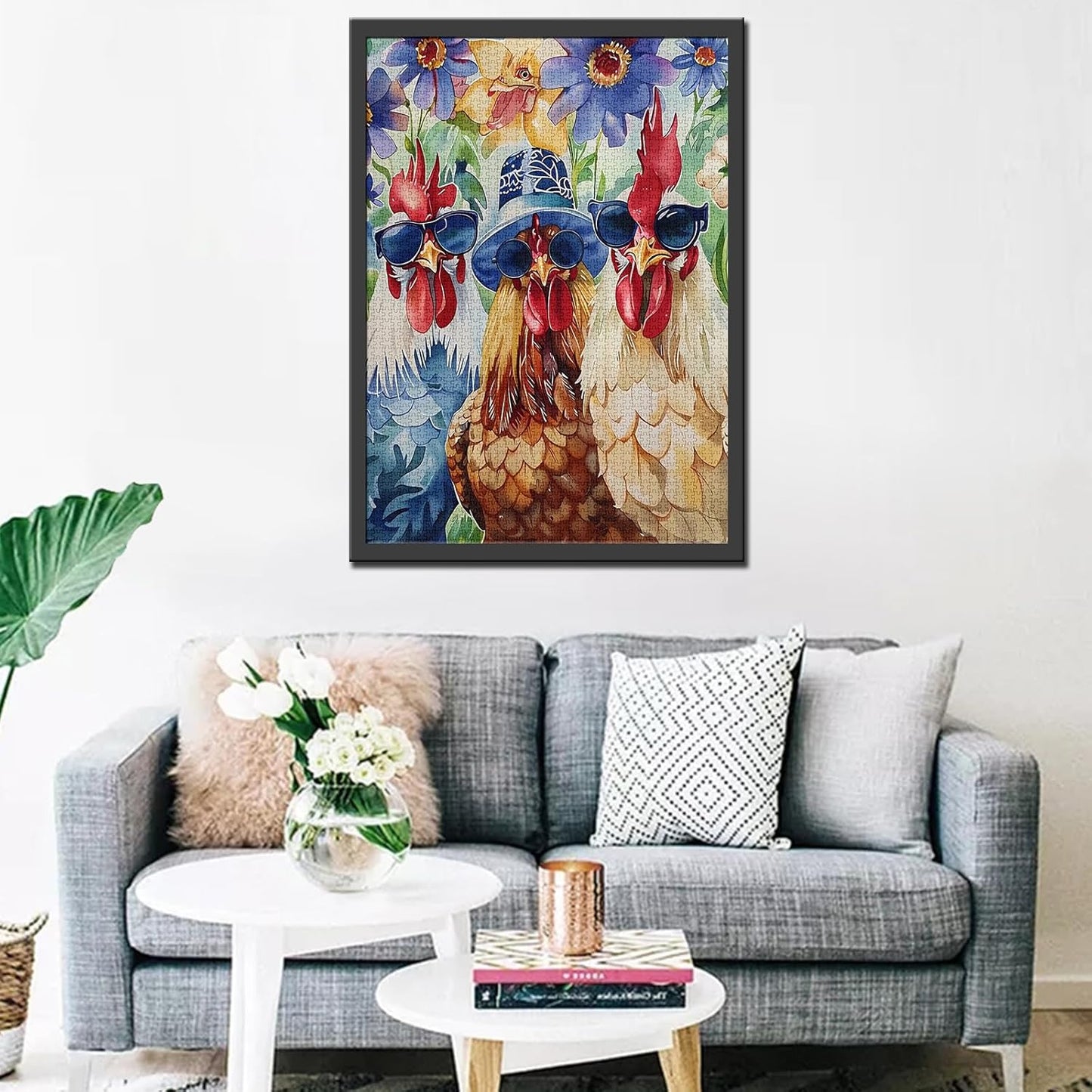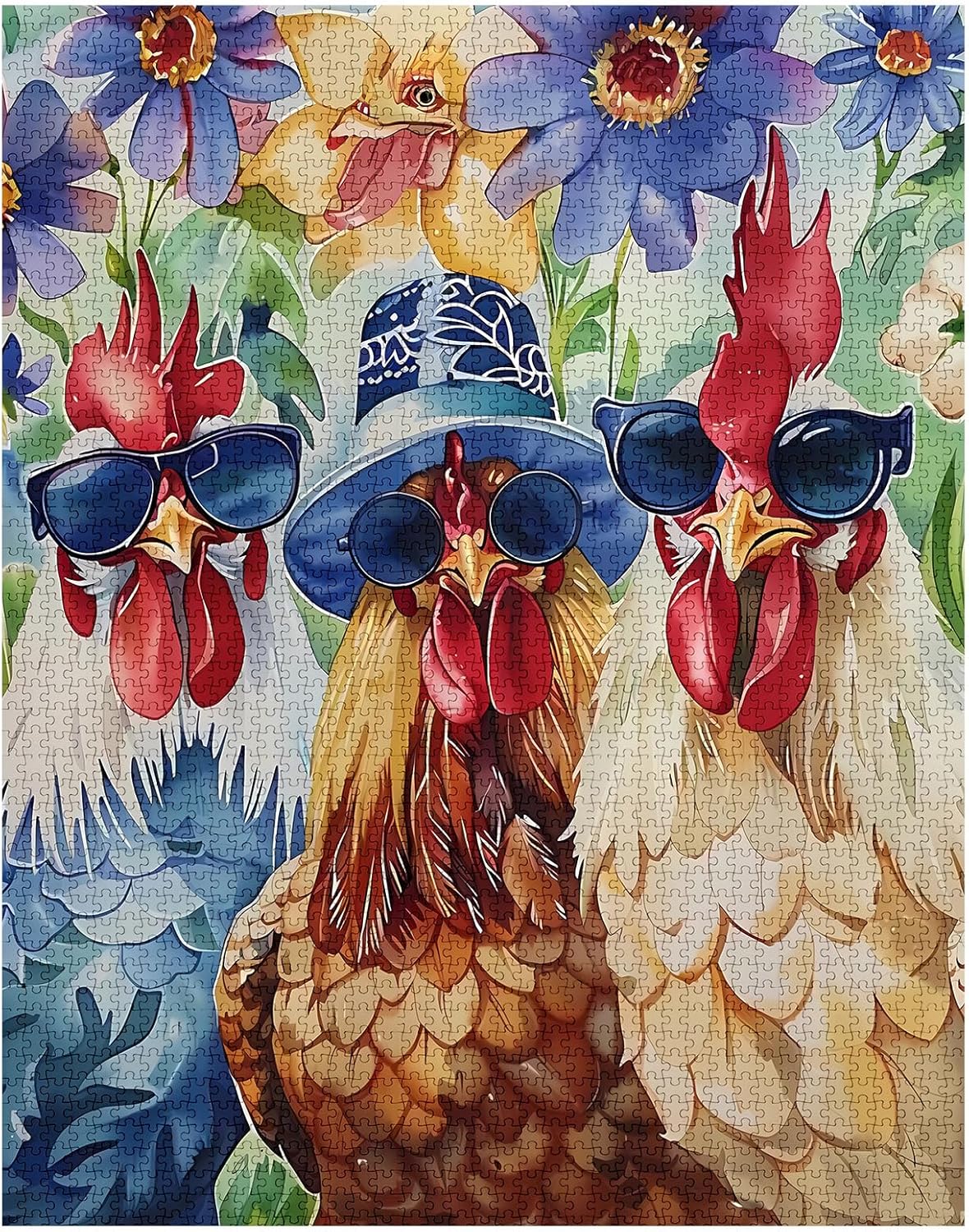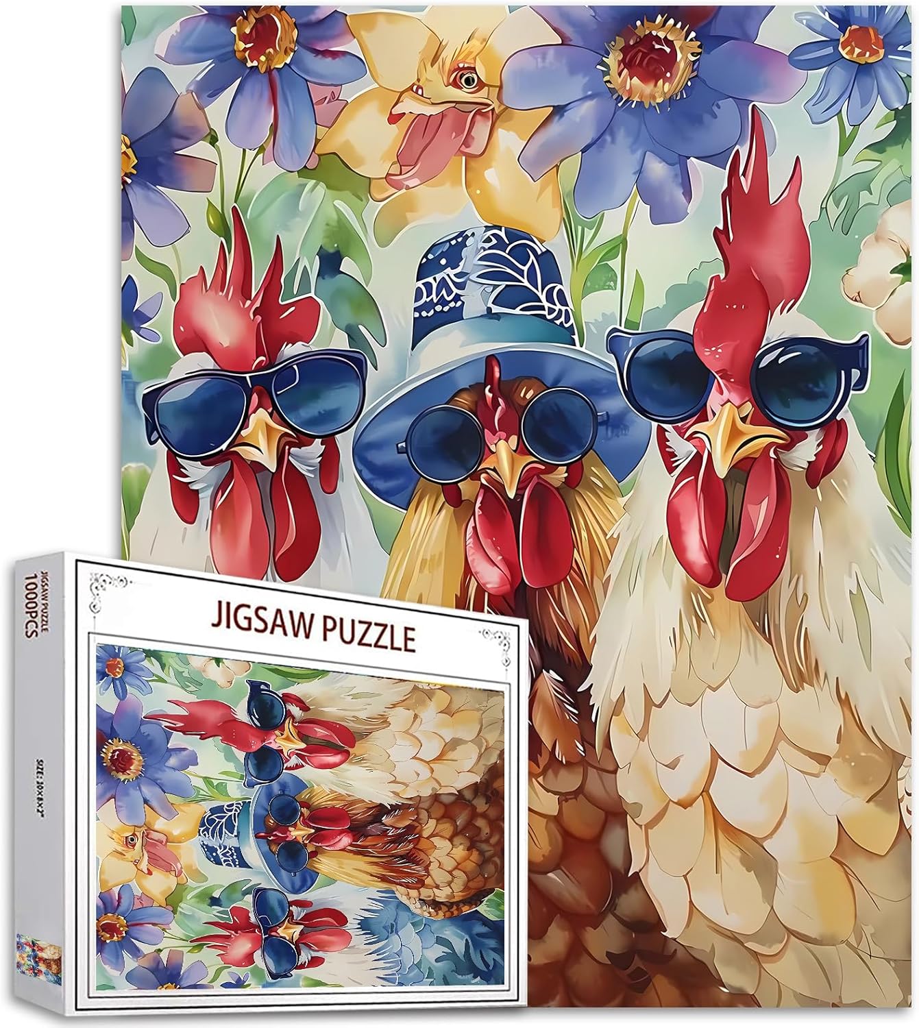 Drei skurrile Hühner posieren wie Modeikonen, jedes mit übergroßen Sonnenbrillen und der dazu passenden Attitüde. Eines trägt sogar einen stylischen blauen Hut, der ihren mutigen Persönlichkeiten Flair verleiht. Dahinter sorgt eine Kulisse aus übergroßen lila und blauen Blumen für eine skurrile, sommerliche Stimmung. Die Szene vereint Humor und Charme und verwandelt einen gewöhnlichen Moment auf dem Bauernhof in ein verspieltes Porträt voller Persönlichkeit. Beim Zusammensetzen dieses Puzzles fühlt es sich an, als würde man jeden Charakter Stück für Stück kennenlernen.