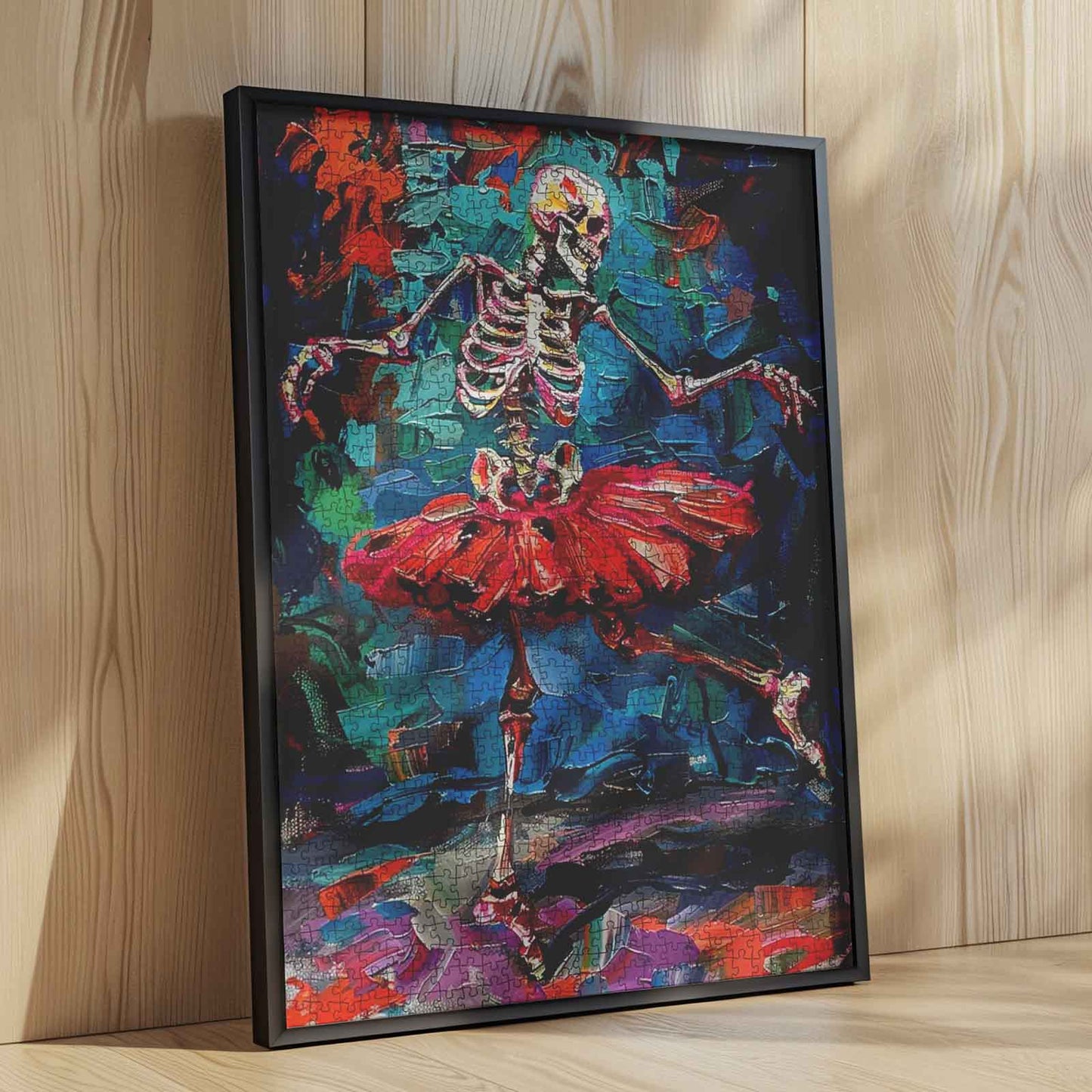 Ein kühnes Skelett, gekleidet in ein leuchtend rotes Tutu, wirbelt mit unheimlicher Anmut über die Bühne. Vor dem Hintergrund einer Explosion blauer, violetter und orangefarbener Pinselstriche pulsiert die Szene vor wilder Energie. Der skelettartige Tänzer scheint dem Tod selbst zu trotzen, in ewiger Bewegung gefangen, als tanze er für ein unsichtbares Publikum in einem vergessenen Theater. Dieses ebenso eindringliche wie faszinierende Stück verbindet gotisch-makabre Elemente mit ausdrucksstarken Farben und schafft so ein ebenso gewagtes wie schönes Puzzle.