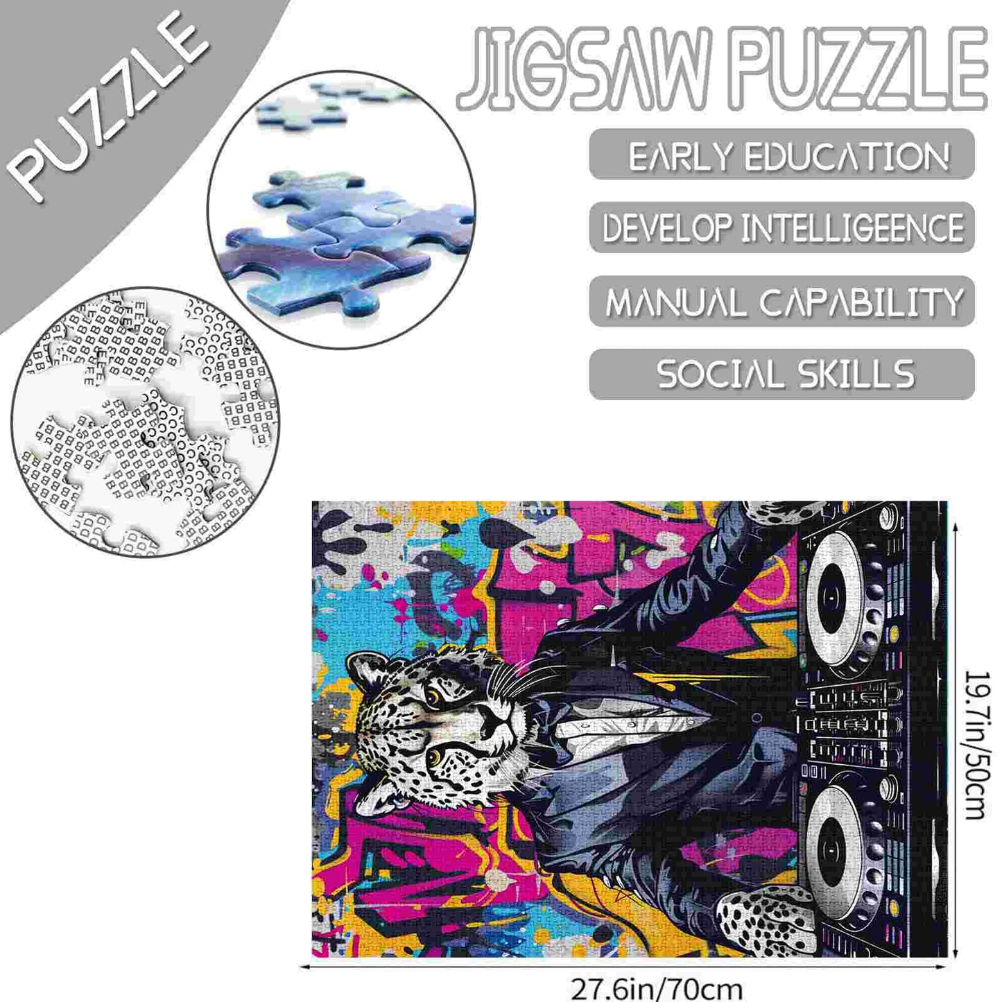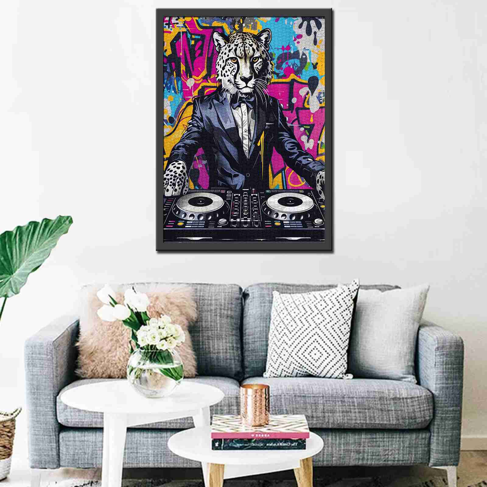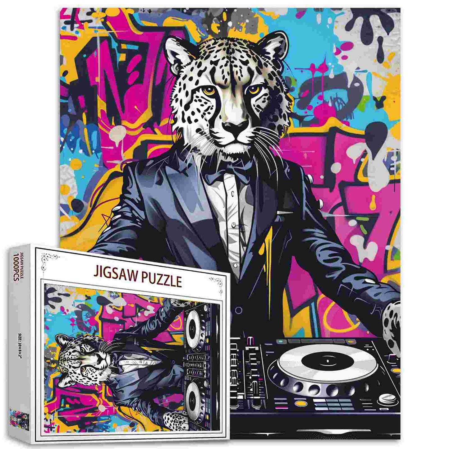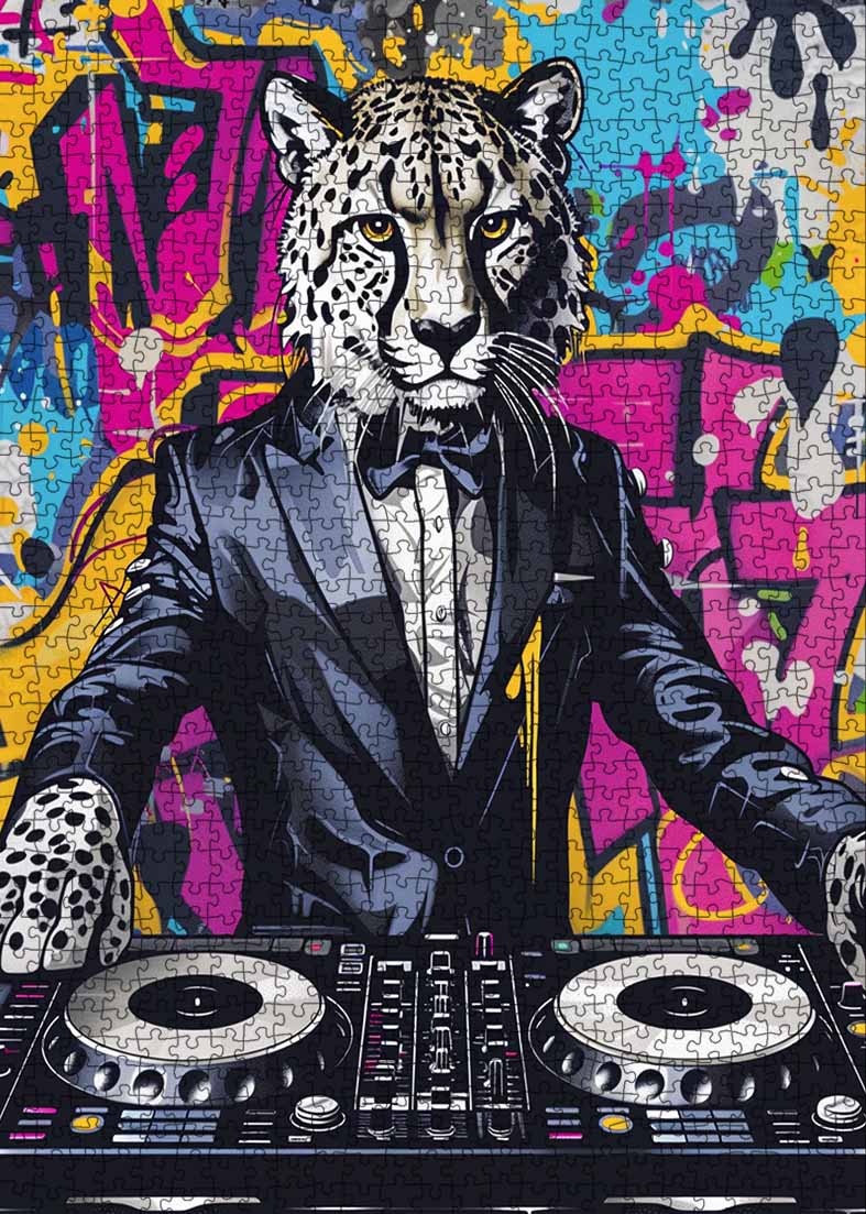 Unter Neonlichtern und explosiven Graffiti-Wänden beherrscht ein Leopard im Smoking mit müheloser Coolness die Plattenteller. Sein intensiver Blick und seine souveräne Haltung strahlen Charisma aus, während die Musik durch die Straßen pulsiert. Jedes Puzzleteil bildet diese energiegeladene urbane Szene, in der Street Art und Mode aufeinandertreffen. Ob Sie auf mutige Bilder oder den wilden Katzenstil stehen, dieses Puzzle bietet ein unvergessliches Erlebnis voller Rhythmus und Farbe.