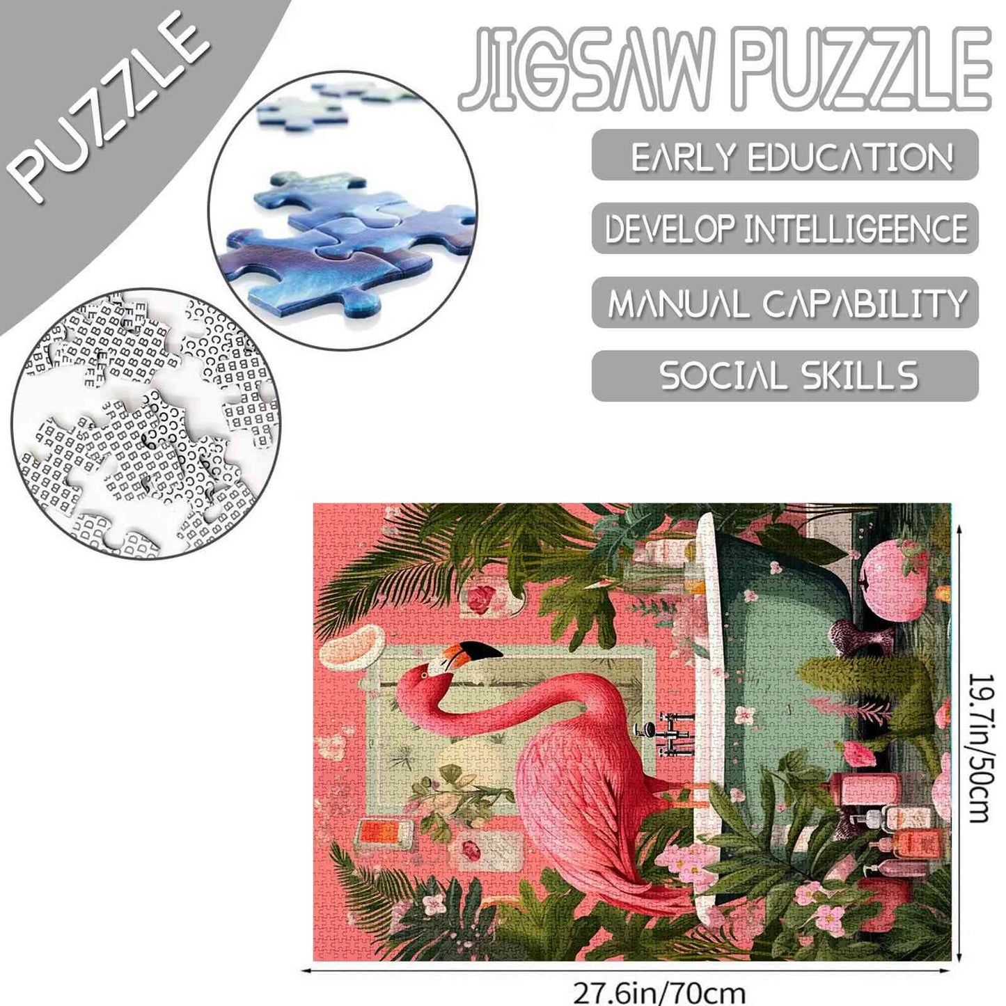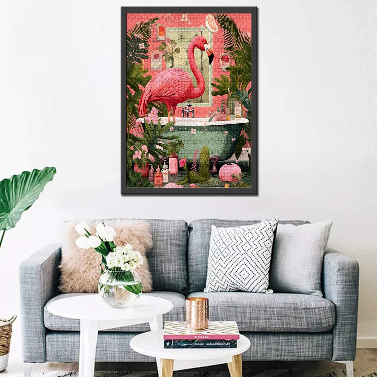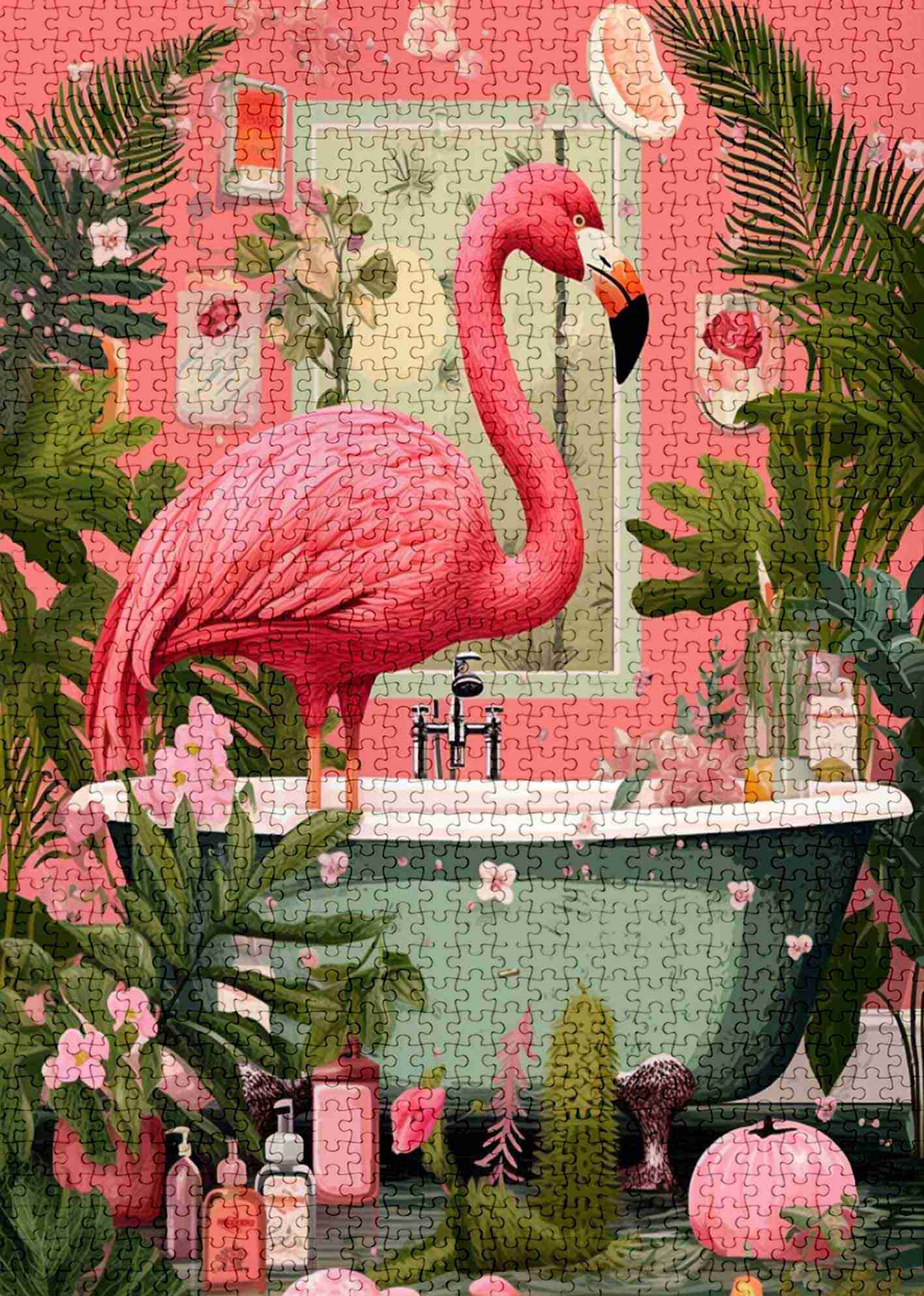 Ein verspielter rosa Flamingo balanciert neben einer Vintage-Badewanne, umgeben von üppigen tropischen Pflanzen und skurrilem Dekor. Mit leuchtenden Grün- und zarten Rosatönen und aufwendigen Details in jeder Ecke bringt dieses Puzzle Humor und Charme in Ihre Puzzlezeit. Es ist, als würde man ein skurriles Spa betreten, das tief im Dschungel versteckt ist – erfrischend, unerwartet und ein herrlicher Spaß beim Zusammensetzen.