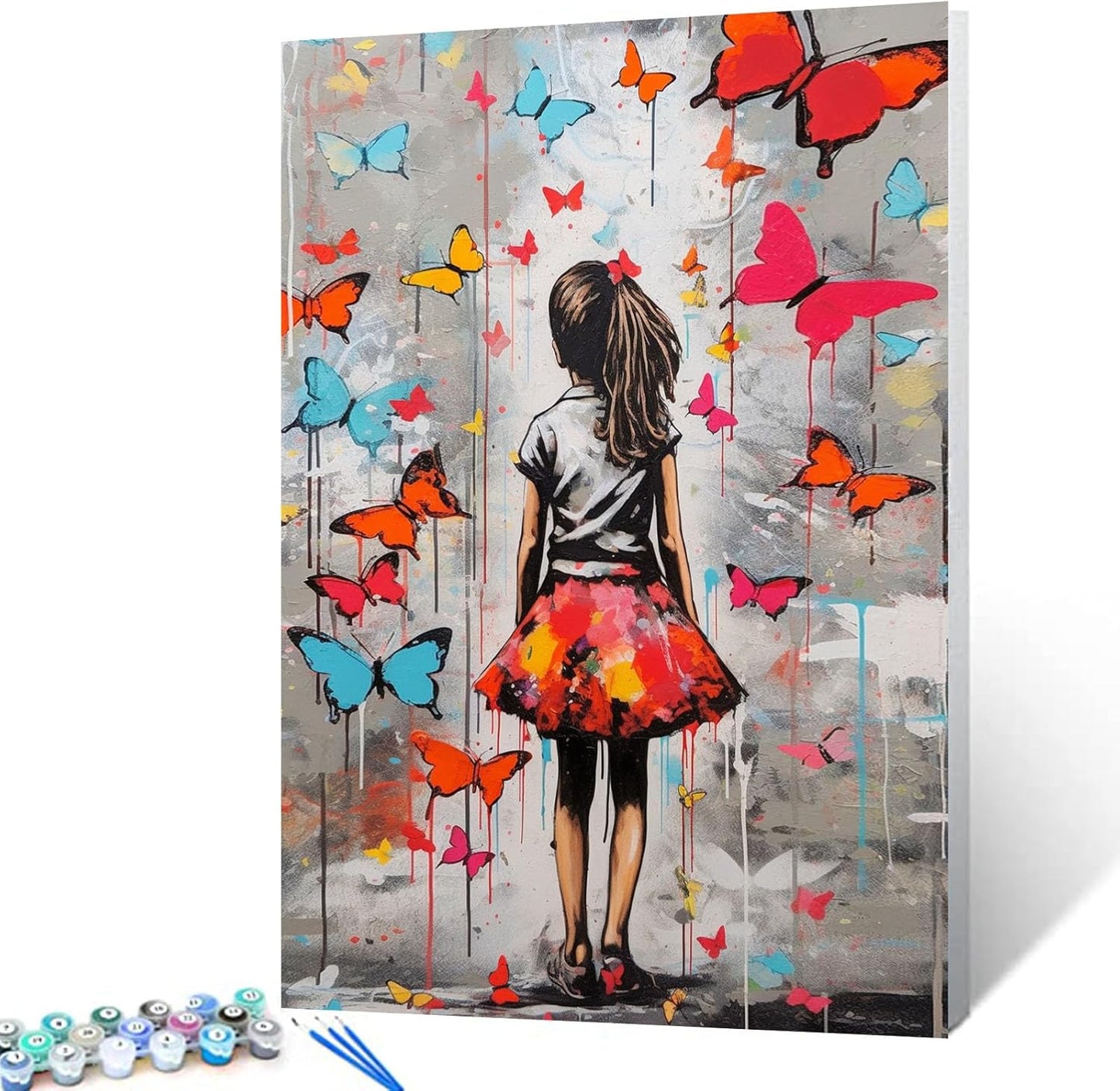 Graffiti-Mädchen umgeben von bunten Schmetterlingen Malen nach Zahlen