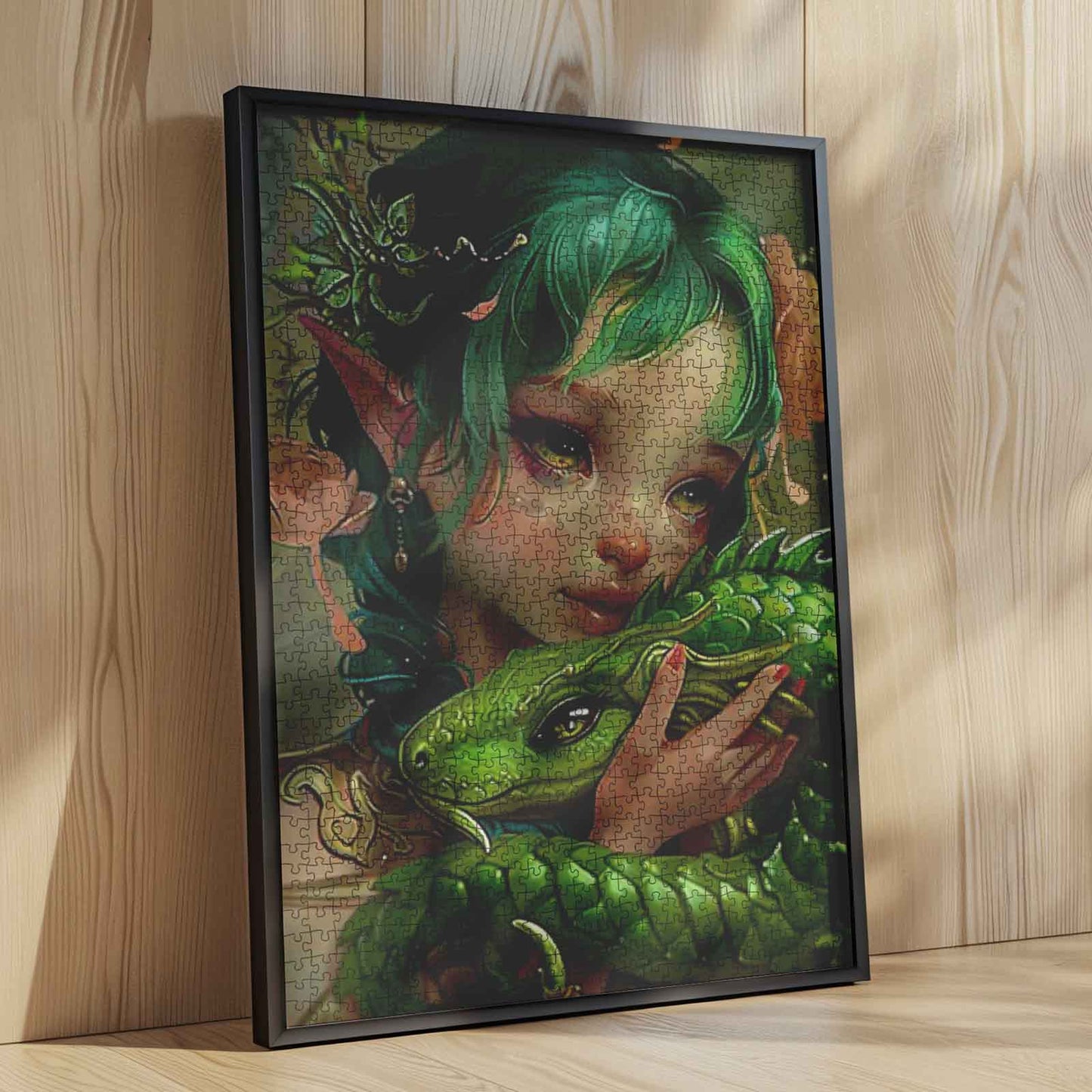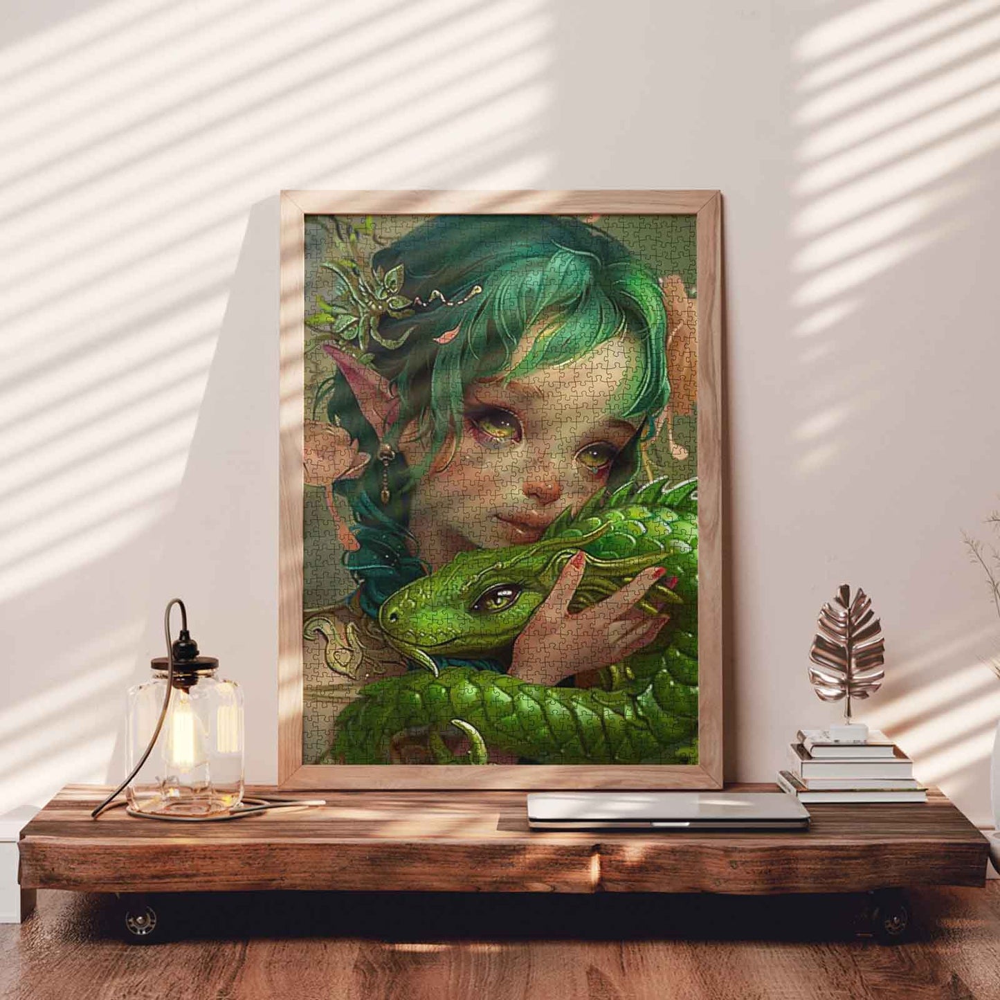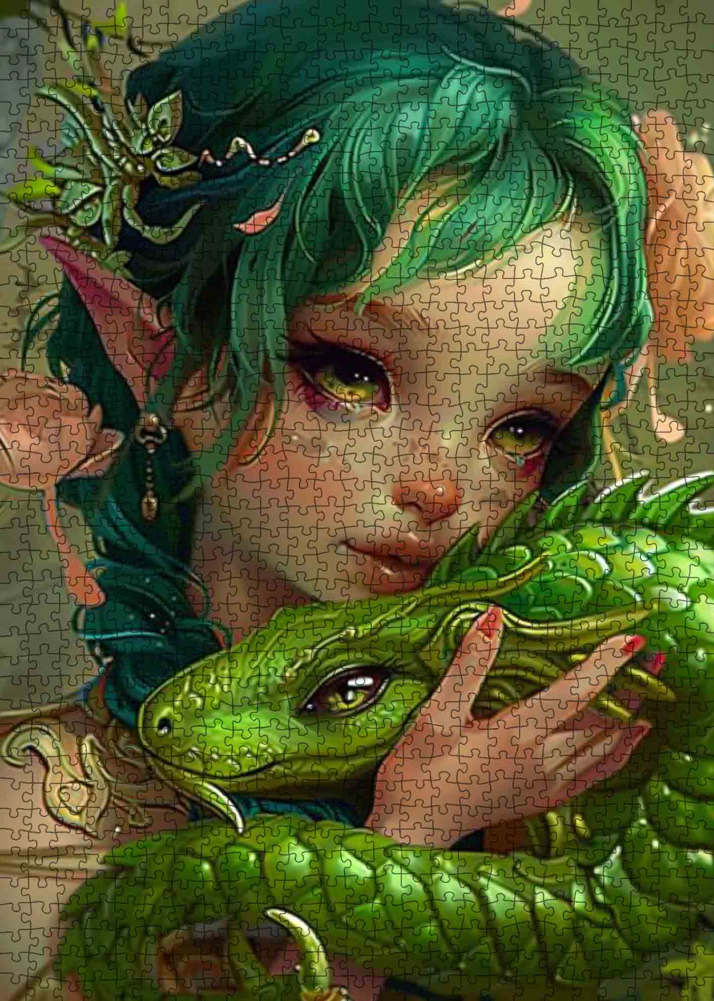 In einer magischen Welt, in der Fantasie auf Schönheit trifft, wiegt ein grünhaariges Mädchen liebevoll einen kleinen Drachen und symbolisiert damit die unzerbrechliche Verbindung zwischen Natur und Fabelwesen. Die zarten, lebensechten Gesichtszüge des Mädchens und des Drachens werden von sanftem Licht erhellt und erzeugen eine bezaubernde Aura. Die leuchtenden Grüntöne und die bezaubernden Augen des Mädchens machen dieses Puzzle zu einer reizvollen Herausforderung für Liebhaber, die sowohl Fantasy-Kunst als auch den beruhigenden Prozess des Puzzelns schätzen. Mit jedem platzierten Teil werden Sie Teil dieser mystischen Verbindung. Dieses Puzzle lässt Sie nicht nur entspannen, sondern erweckt auch eine Szene voller Schönheit und Magie zum Leben – perfekt für alle, die einen Hauch von Fantasie in ihrer Kunstsammlung lieben.