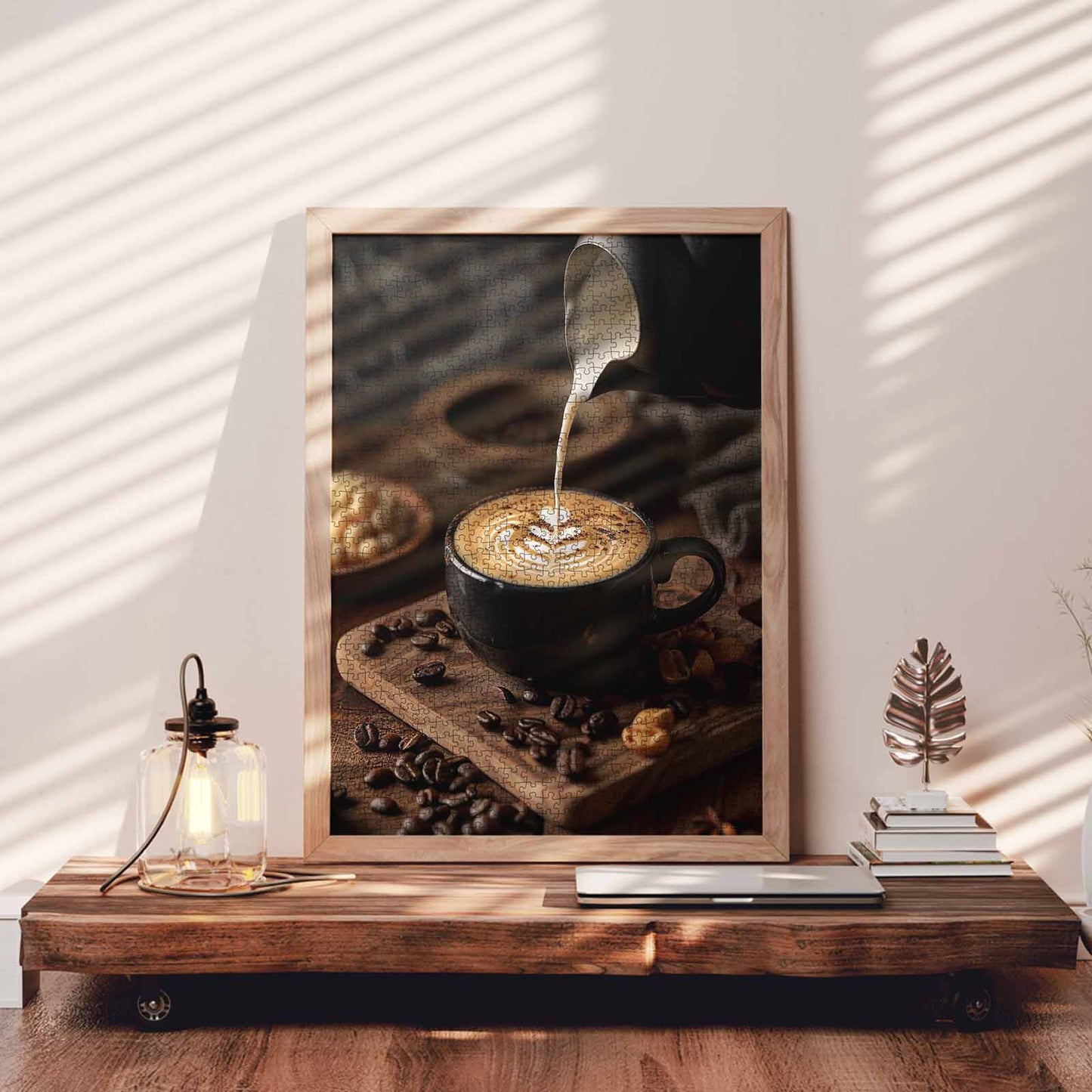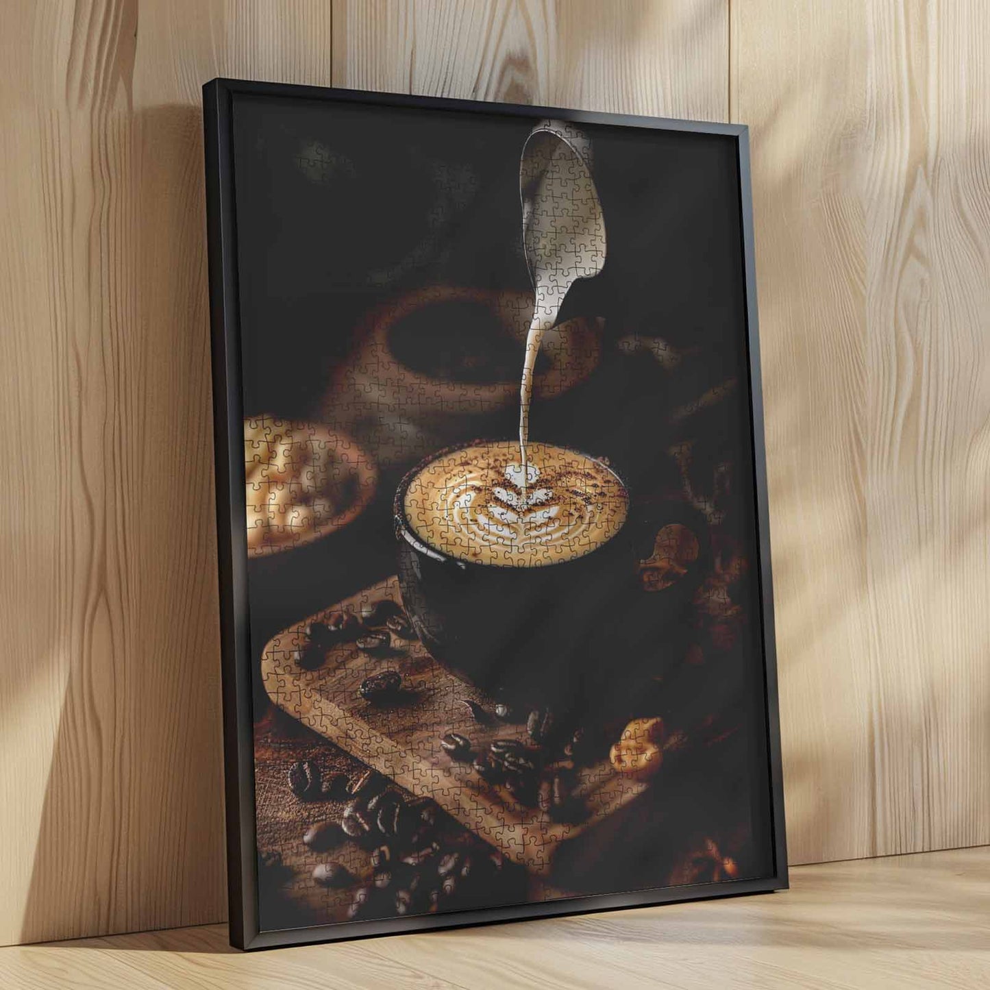 Tauchen Sie mit diesem fesselnden Puzzle in die Wärme der Kaffeekultur ein. Mit einem cremigen Latte, gekrönt mit eleganter Schaumkunst, umgeben von reichhaltigen, aromatischen Kaffeebohnen auf einem rustikalen Holzbrett, verbindet dieses Puzzle Kunstfertigkeit mit Entspannung. Perfekt für Kaffeeliebhaber und Puzzle-Enthusiasten gleichermaßen.