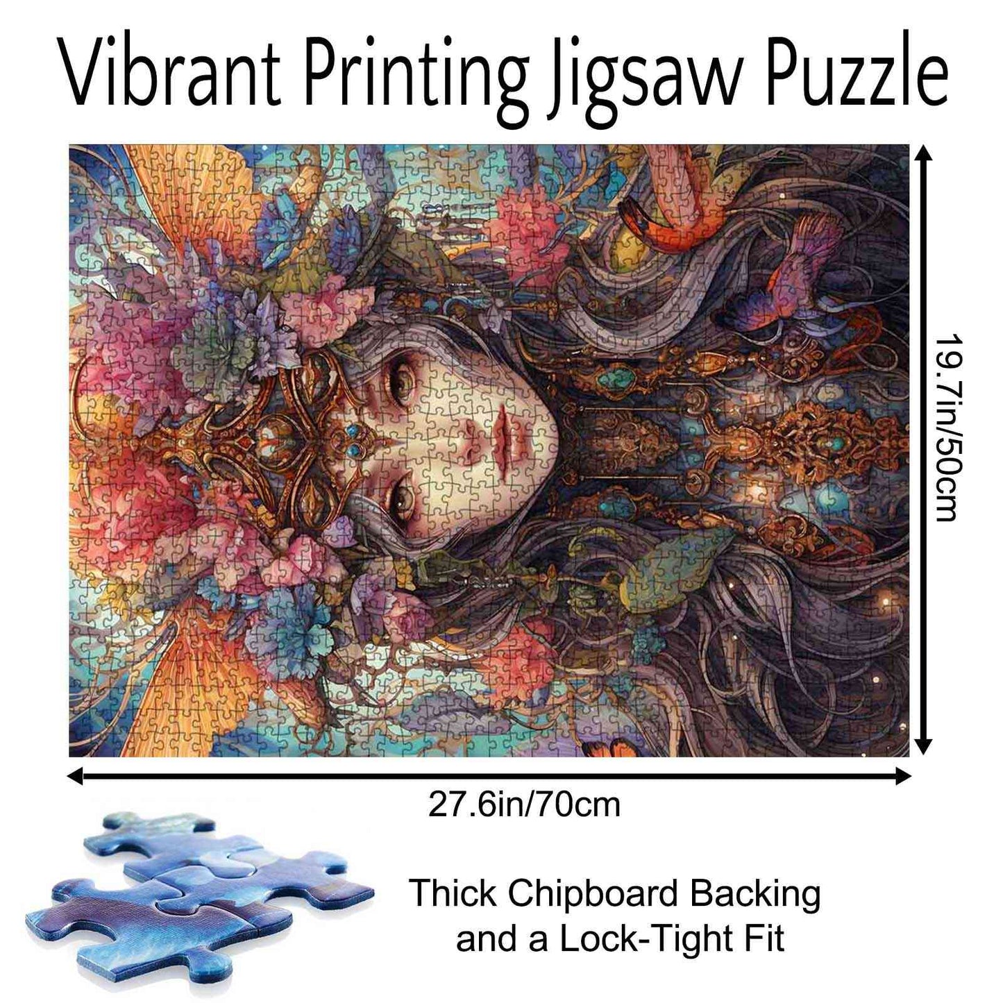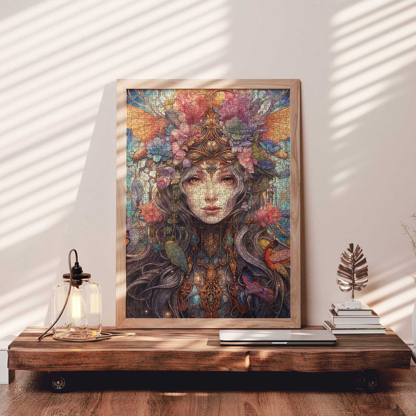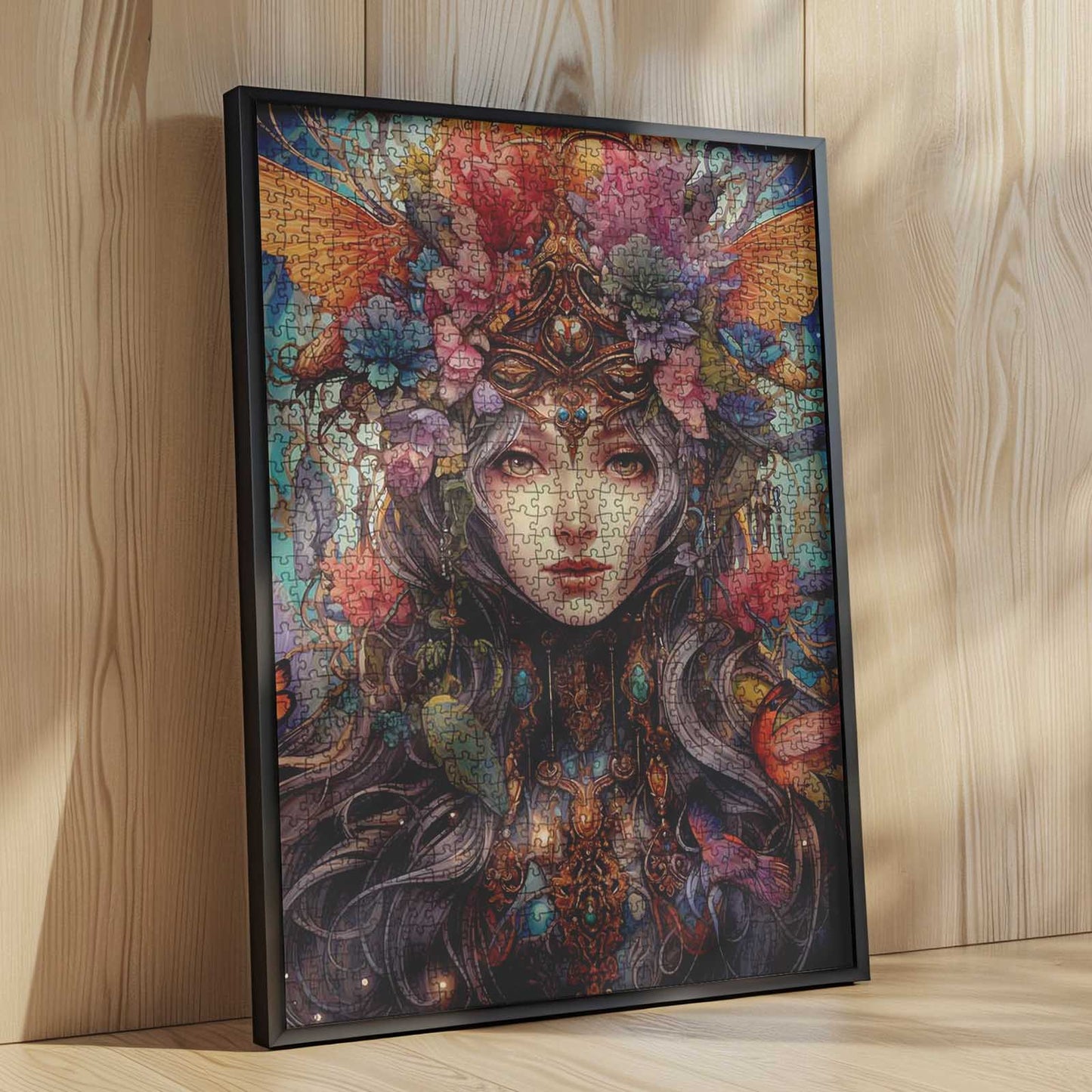 Entdecken Sie den fesselnden Charme einer Feenkönigin mit einem farbenfrohen Blumenkopfschmuck und aufwendigem Schmuck. Ihr faszinierender Blick und ihre detailreiche Kleidung machen jedes Puzzleteil zu einer Reise in ein Reich der Fantasie und Eleganz, perfekt für Kunst- und Puzzleliebhaber gleichermaßen.
