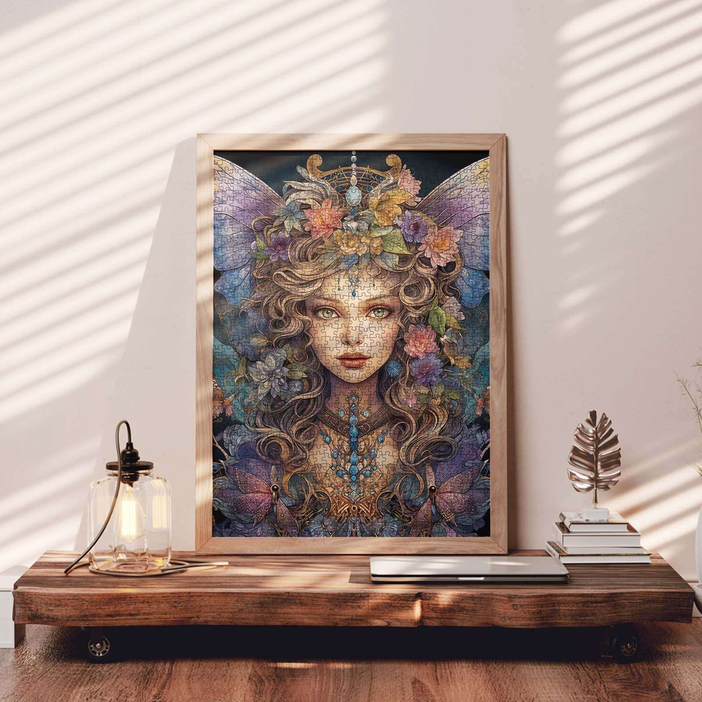 Entdecken Sie den Zauber einer majestätischen Feenkönigin, die mit einer juwelenbesetzten Krone geschmückt und von zarten Blumen und Schmetterlingsflügeln umgeben ist. Ihr faszinierender Blick und die komplizierten Details machen dieses Puzzle zu einer fesselnden Reise in eine Welt der Fantasie und Schönheit.