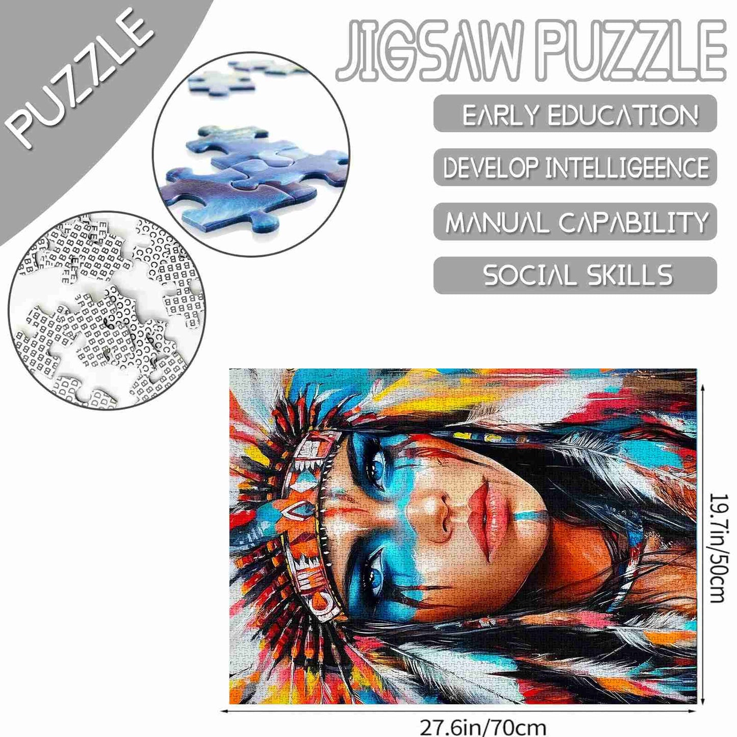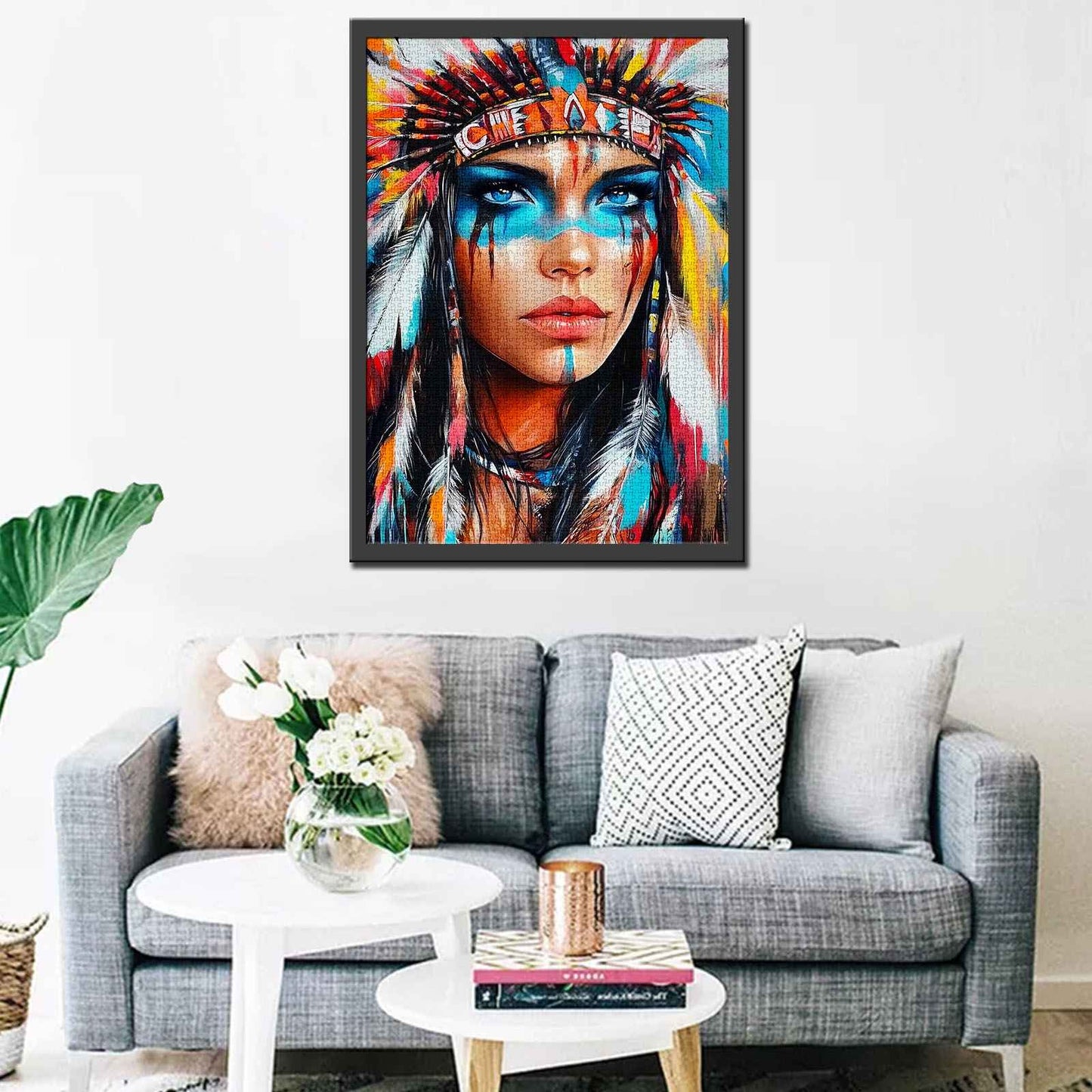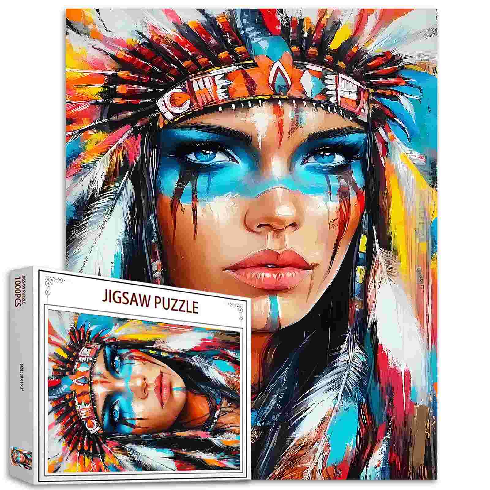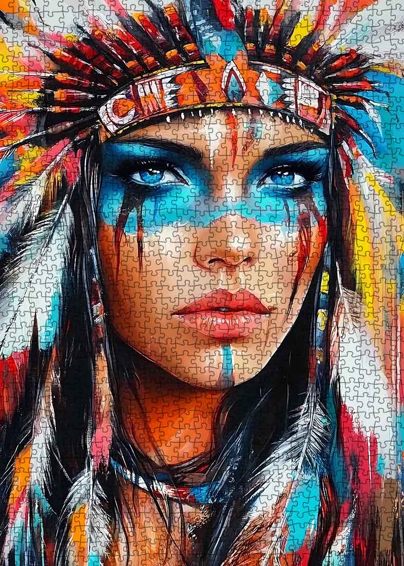 Tauchen Sie ein in die kühne Kunst dieses fesselnden Puzzles mit einer wilden indianischen Kriegerin. Ihre durchdringenden blauen Augen und ihre kräftige Gesichtsbemalung drücken Stärke und kulturellen Stolz aus. Dieses Puzzle ist mit aufwendigen Stammesfedern und auffälligen Farben geschmückt und bietet eine spannende Herausforderung, während es gleichzeitig Tradition und Geist feiert. Perfekt für Puzzle-Fans, die ein inspirierendes und künstlerisches Erlebnis suchen.
