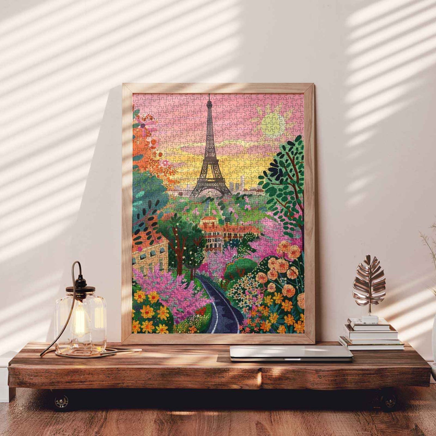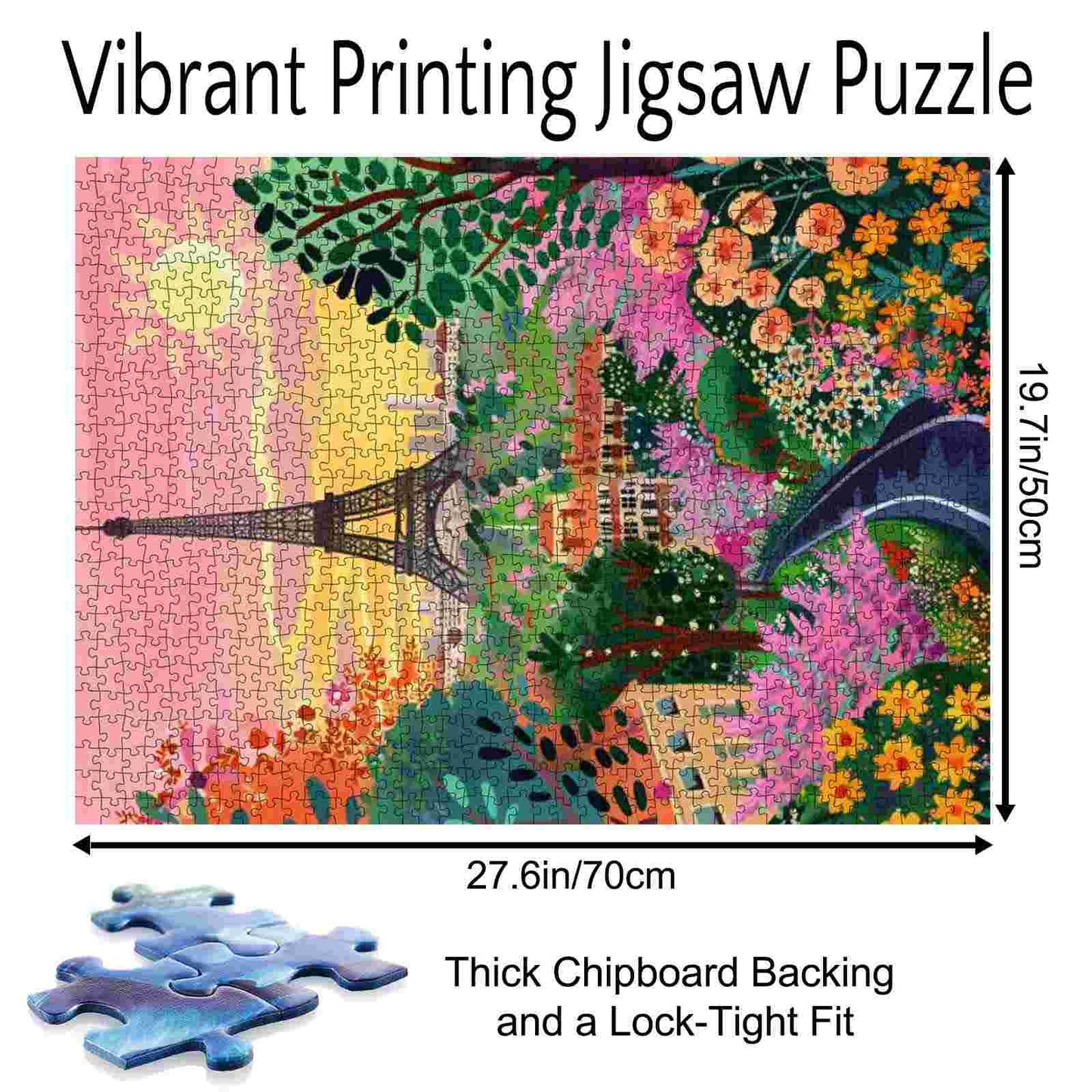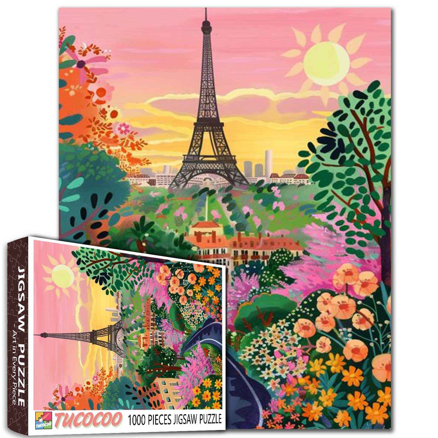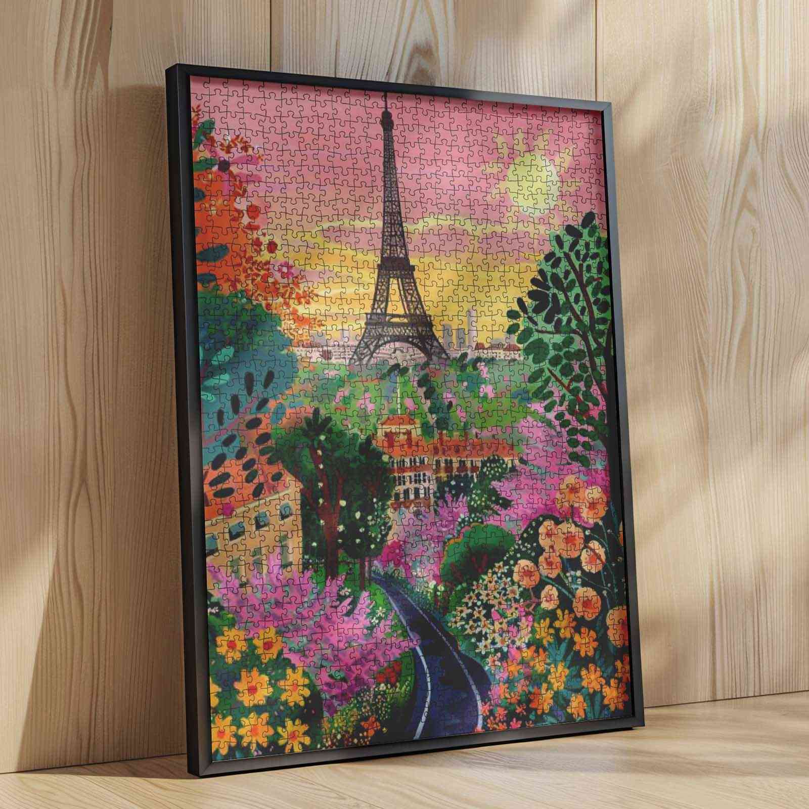 Inmitten eines leuchtenden Blütenmeers erhebt sich der Eiffelturm anmutig unter einem pastellfarbenen Sonnenuntergangshimmel. Ein charmantes Dorf schmiegt sich zwischen blühenden Bäumen, deren Farben vor Freude sprühen – Rosa, Gelb und Orange tanzen unter der warmen Sonne. Die gewundene Straße lädt zu einem Spaziergang durch diese verträumte Szenerie ein, in der jedes Detail die Romantik und Laune des Pariser Frühlings ausstrahlt. Stück für Stück wird das Puzzle zu einem Fest der Farben, der Natur und des zeitlosen Pariser Charmes.